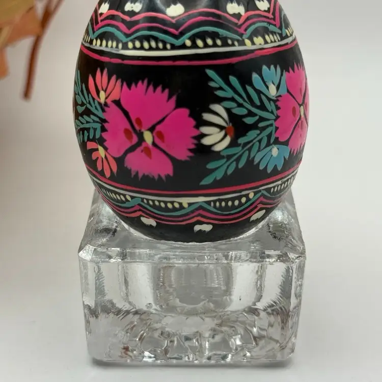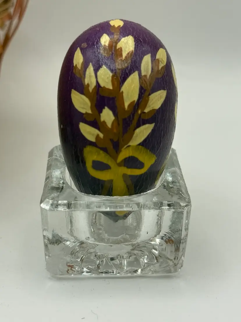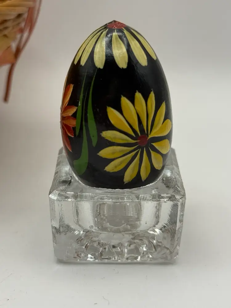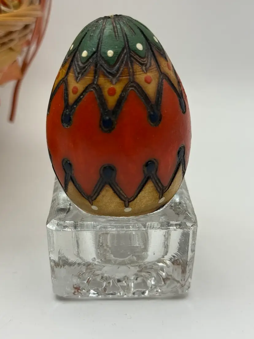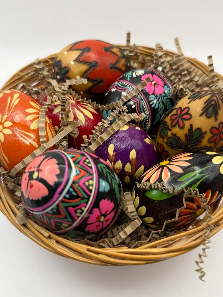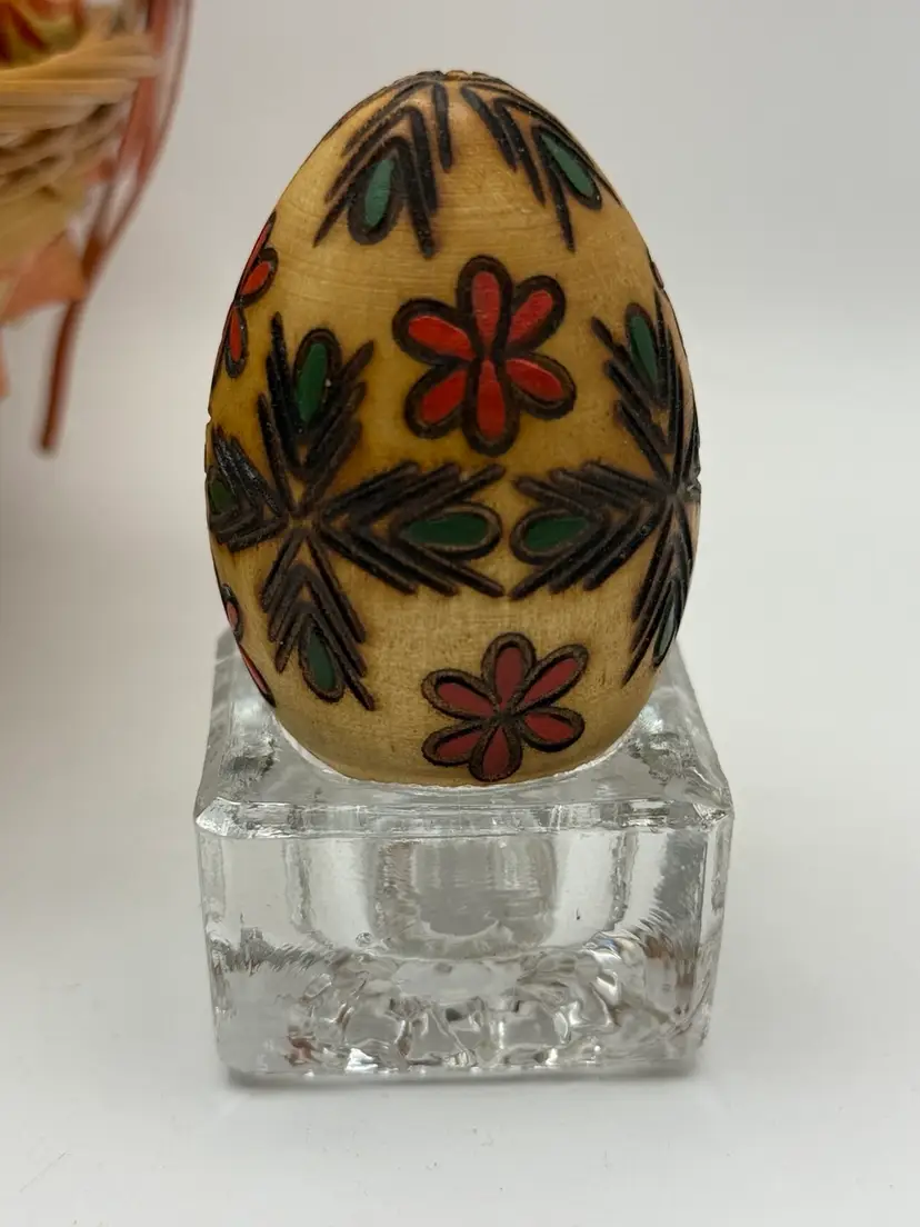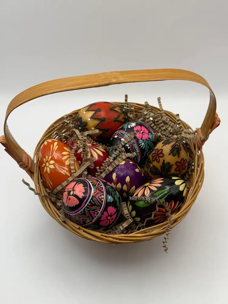 This listing includes basket and eight wooden Polish eggs in a variety of designs and colors. All in great condition. Basket - 7” wide 7” tall Eggs average 2”