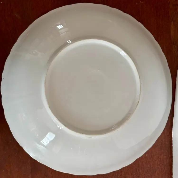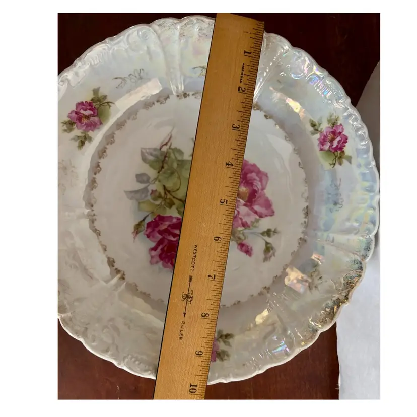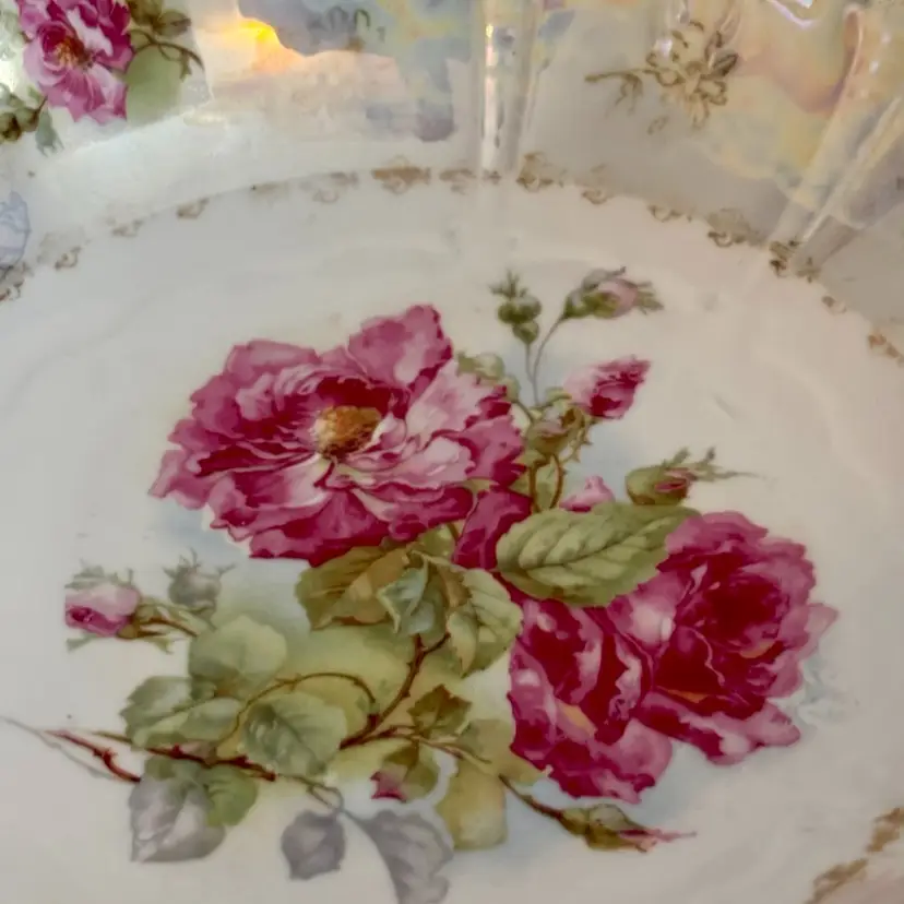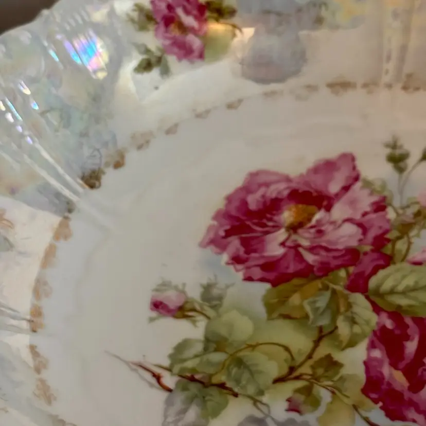 Approx. 10” Vintage Bavaria Germany porcelain serving plate from the mid-20th century, featuring a hand painted floral pattern in a pink rose design with a fluted and molded edge. Made in a region of Bavaria Germany renowned for its porcelain production