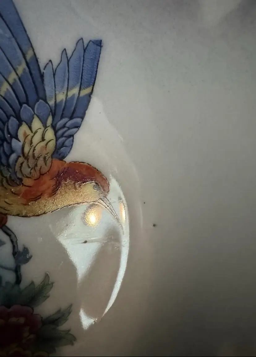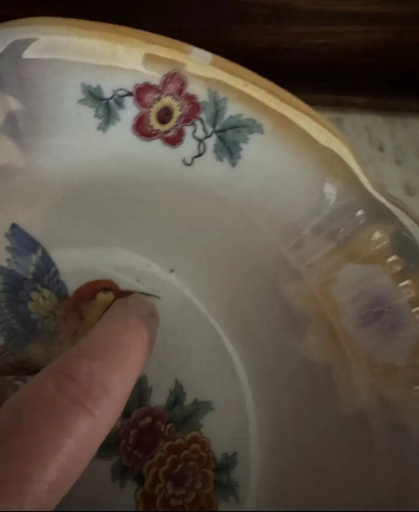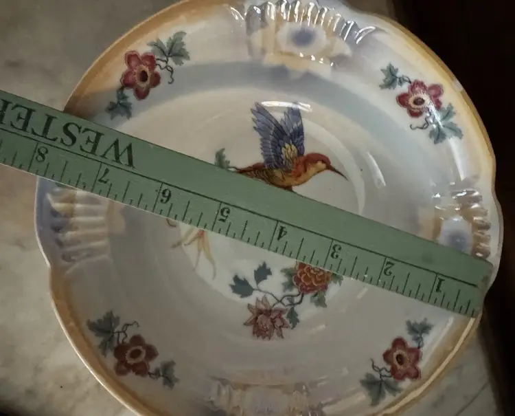 The Vintage Bavaria Hummingbird Serving Bowl features a beautiful luster ware rim and a charming hummingbird pattern, typical of Bavarian craftsmanship from the 1940s. Made of porcelain in Germany, this original piece showcases intricate details and vibrant colors, making it a unique addition to any collection of decorative cookware, dinnerware, and serveware. With its vintage appeal and stunning design, this serving bowl captures the essence of the flower and bird motifs popular during that time period. There is a small defect in the porcelain that I have pictured.
