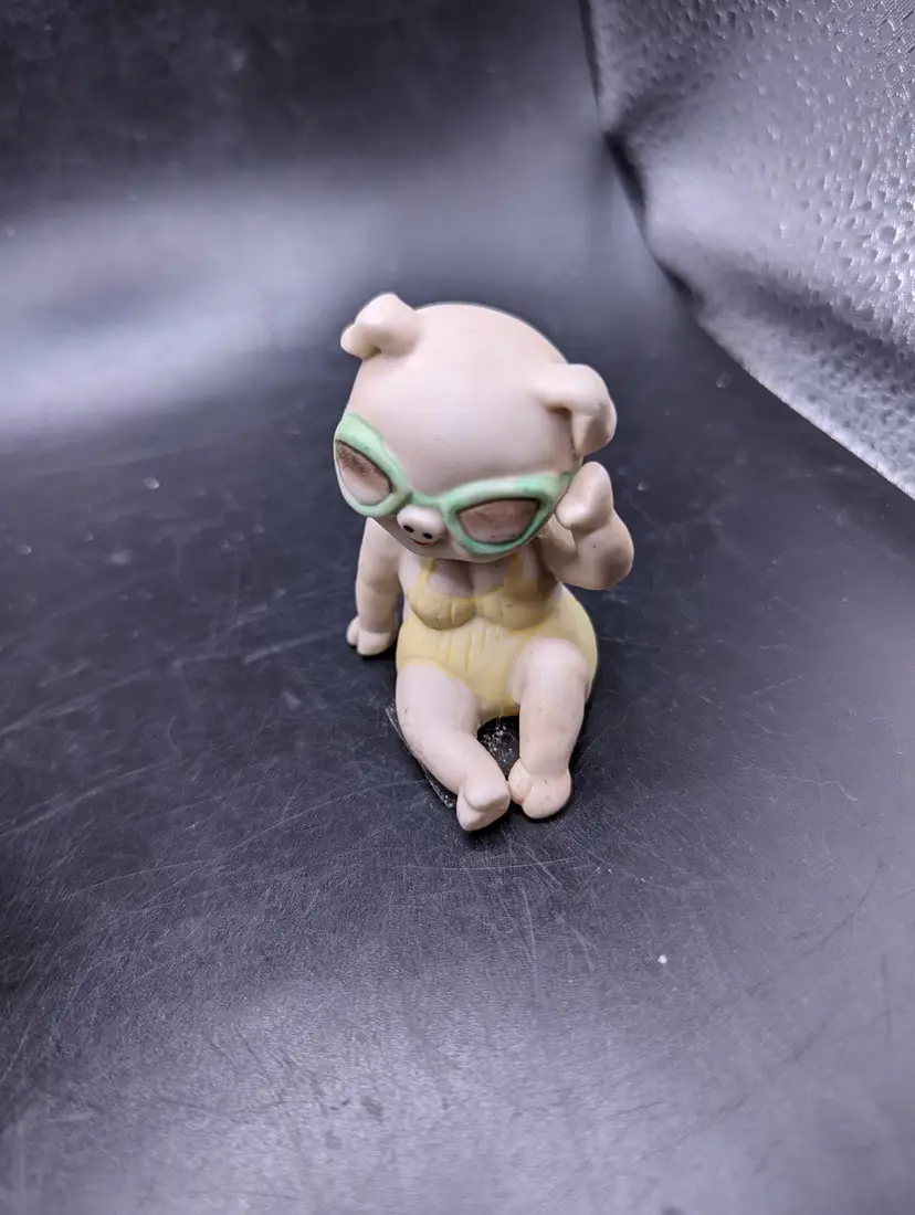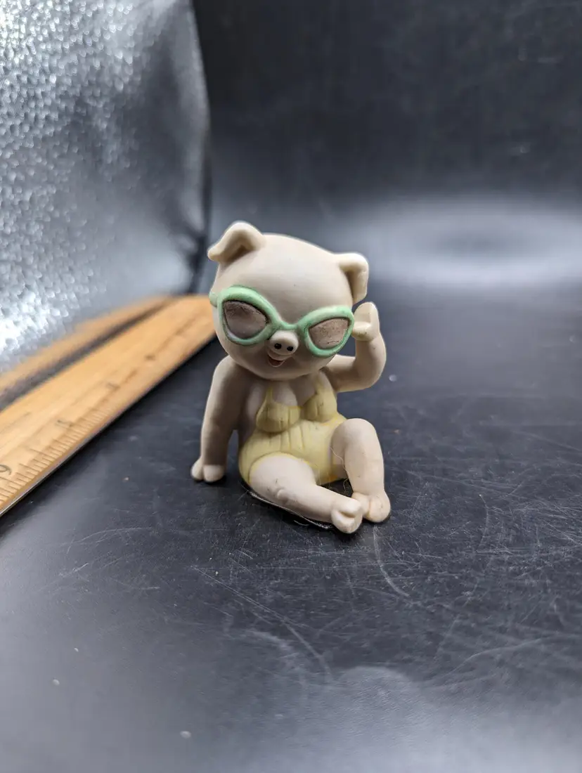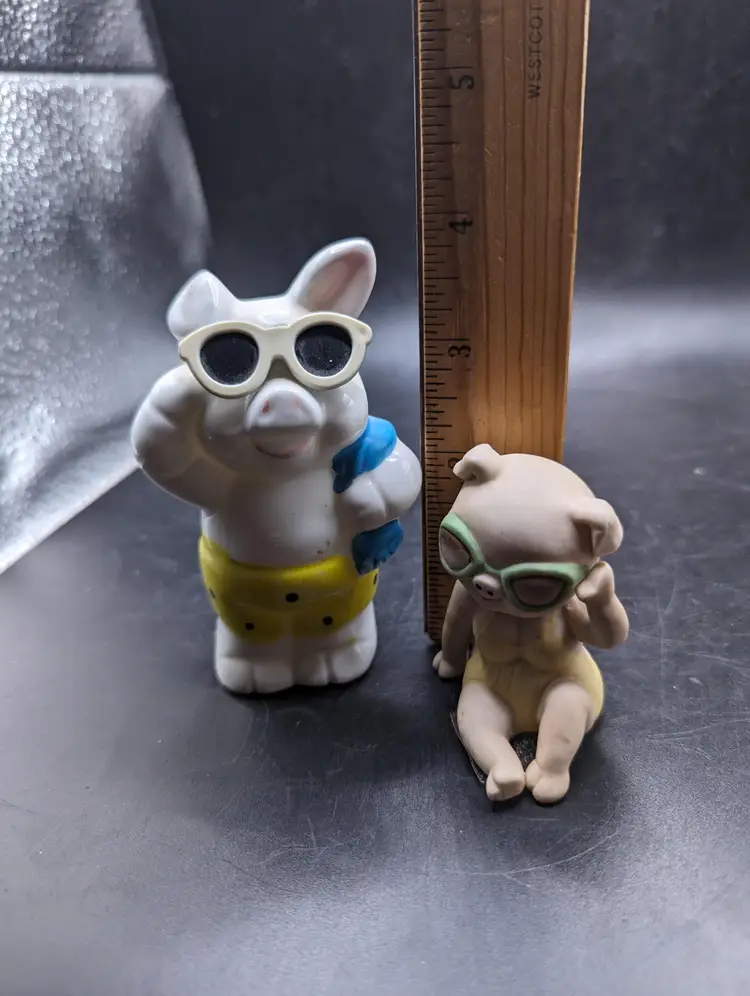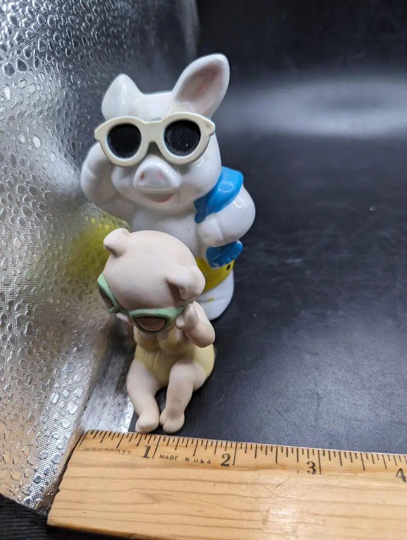 Adorable set of vintage pig figurines dressed for the beach, complete with sunglasses and swimsuits. Perfect for adding a touch of whimsy to your collection. Please see all pictures for condition and measurements.
