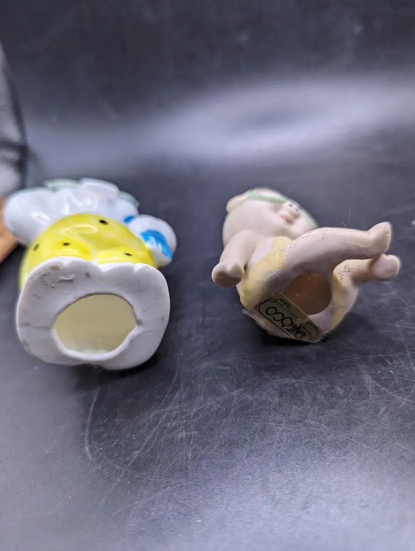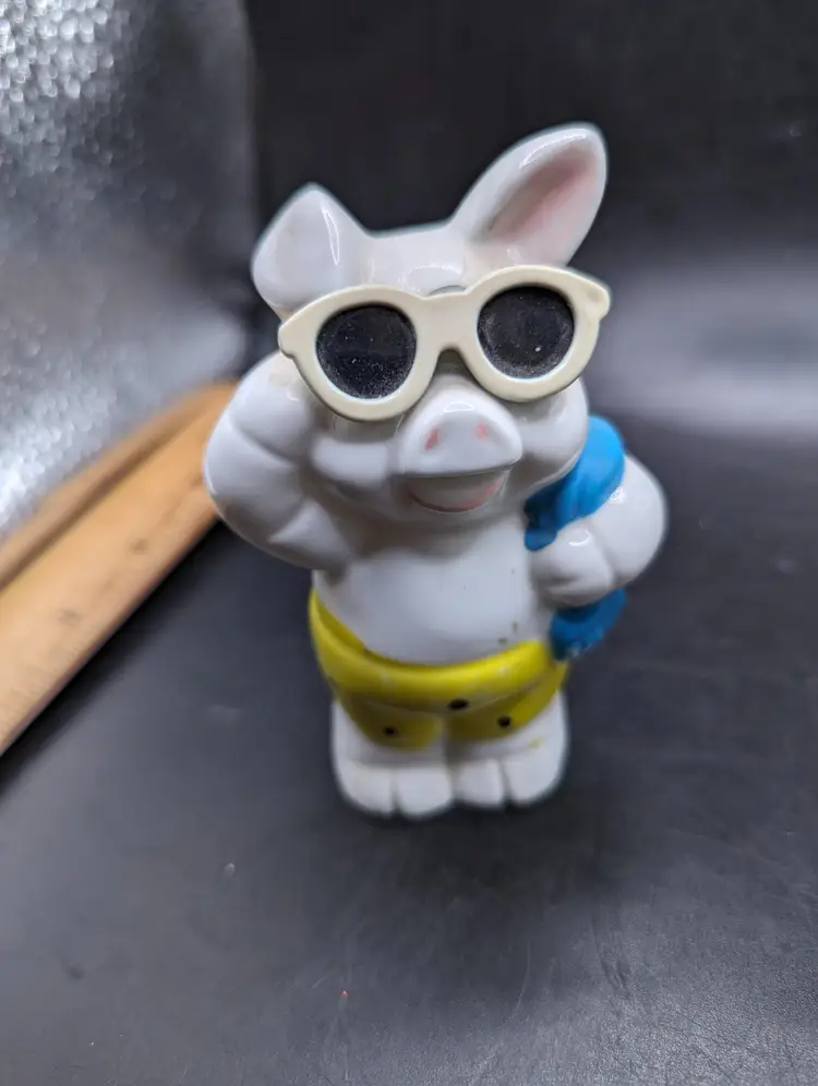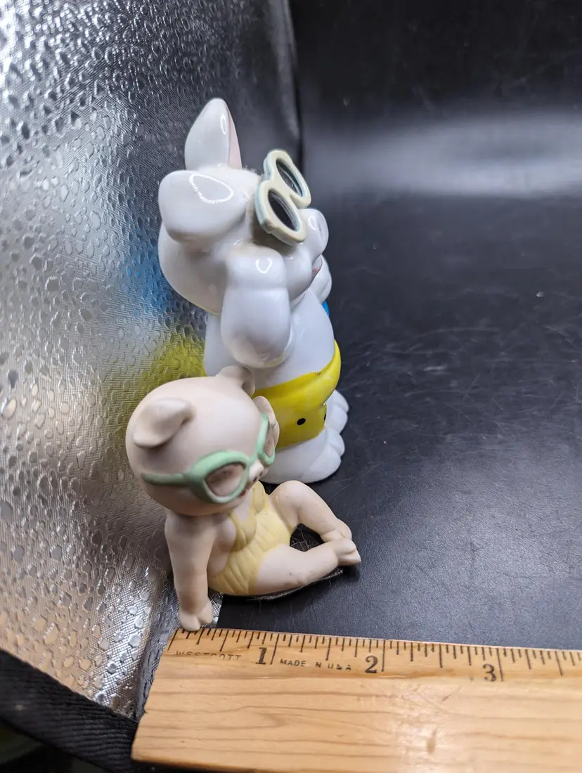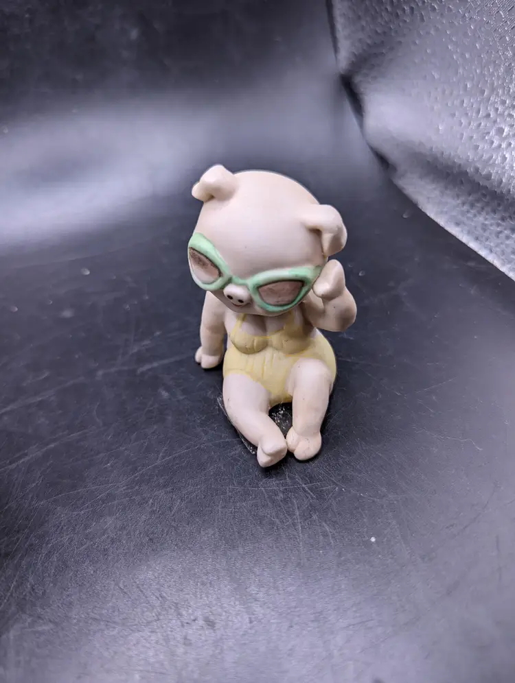 Adorable set of vintage pig figurines dressed for the beach, complete with sunglasses and swimsuits. Perfect for adding a touch of whimsy to your collection. Please see all pictures for condition and measurements.