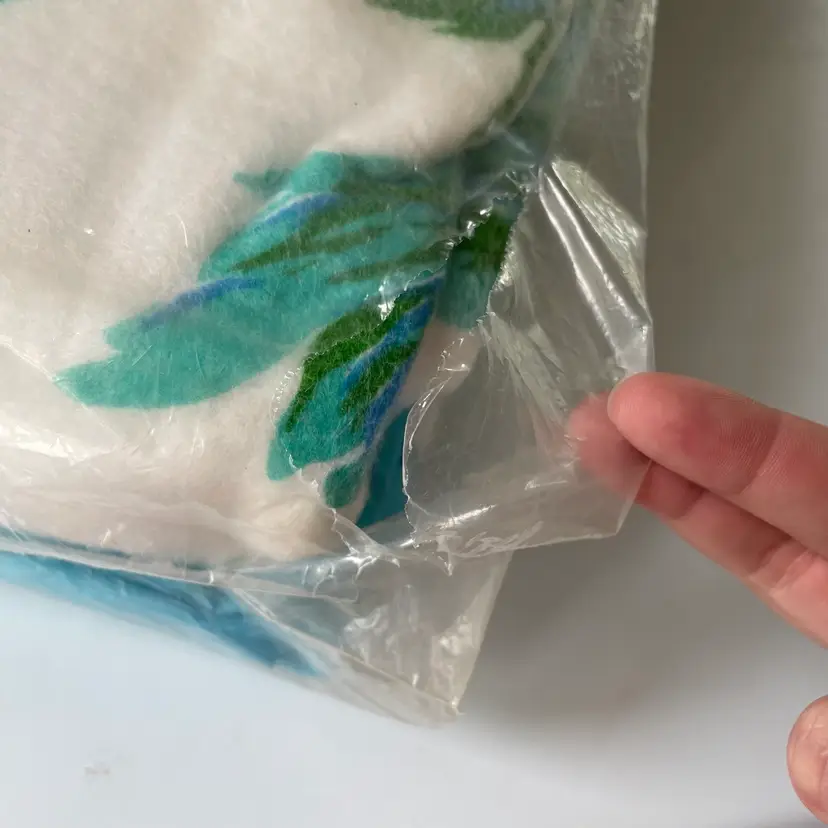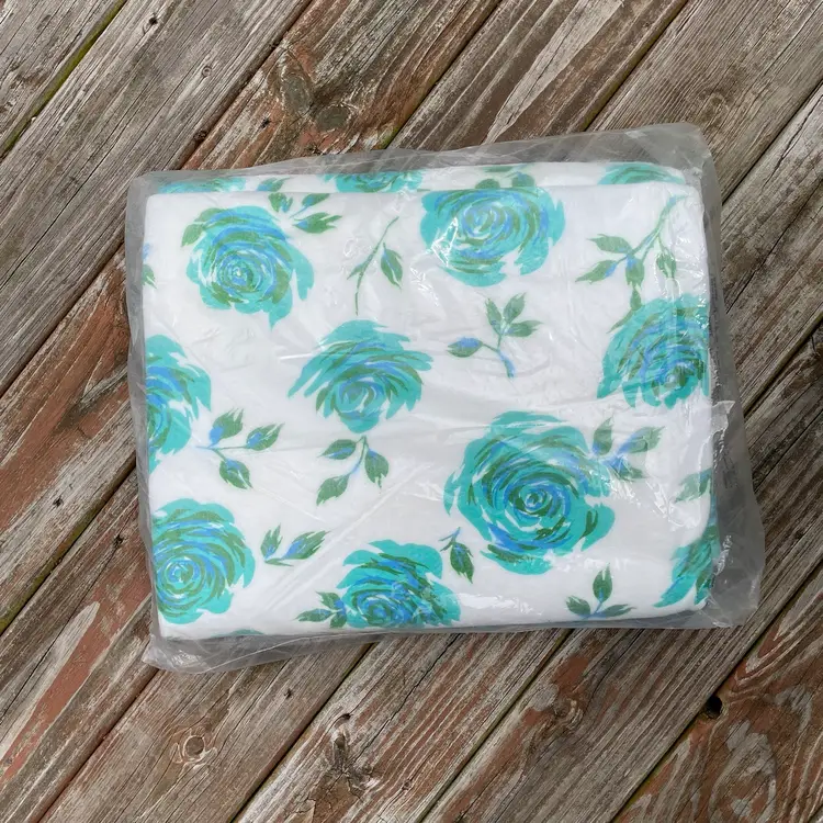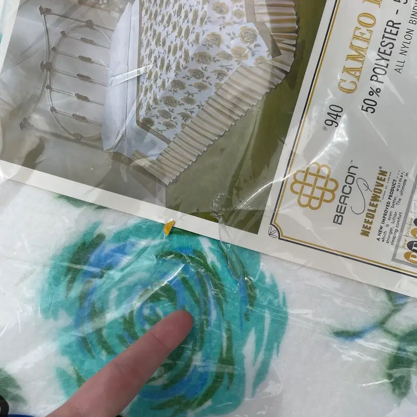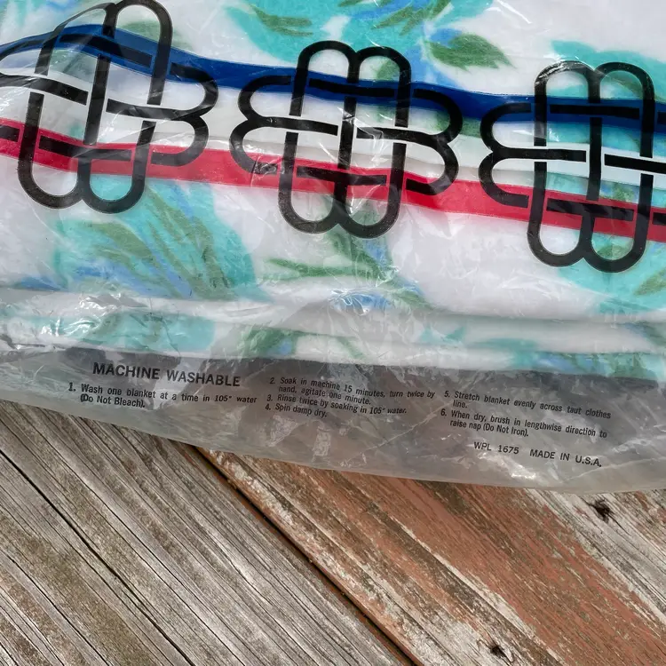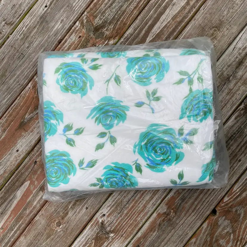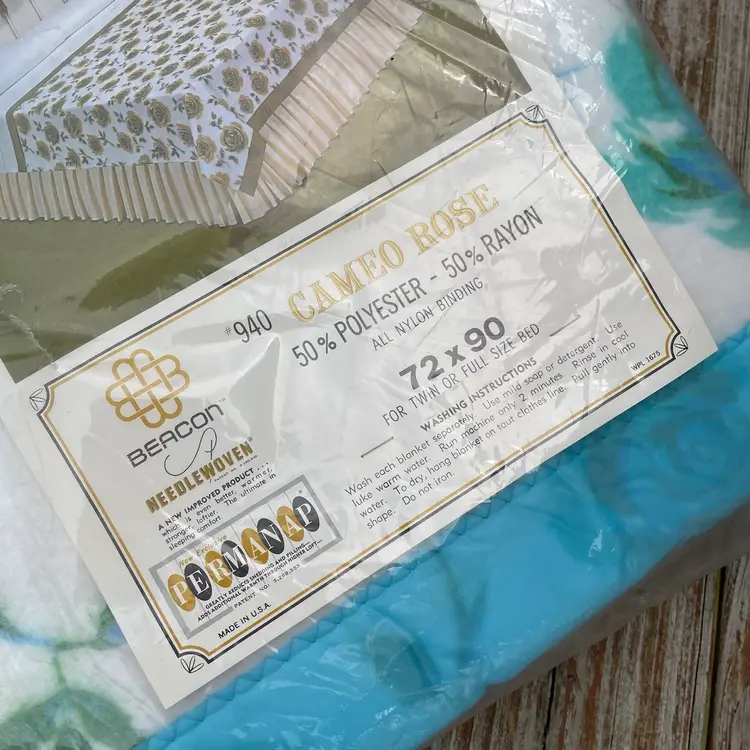 Vintage Beacon Blue Cameo Rose New Old Stock Blanket. Marked for a twin or full, 72 x 90. Still new in original package. Package shows some wear from age and has a few holes but blanket seems fine.