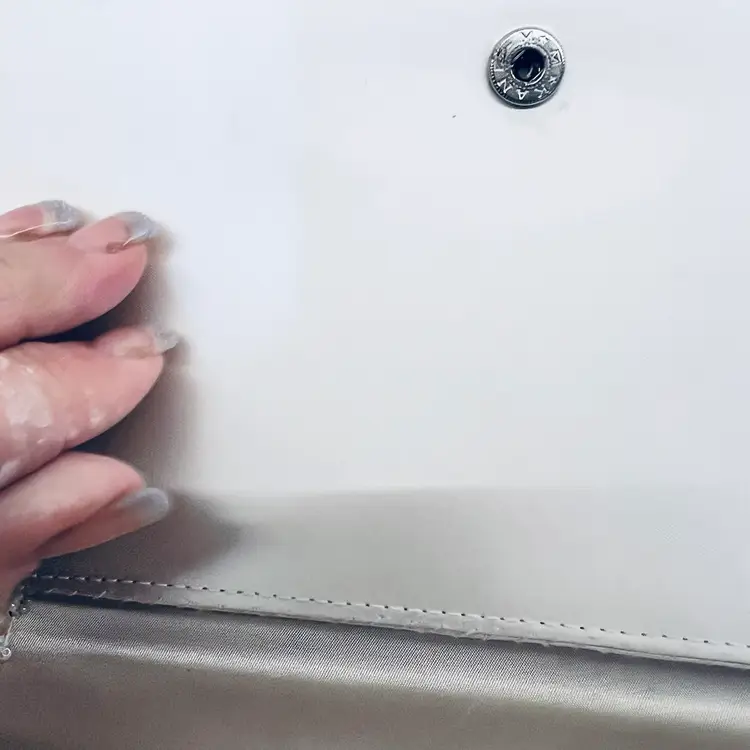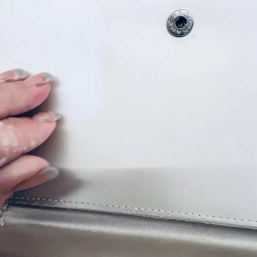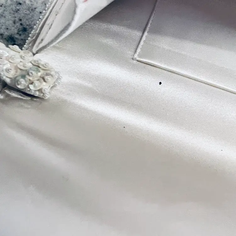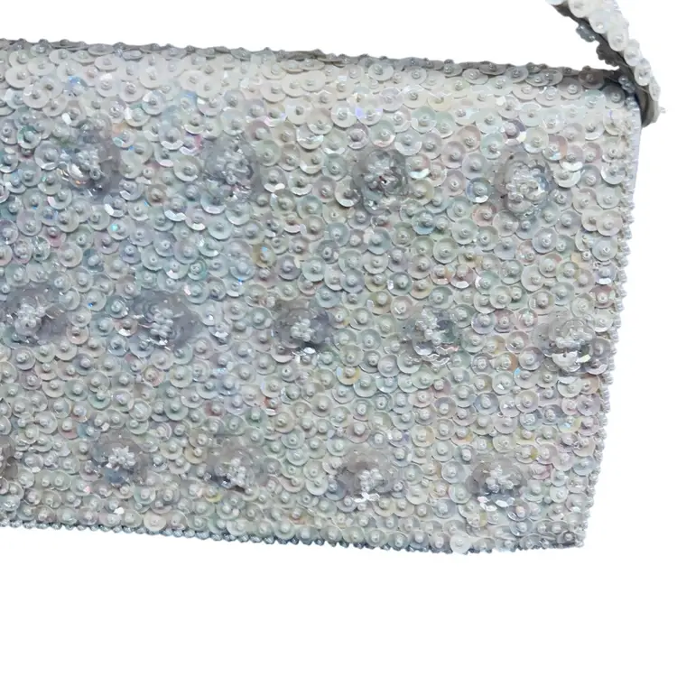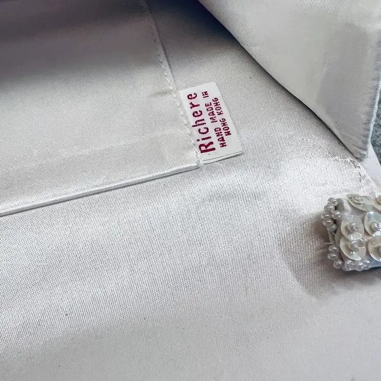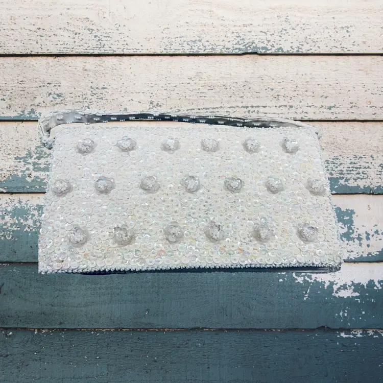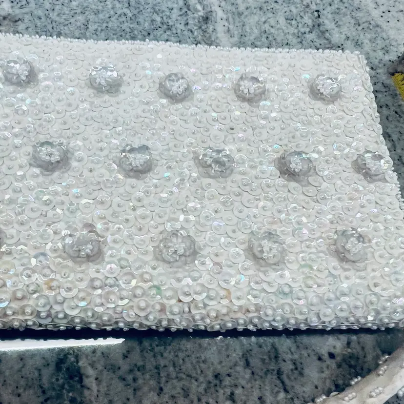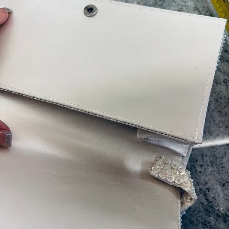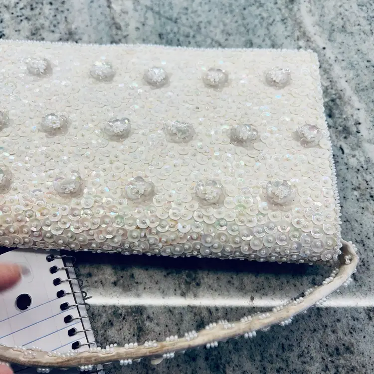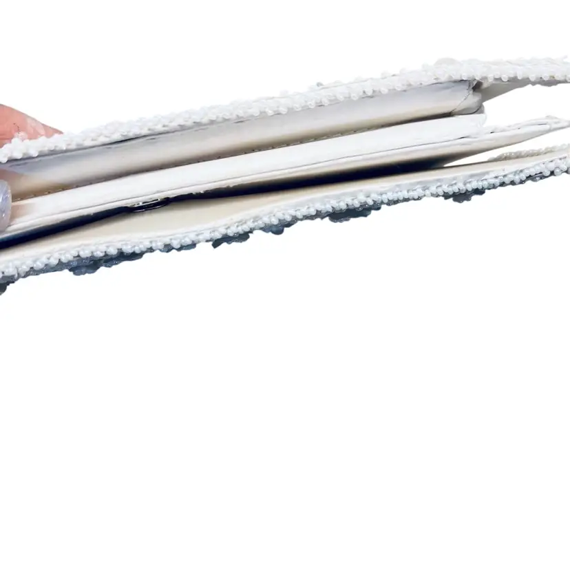 In good condition Approx 9” long 5” wide beaded White with satin lining Made in Japan