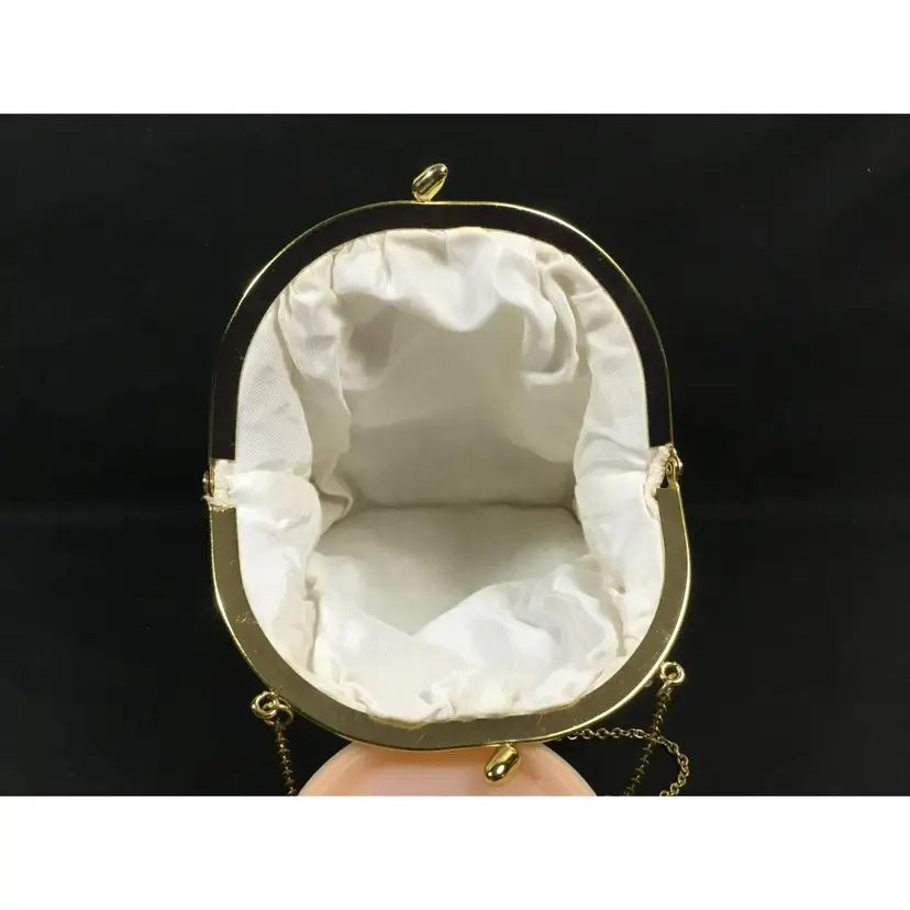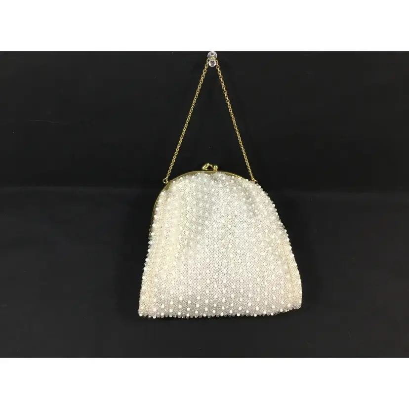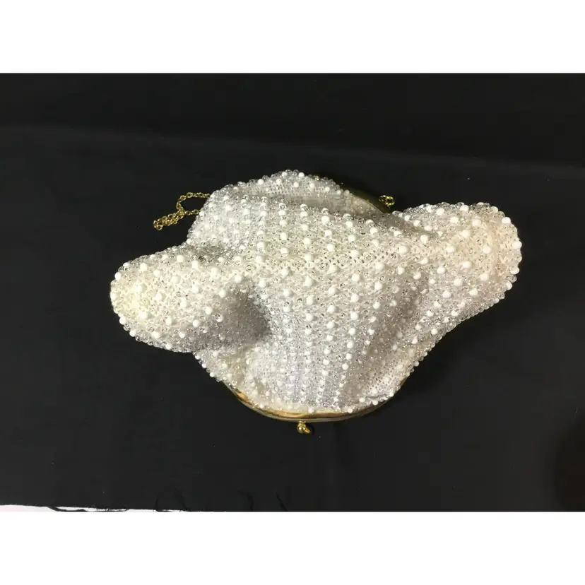 6.75 " side to side by 6.75" deep by 2.5 inch wide. lightweight white beaded outer mesh fabric, solid white fabric lining. Gold tone metal clasp closure and 11" gold tone metal chain. Beads are acrylic. Fabric unknown, excellent condition