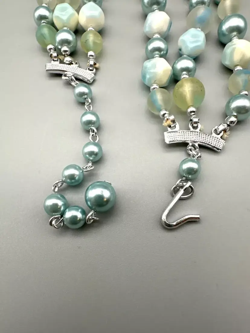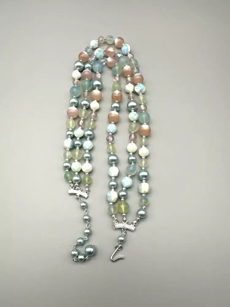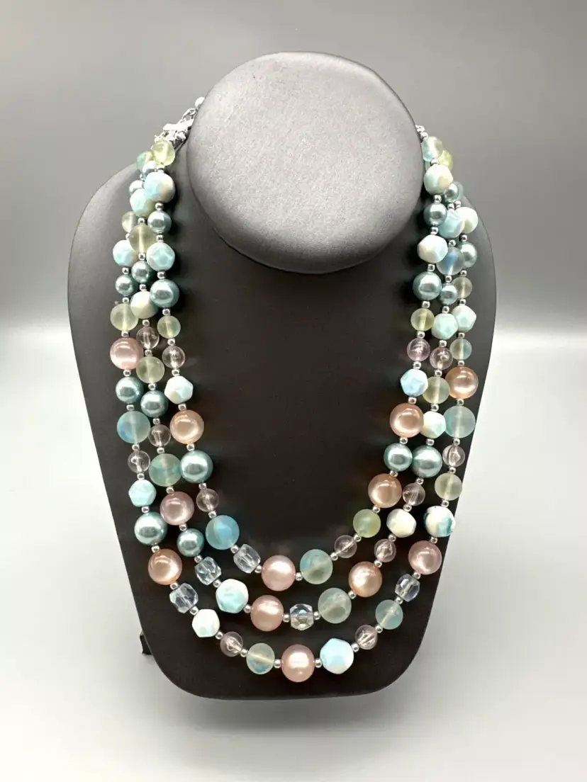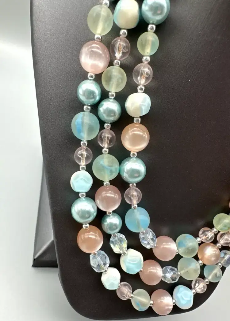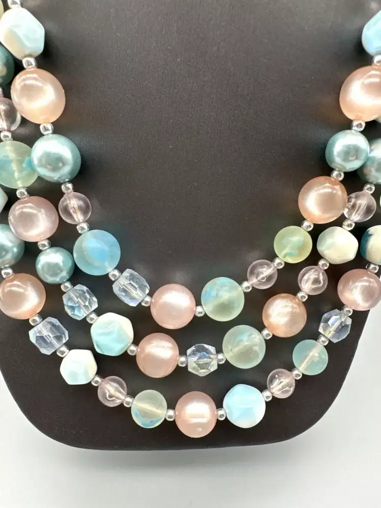 -Signed: Pat for "Patent" On the hook -Item: Plastic Beaded 3 Strand Necklace -Measurements: Appx 16" Length-Longest Strand -Condition: Excellent Condition -Accents/Features: Very Pretty Pastels-Great For Spring!-Plastic Beads in translucent, different shapes, opalescent, etc-Very Pretty-1950's?? -Year: Vintage