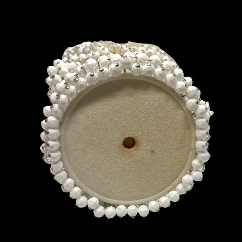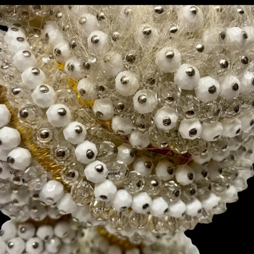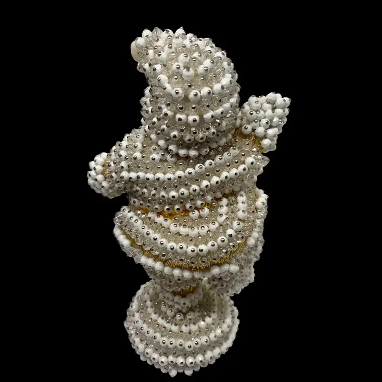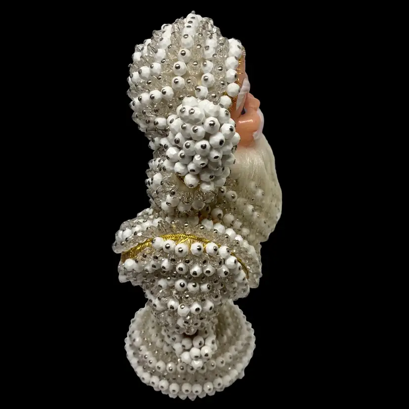 Vintage Santa was handmade from a "Pin A Bead" kit sold in the 60's/70's. White and crystal beads are secured by silver pins. He is in excellent condition with just a slight bit of yellowing of his hat's pompom and discoloration on the bottom where the wooden dowel is set into the base. There are no missing beads and he stands very steady. Santa is approximately 9" tall and 4.5" wide at the waist. It is well done and must have taken a lot of patience to complete.