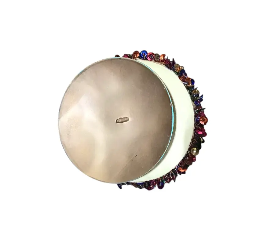 Vintage MCM Pre-Owned in very nice condition. Years ago we added the star on top of the tree, the tree never had a star but our kids wanted it to have a star topper, my husband added a star from one of those ceramic Vintage Christmas Trees. It just sticks in the top and can be pulled right out if you don't want it to have the star topper. We enjoyed the way it looked so I am leaving it in place and including the star topper. The base of the tree is round brass and keeps the tree stable and the tree doesn't tip over. It appears to be a cardboard type cone with fabric attached. Each strand of beads and sequins are then strung to the material. Base is Brass. It probably has some missing sequins or beads here or there but as shown in photo it is loaded with sequins and beads. Just like a beaded or sequined sweater, you may find a sequin or bead on occasion shed from the tree. Including the star it is approx 12" tall, 4.75" wide at bottom of tree and base is approx 4.25 across.