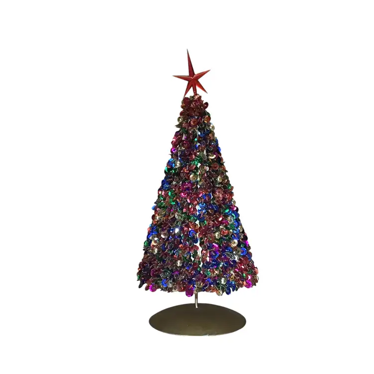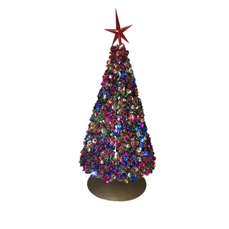 Vintage Beaded Sequin Christmas Tree Table Top MCM Brass Base Added Vtg Star 12"