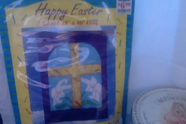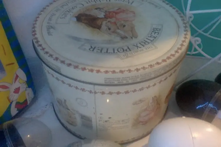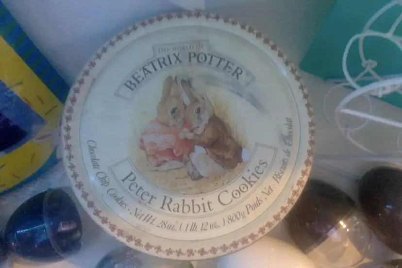 Vintage Beatrix Potter Cookie Tin, Easter Flag, Easter Egg Carousel, and Leggs Eggs; lot of 10 items for $16. Beatrix Potter Peter Rabbit Cookie Tin pictures Peter and Benjamin on lid and illustrations around the sides of their adventure into Mr. McGregor's garden. Bottom has slight rusting, one picture on side is slightly erased. (1970's from my grandmother) Easter flag with metallic gold cross in center, 28in. x 40in. Package never opened. (1995) Easter Egg Carousel is white plastic coated metal. Holds 6 eggs, spins easily, pristine condition. (1990's) {$5 shipping for this whole lot of 10 items} Leggs Eggs: 2 silver, 3 clear top with smoke bottom, 1 all smoke, 1 white. (1970's pantyhose) Please see my other listings. Multiple purchase discounts. Monitor 8PM nightly. (not 24/7)