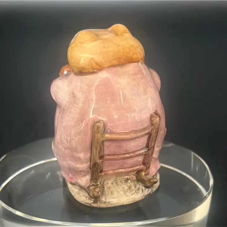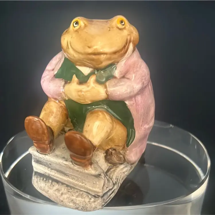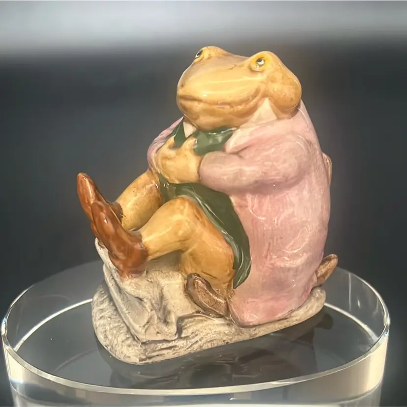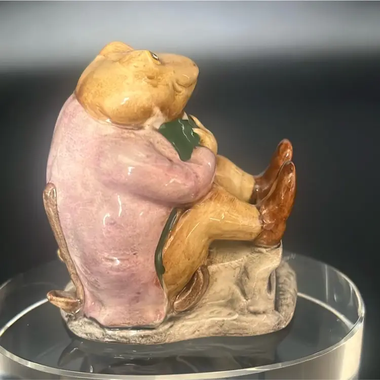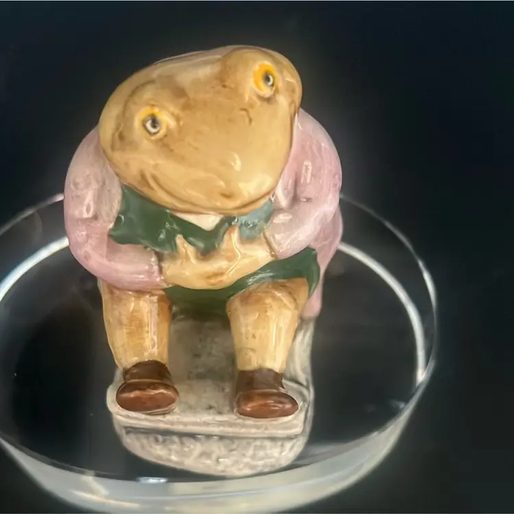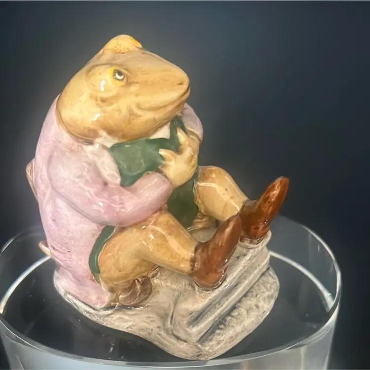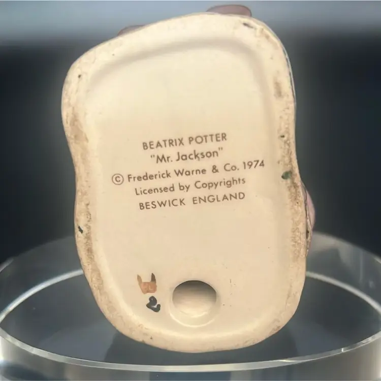 Character: Mr. Jackson, a toad character from the Beatrix Potter stories. Manufacturer: Primarily Beswick, England, with some later versions by Royal Albert. Date: First issued in 1974, with various backstamp variations released through the 1970s and 1980s. Features: It depicts a toad wearing a coat, often sitting on a small base. Approximately stands about 3”
