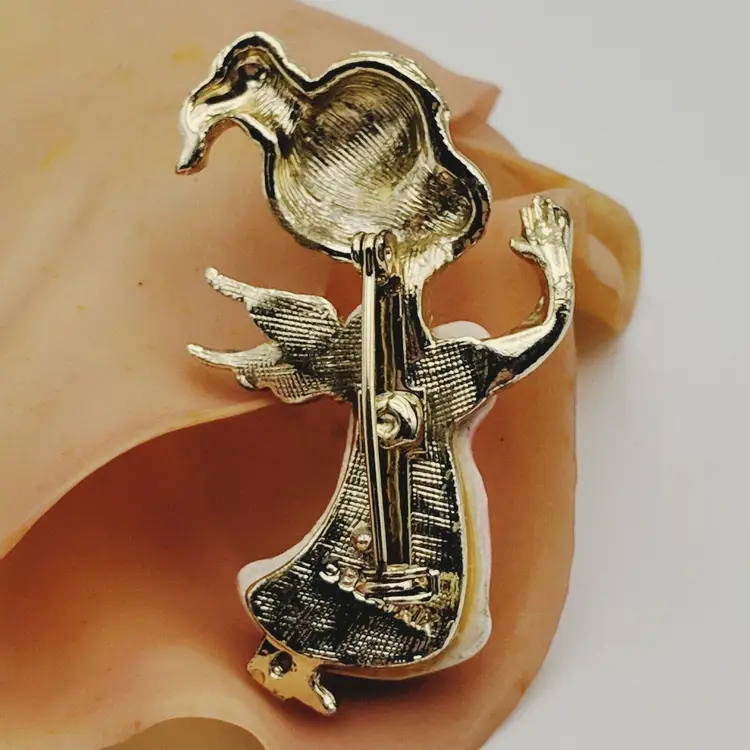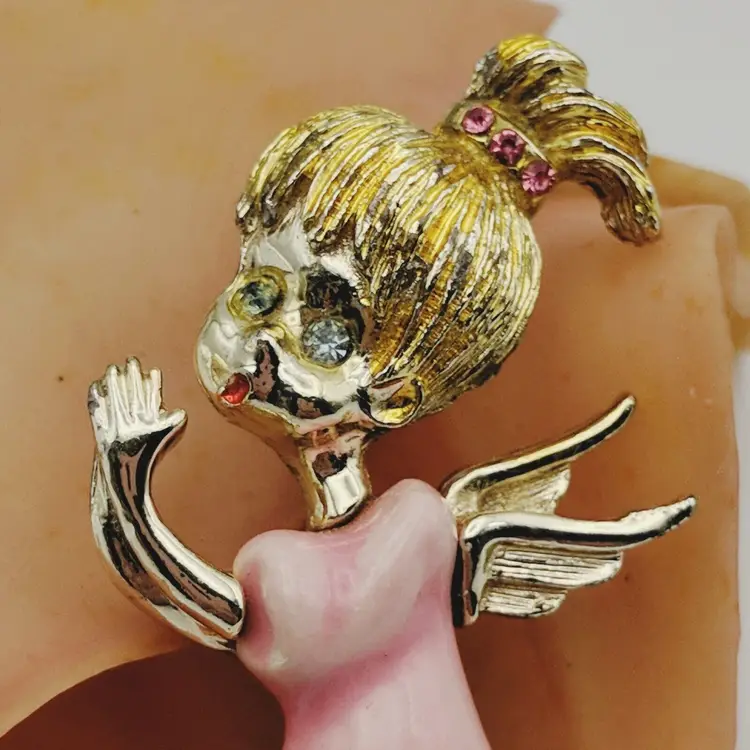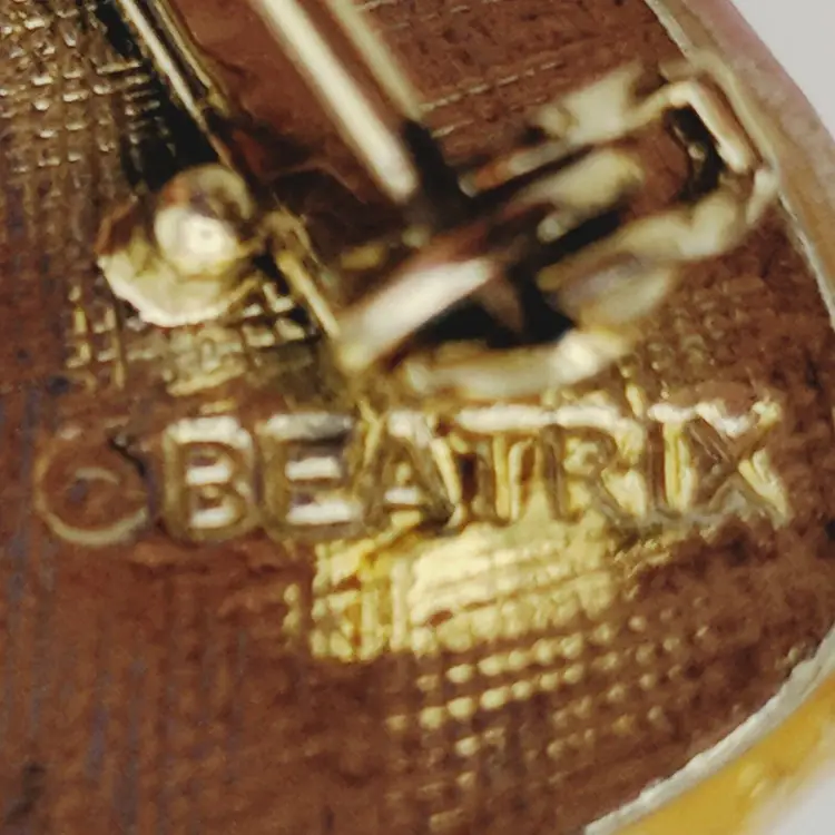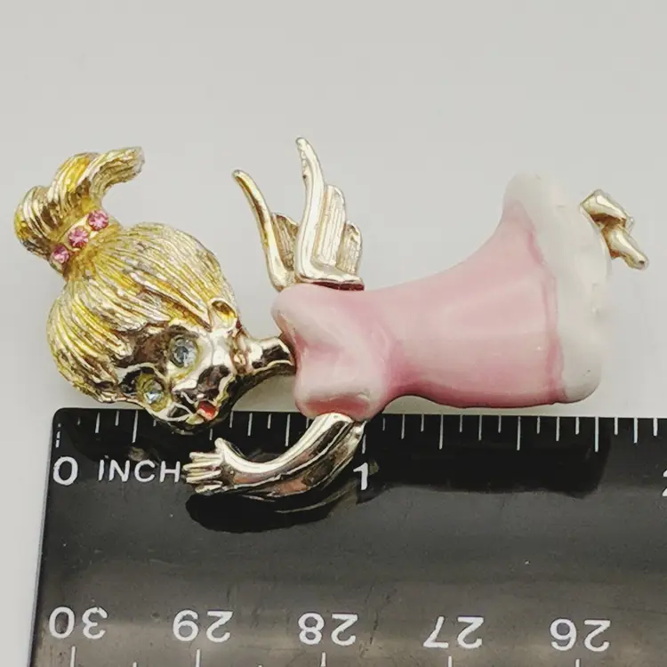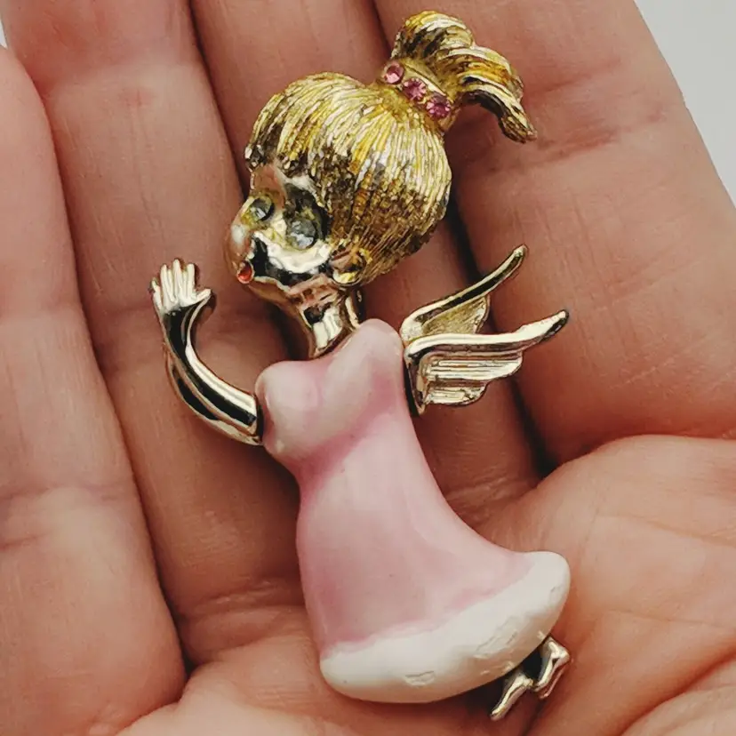 Slight wear on the white trim of the dress and her hair, no missing stones Main Stone Color: Blue Metal: Gold tone Item Length: 2 in Brand: Beatrix Era: 1970s