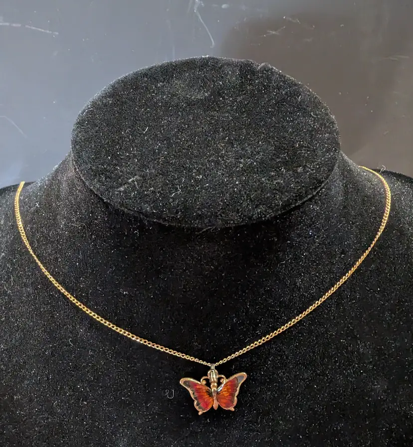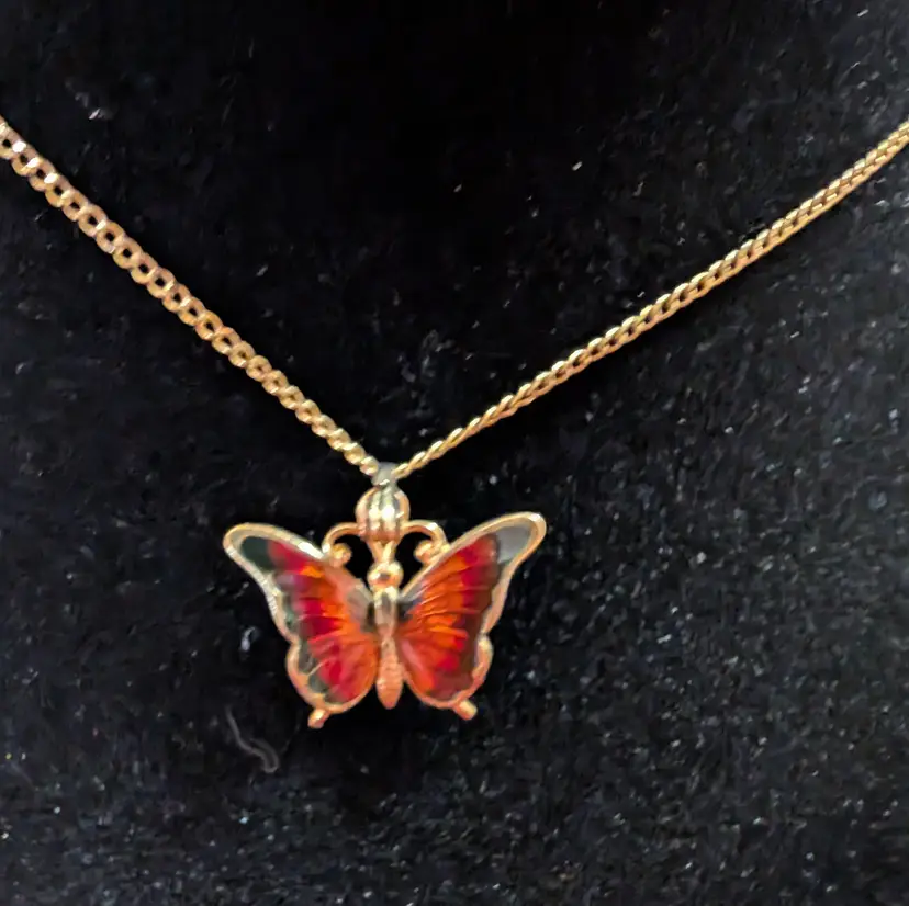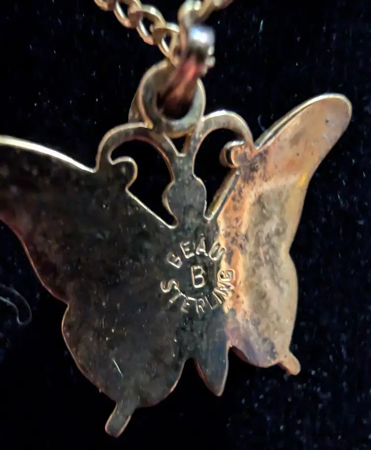 Beautiful brown enamel butterfly necklace by Beau Sterling. This piece is an amazing condition and is perfect for any outfit. Butterfly pendant is approximately 1 inch diameter and the chain is approximately 17 inches length.