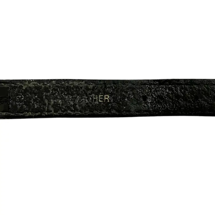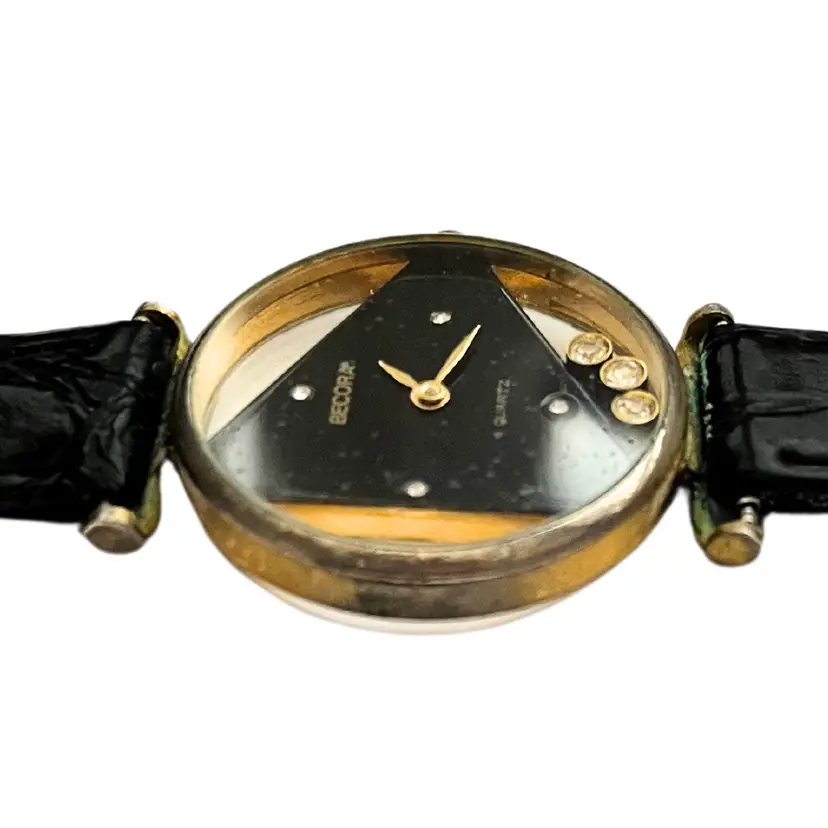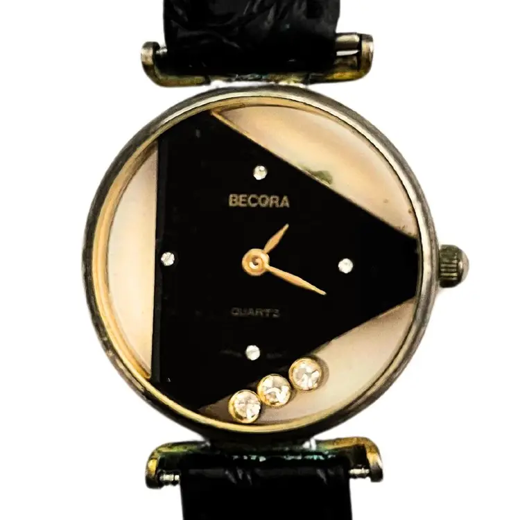 Vintage Women's Becora Quartz Analog Wristwatch with Black Leather Band Push Pull Crown Two Piece Black Genuine Leather Buckle Band Clear Case Triangle Dial Face Floating Gemstone Jewels Gold Metal Accents Japan Movement