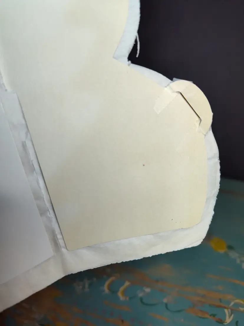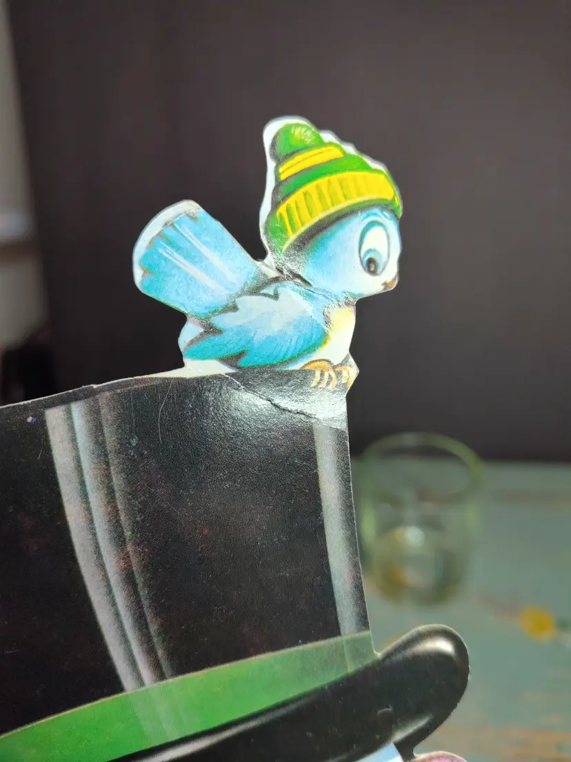 Wear as pictured- one tab has been taped, bend on bird, corner of hat and middle of candy cane.