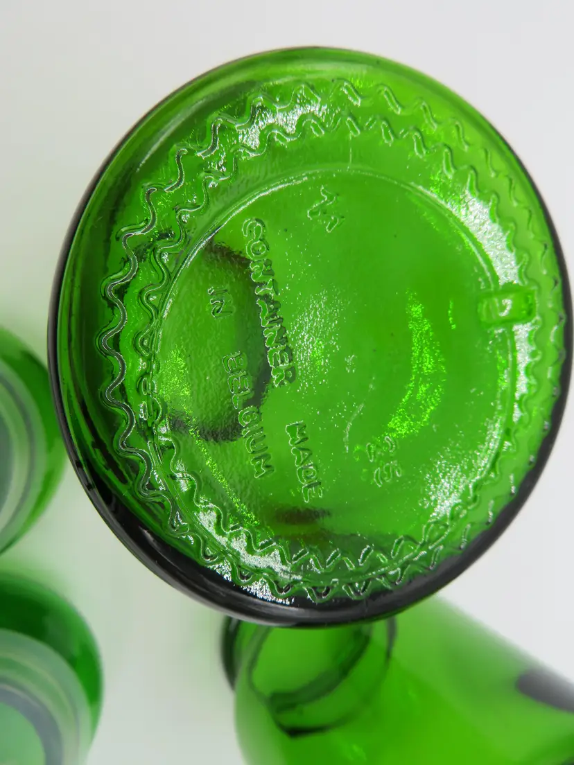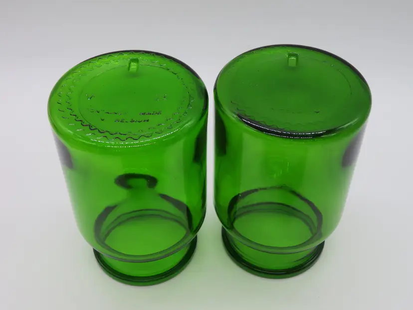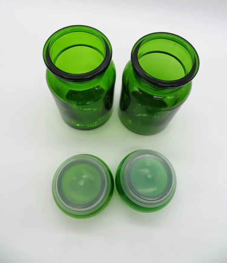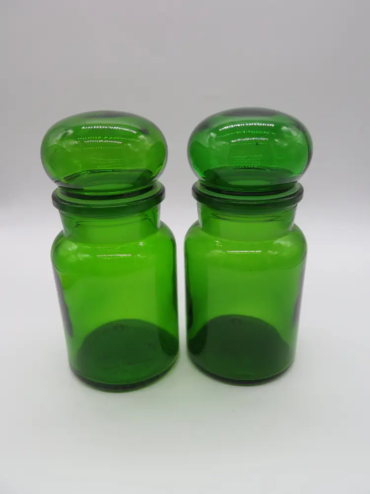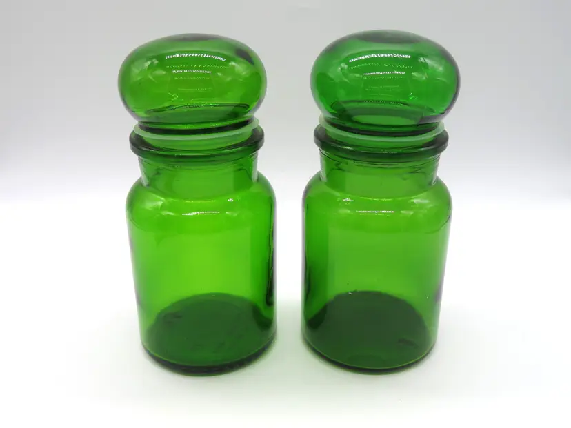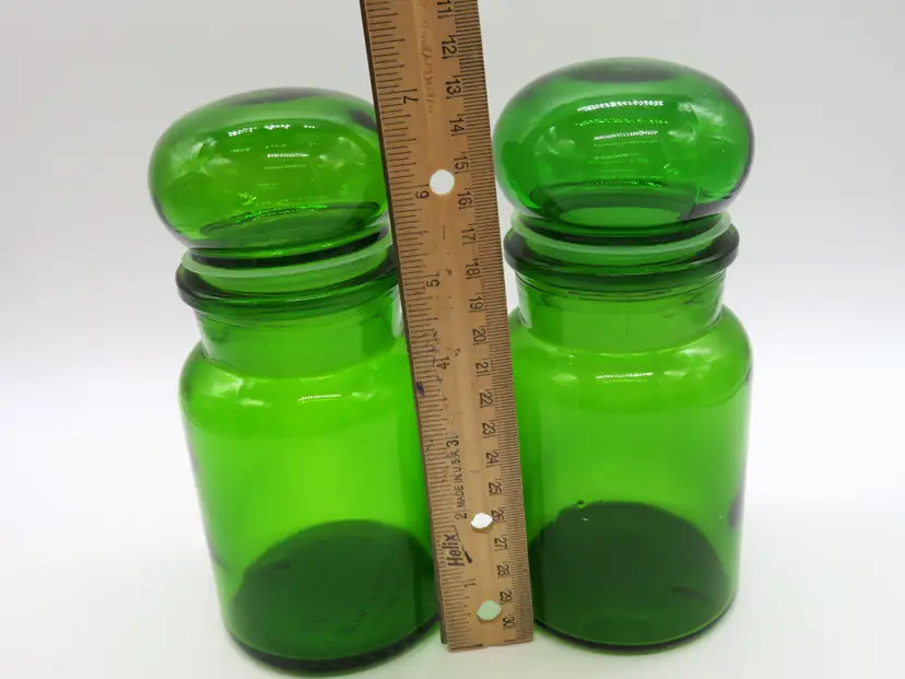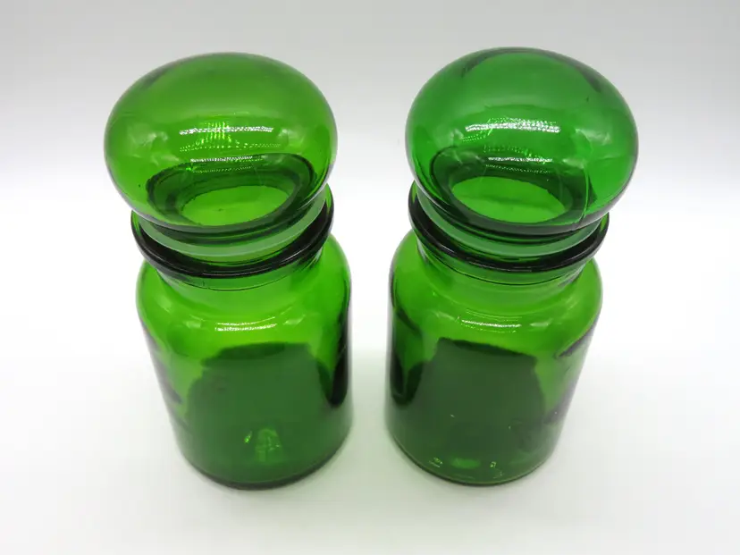 Item Description: For your consideration is a charming set of two vintage Belgium green glass apothecary jars, complete with matching lids. These jars are perfect for adding a pop of color to your decor or for storing small items. Each jar stands approximately 7 inches tall with lid, 5.25" tall without, they have a 3.25" dia. The camera cannot capture their full beauty! Shipping: I ship twice a day, 11am CST and 6pm CST. All items are securely packaged in foam & bubble wrap to protect your investment. All items are cross-posted and available in-store. Thank you for viewing my item, please check out my other listings!