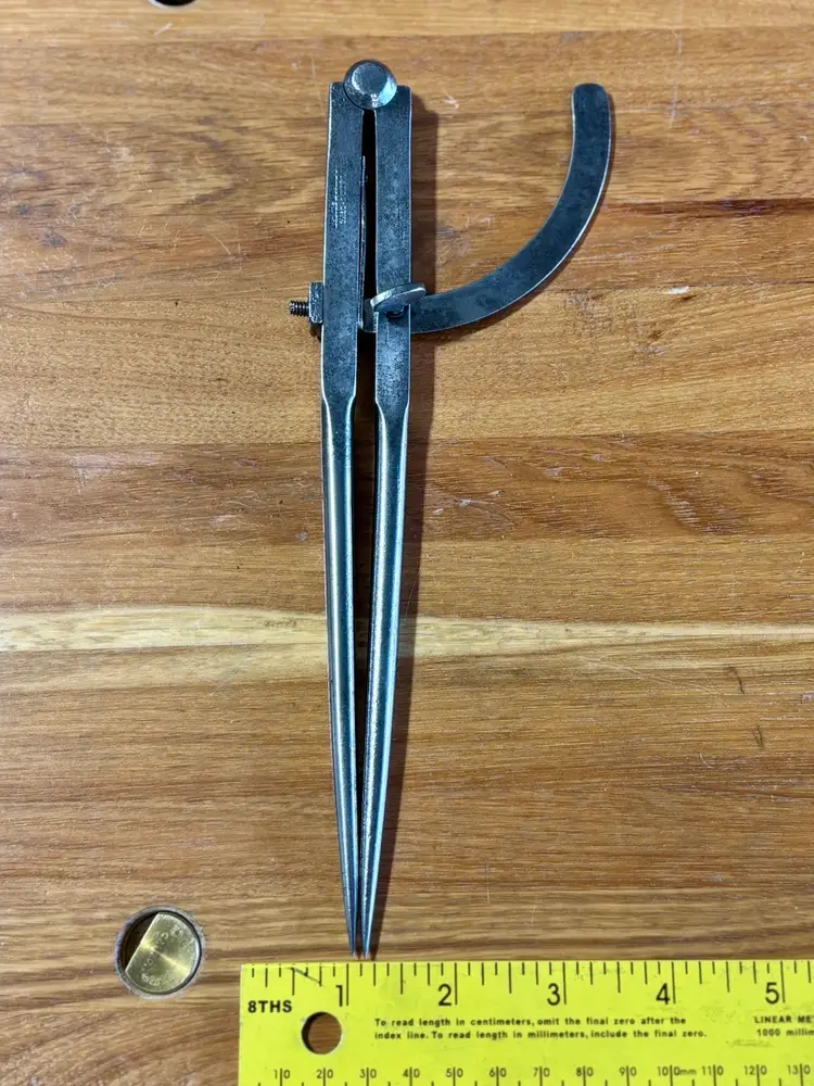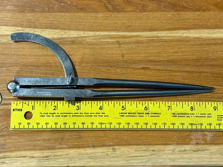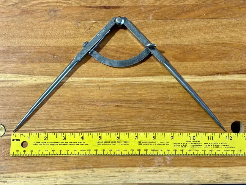 Vintage Bemis & Call Tool Company Winged Dividers. Measures 9" in length when closed and has a wingspan of 12" when fully opened. Maker's mark "BEMIS & CALL CO. CAST STEEL" is partially visible on one leg. The wing connector has a square nut that may be a replacement. See pictures for details. Let me know if you have any questions.