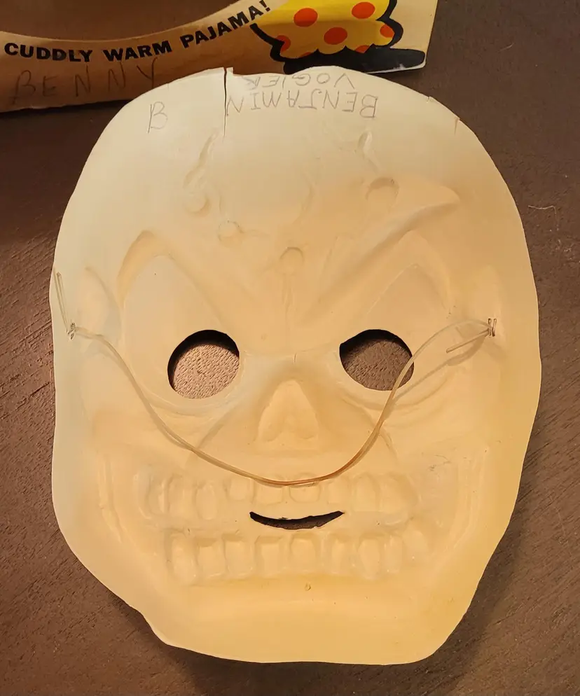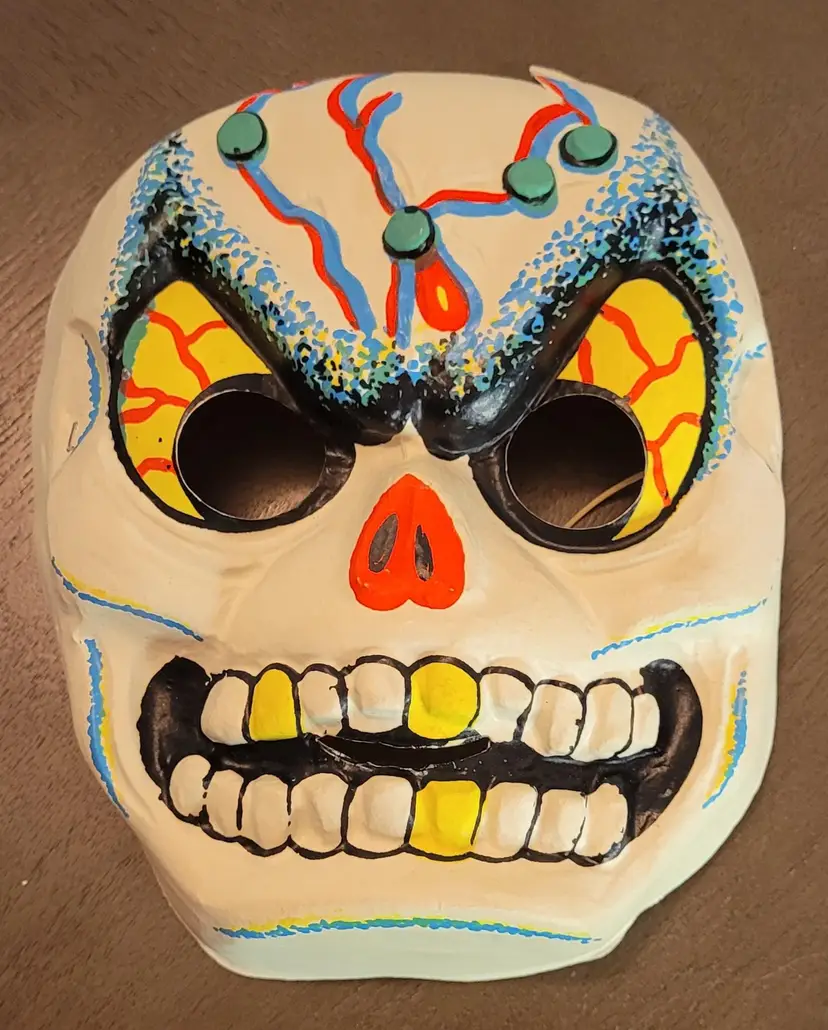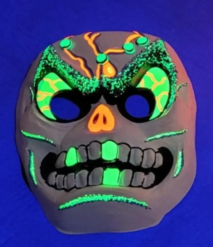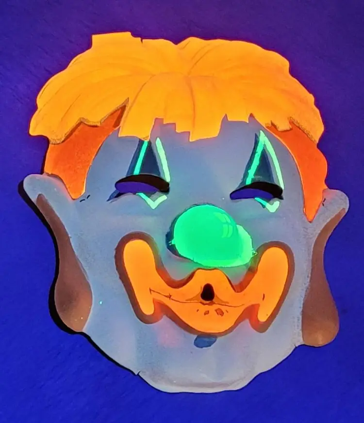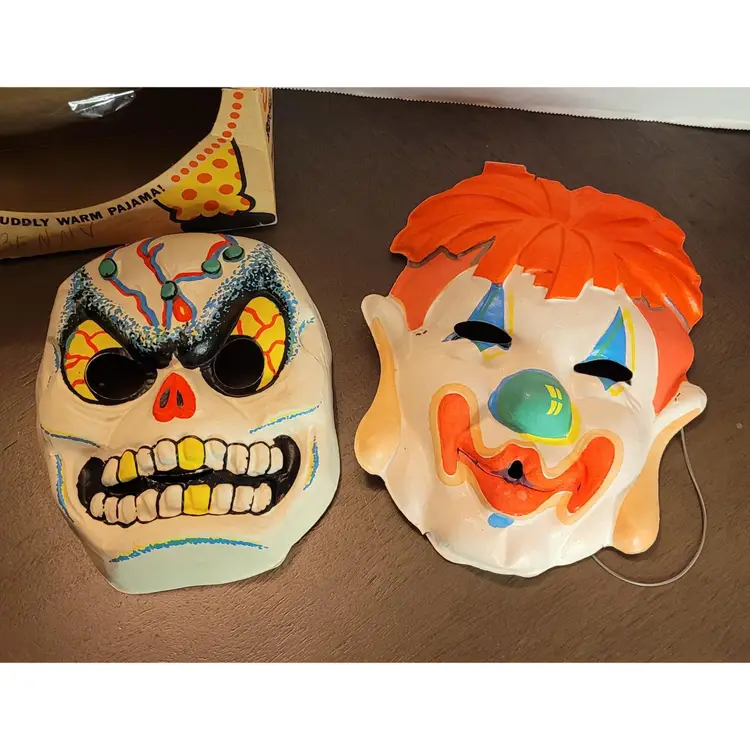 Spooky and fun set of vintage Halloween masks featuring a creepy skull and a colorful clown. Perfect for adding a retro touch to your Halloween costume or decor. Shows some signs of wear, so cracks ,adding to their vintage charm. 🎃💀 these glow in blacklight 💝 All items are packaged with care to help ensure safe delivery #nosadmail ✴️ Please follow my Facebook page & IG to see more great curated vintage items! ⚡️ #MrEccentrics #vintagecurator #curatedvintage #vintageshop #vintagestore #vintagehalloween #vintagecostume