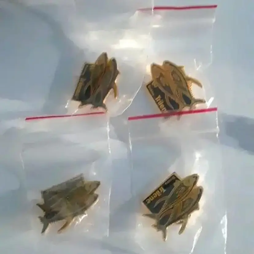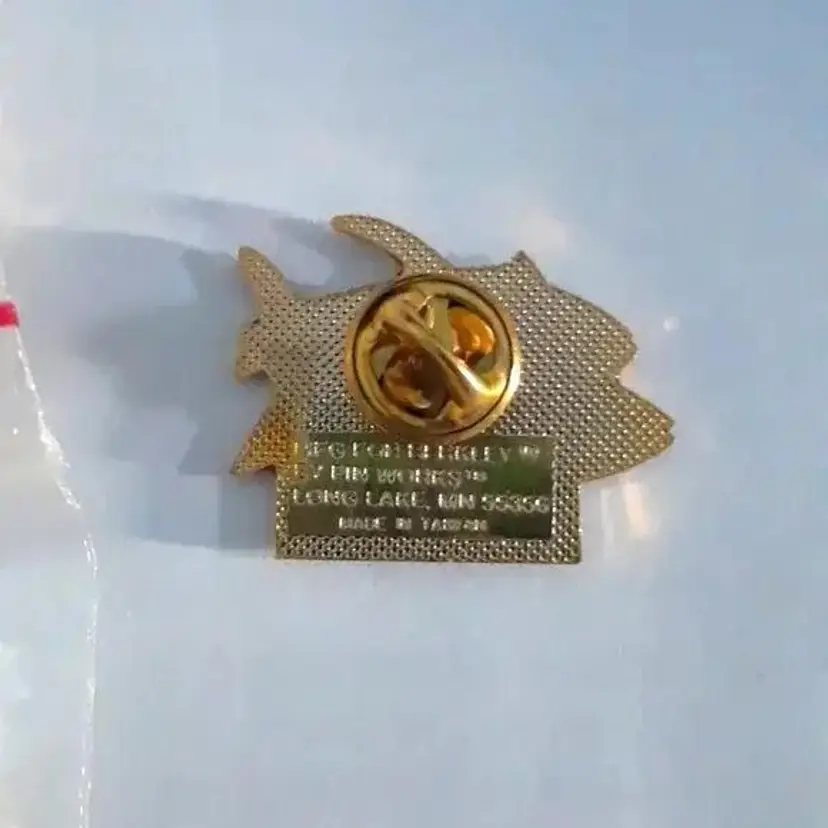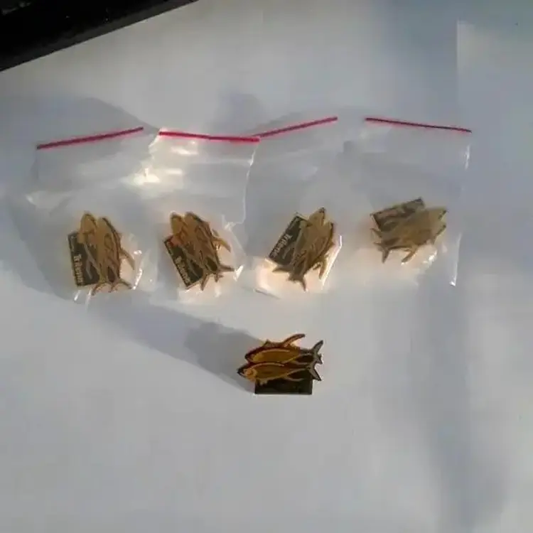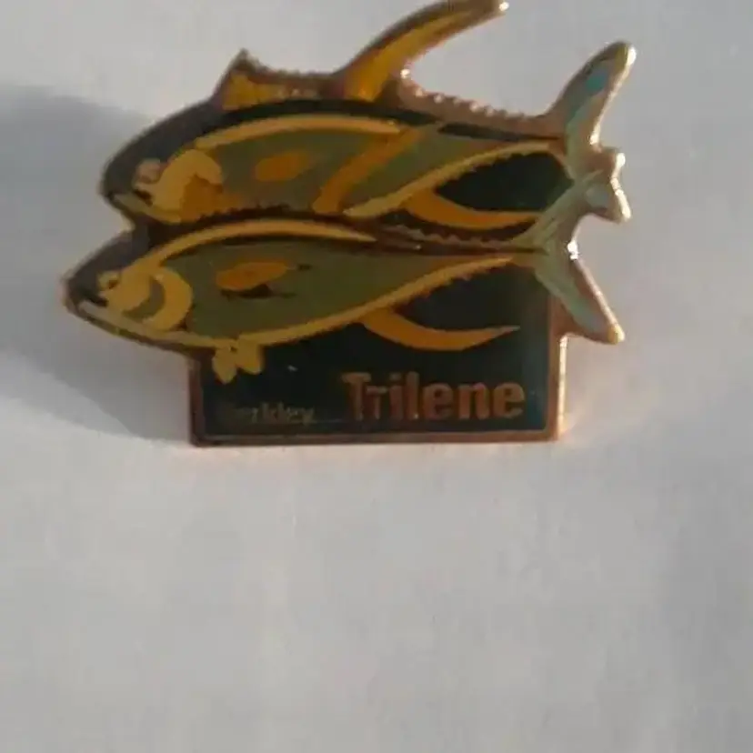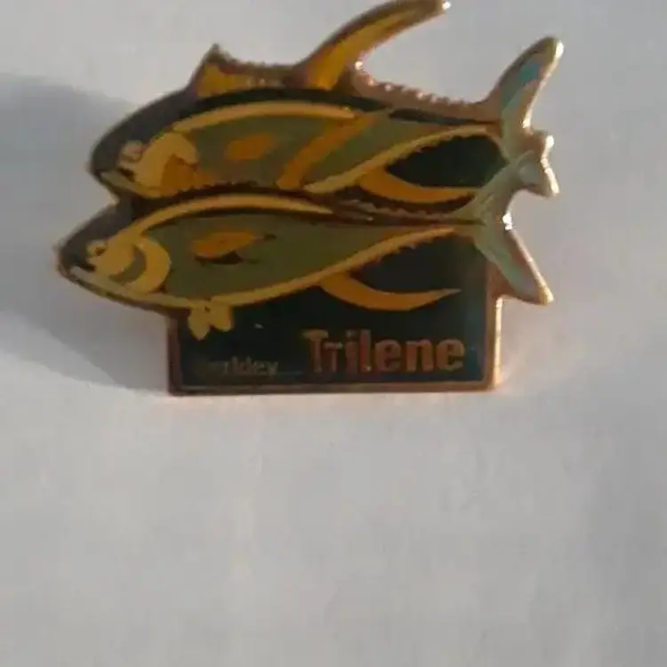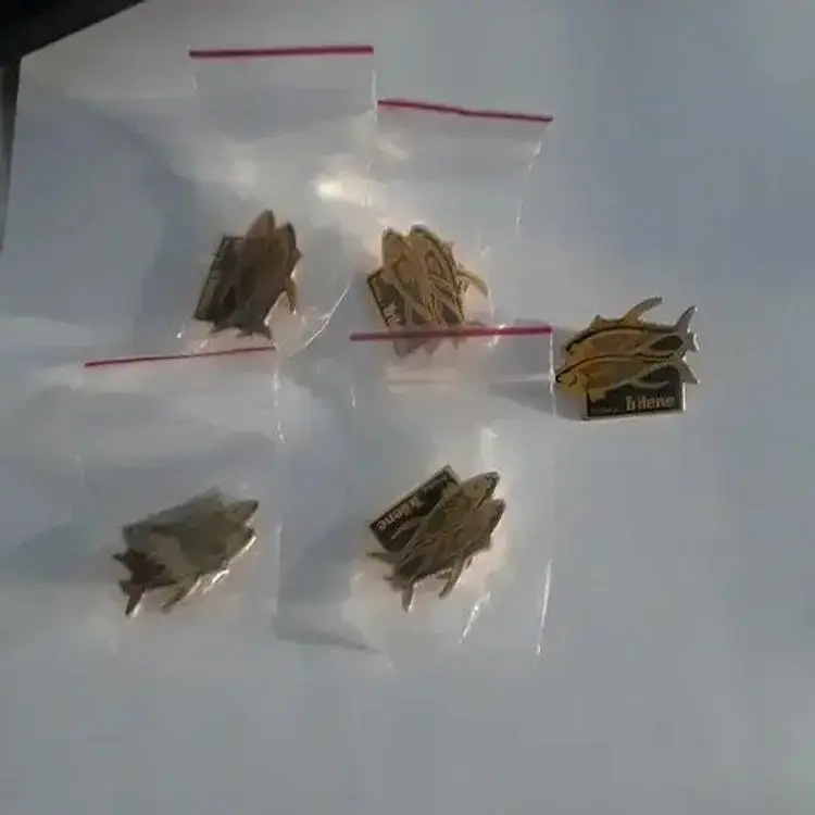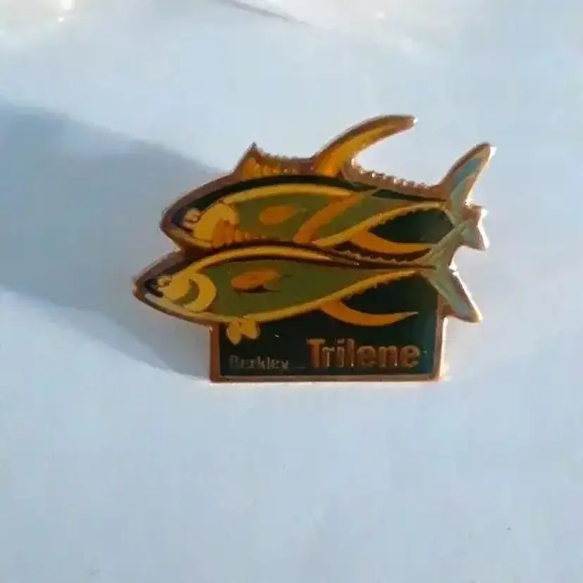 UNUSED lot of 5 Berkley Trilene hat or cap pins. Each pin measures 1 1/4 inches long and 1 inch wide. Color is gold and green with gold lettering. A great accessory to your lucky fishing cap, vest or shirt.