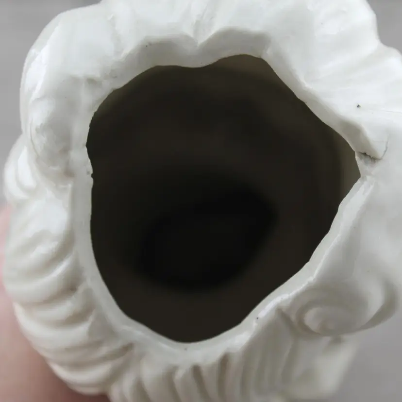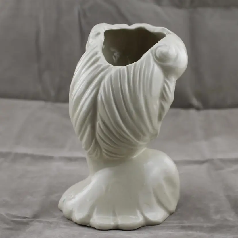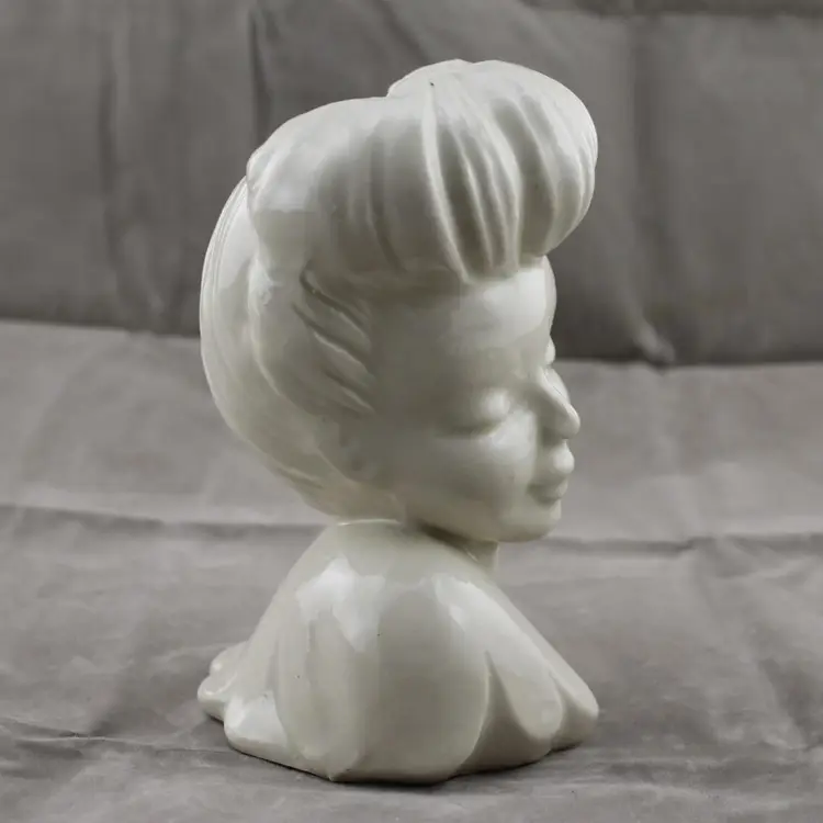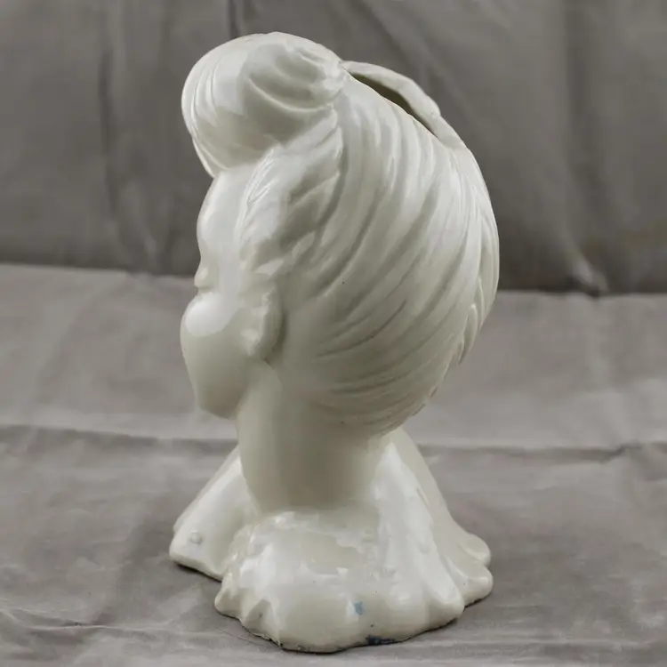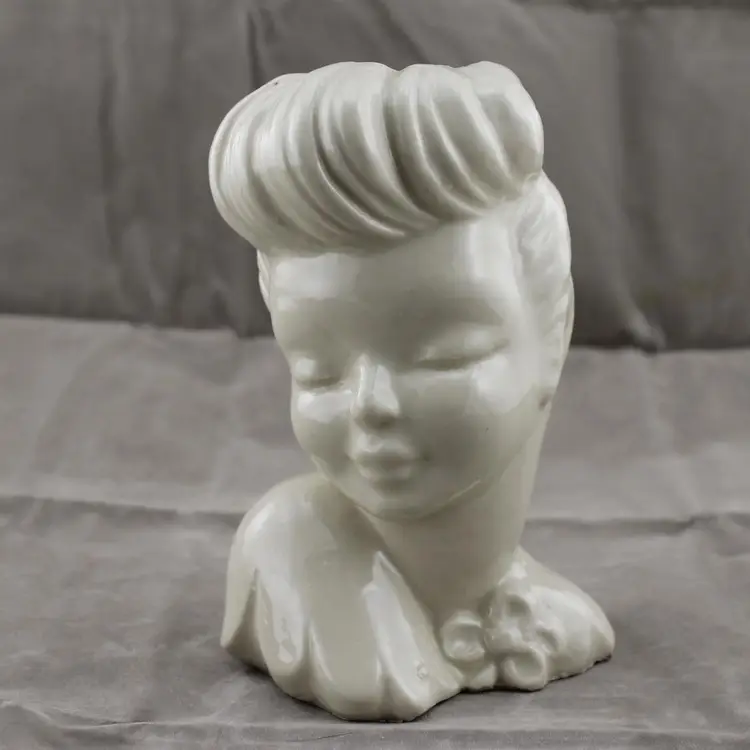 Vintage Betty Grable Head Vase or planter by Glamour Girls. This is from about the 1950s. It is in good vintage condition. This is a ding in the top. A photo is included. This is marked on the bottom Design No 2 USA. It measures approx. 6" tall and 4 1/4" across the bottom. It has a creamy white glaze.