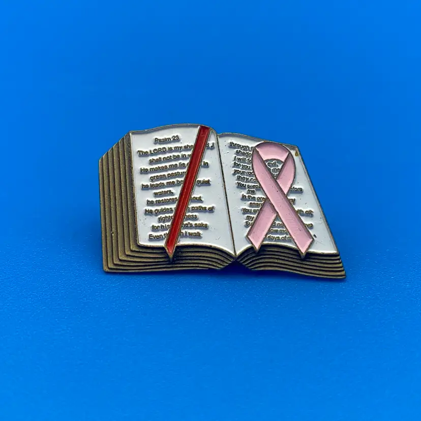 You are purchasing one Bible Shaped Metal & Enamel Pin w/ a Breast Cancer Ribbon. The Bible image is open to Psalm 23. This Pin has a double backing and is around 1.25 inches wide and 0.75 inch tall. This Pin is in great condition. Minimal signs of wear. No bends, breaks or cracks in the material.