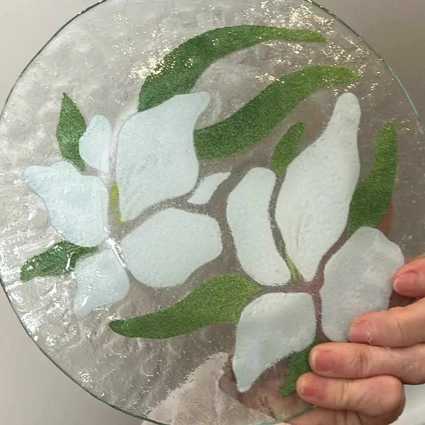 Vintage Handmade Fused Glass Plate by Bill Sydenstricker. This plate is in good condition with no flaws and is approximately 8 1/2 inches in diameter. I’ve tried to show this lovely plate and various different lights to show. It’s Beauty. The listing is for the plate. Only anything else shown in the background is merely background. It is a wonderful vintage condition with no chips or cracks I have five other different floral plates by the same artist so please check out my other listings. I will combine combine and/ or reimburse any shipping overages (over $2). Thank you