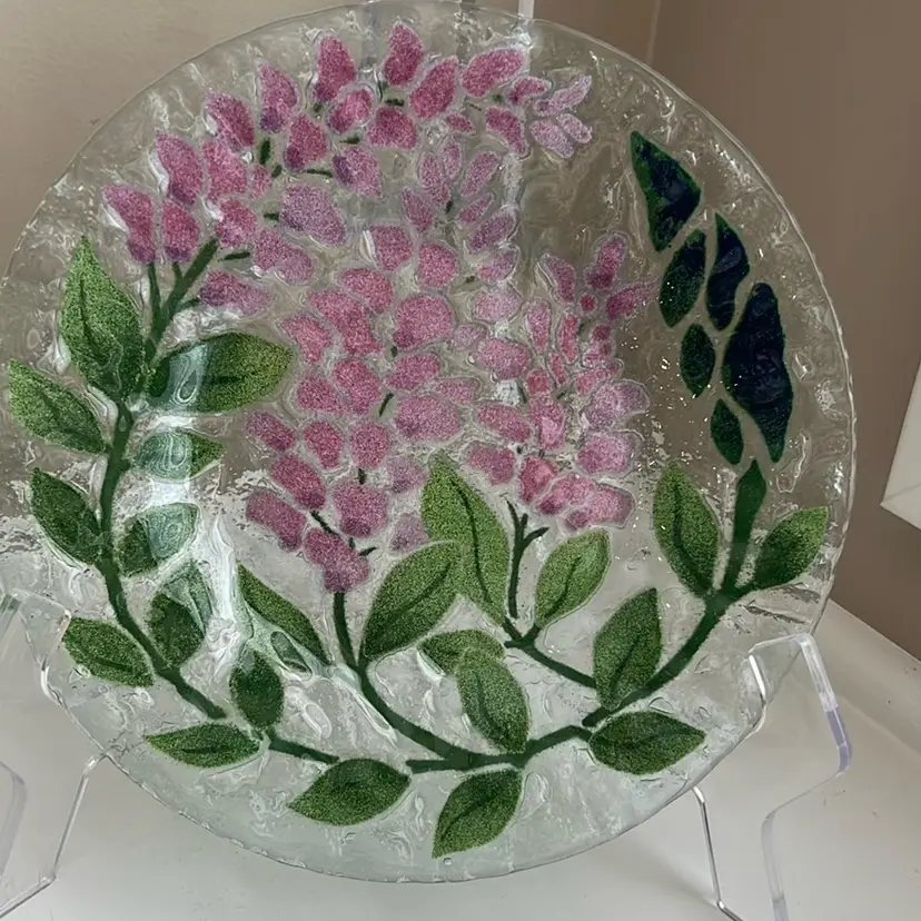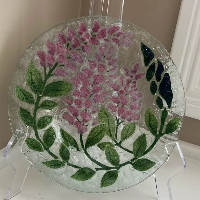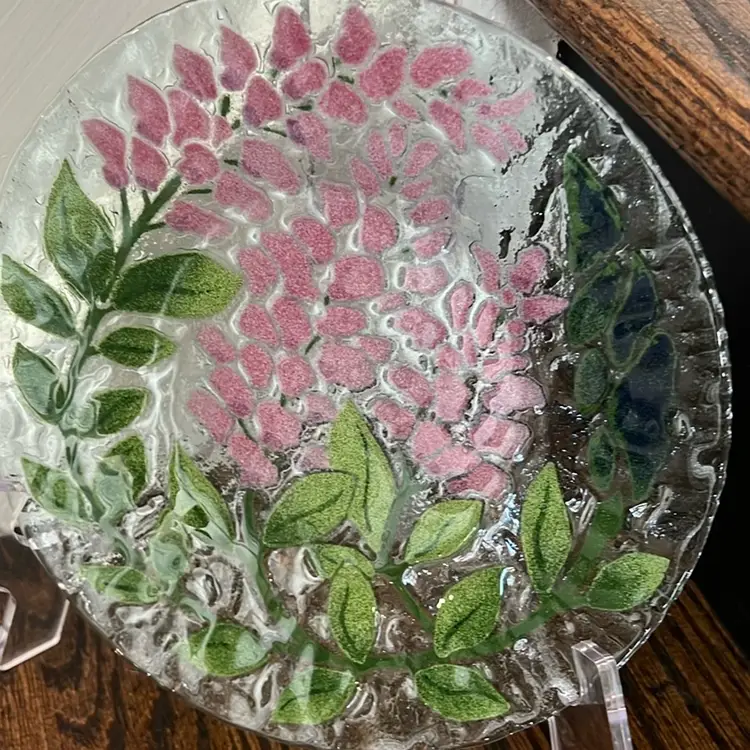 Vintage Handmade Fused Glass Plate by Bill Sydenstricker. This plate is in good condition with no flaws and is approximately 8 1/2 inches in diameter. I’ve tried to show this lovely plate and various different lights to show. It’s Beauty. The listing is for the plate. Only anything else shown in the background is merely background. It is a wonderful vintage condition with no chips or cracks I have five other different floral plates by the same artist so please check out my other listings. I will combine combine and/ or reimburse any shipping overages (over $2). Thank you