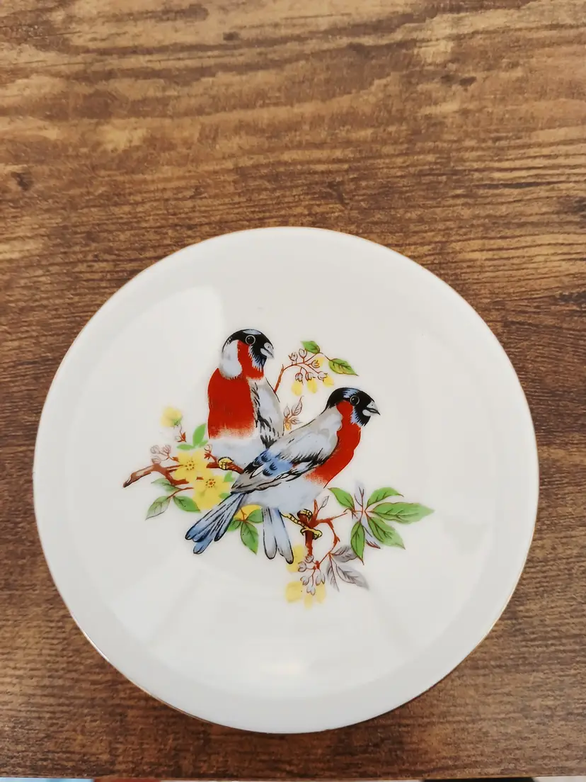 Brighten up your space with this charming vintage decorative plate featuring a colorful bird motif. Perfect for bird lovers or as a unique wall decor piece, this plate adds a touch of nature-inspired elegance to any room. Measures approximately 4 inches in diameter.