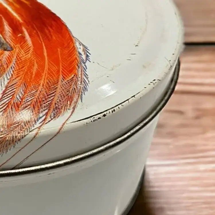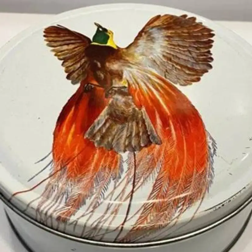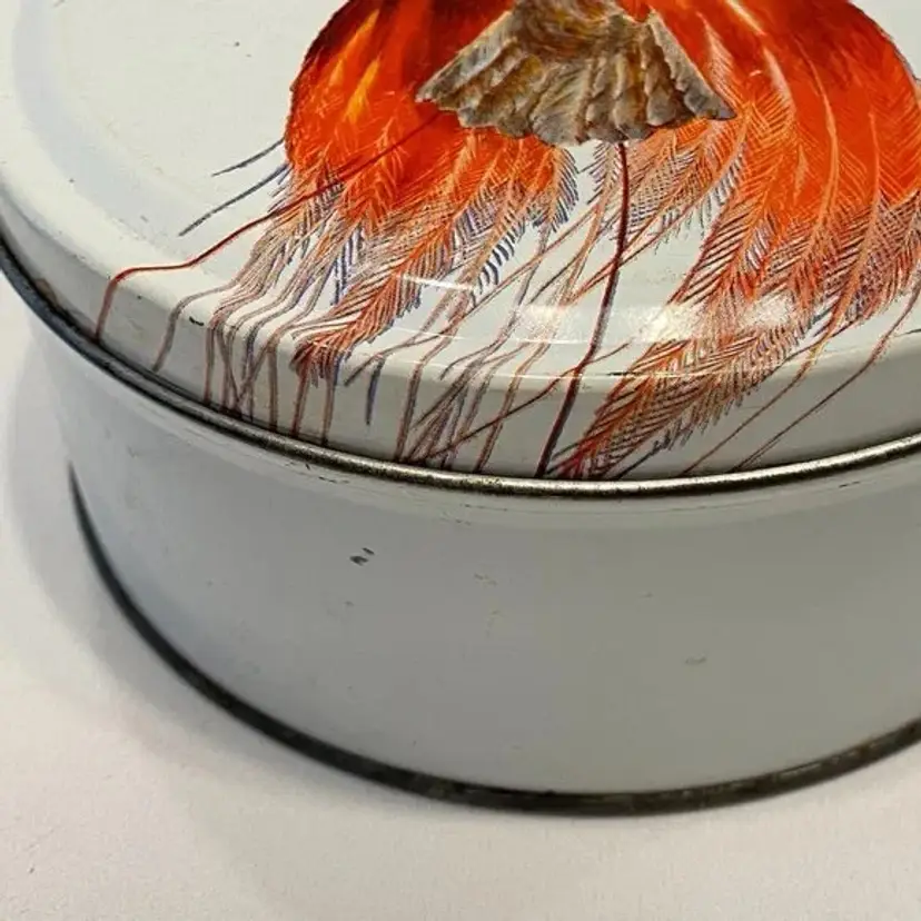 Vintage round tin featuring a beautiful Bird of Paradise in flight on the lid. Both top and Bottom of Tin are White. Condition is Very Good, only minor scratching as shown on photos. 6.5 inches in diameter 220 grams all tariffs and duties are included in the shipping price