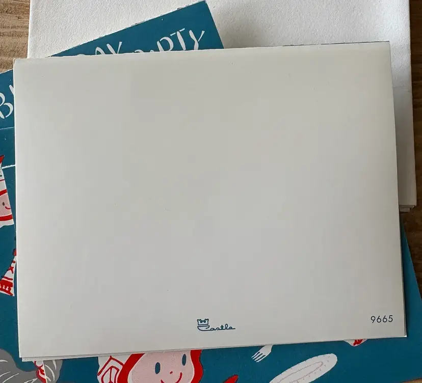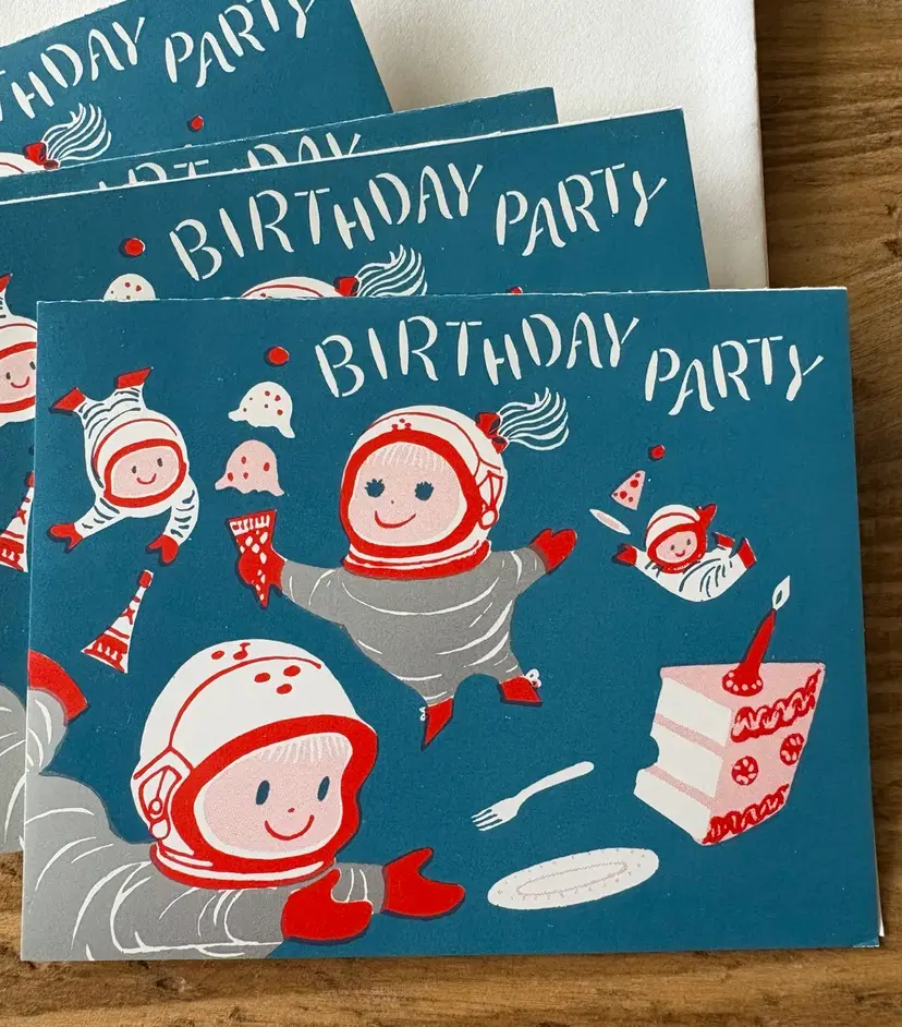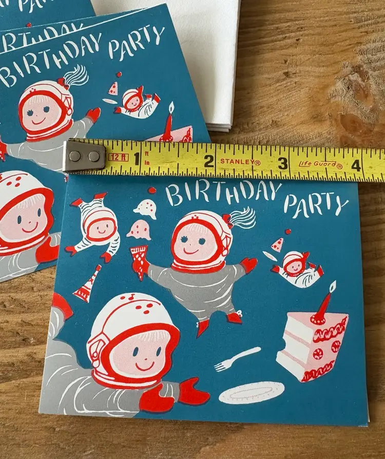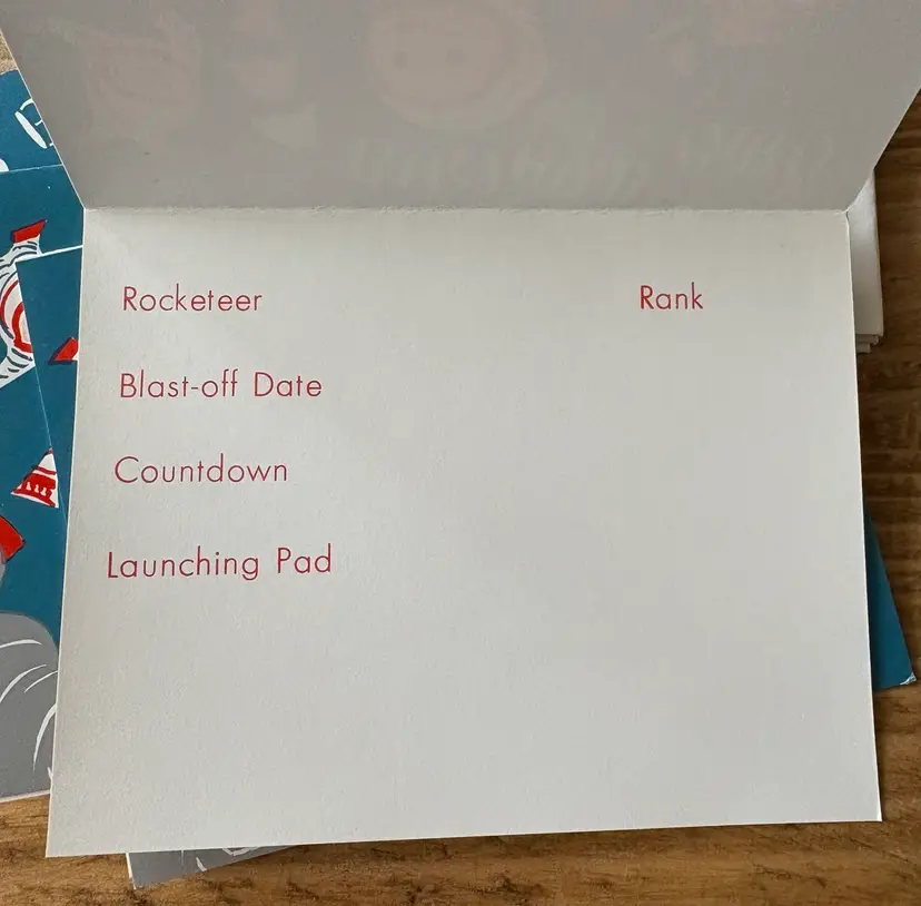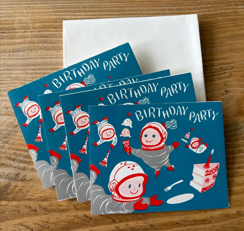 Really cute and nice condition! Silvery space suits. Glossy finish on back. Fun astronaut-themed wording on the inside. Castle brand #9665. Lot of 4 cards and envelopes.