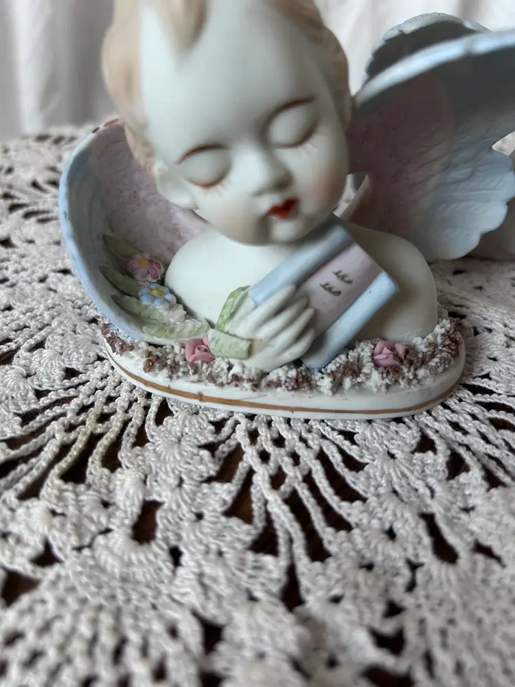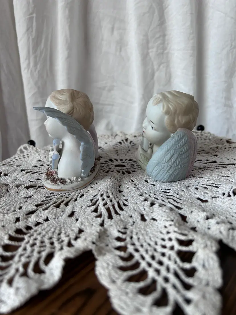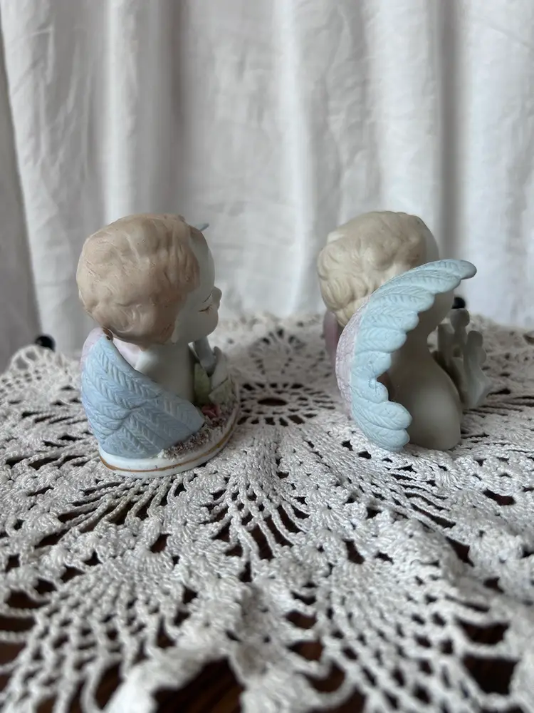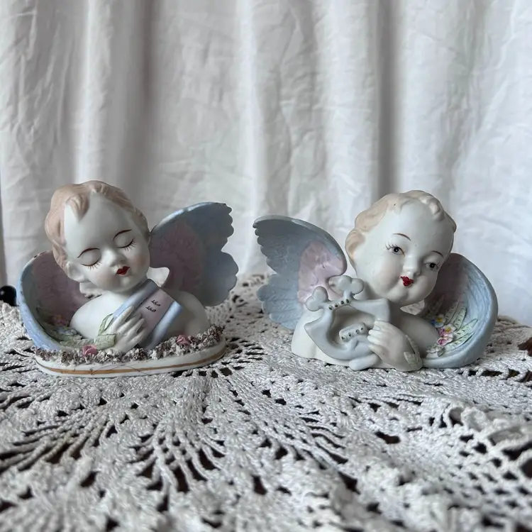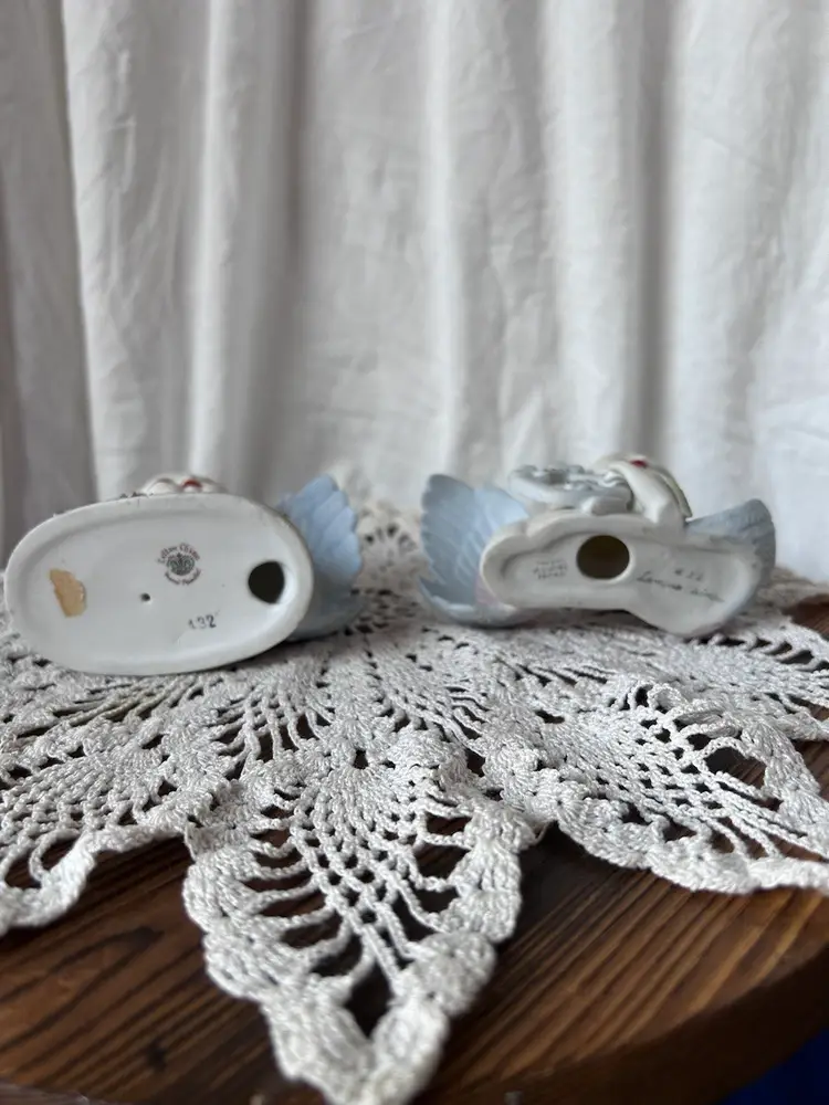 Beautiful hand painted angel figurines by Lefton that were made in Occupied Japan between 1946-50 by their stamps. Only flaw I see is the left one is missing a leaf tip in the front that’s on the hand. They measure 2.75” tall, 3.5” long, and 2” wide. I will try to get the dirt off before shipping.