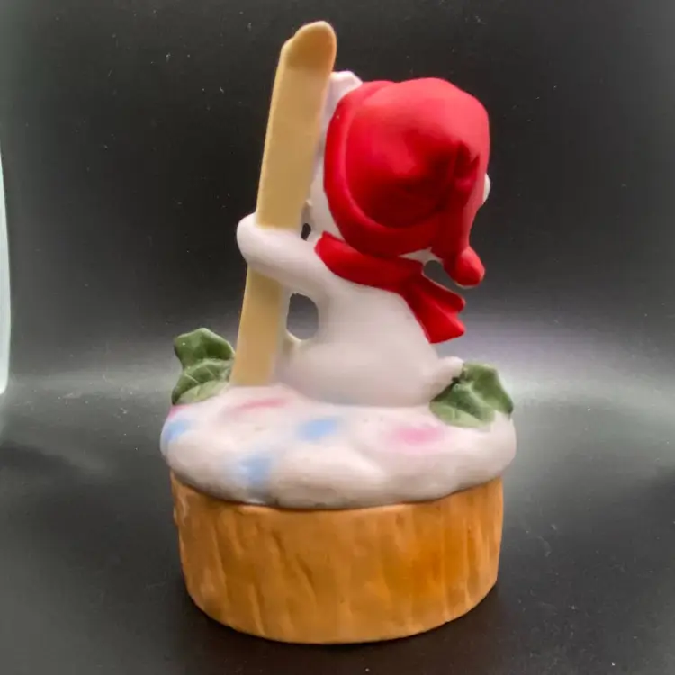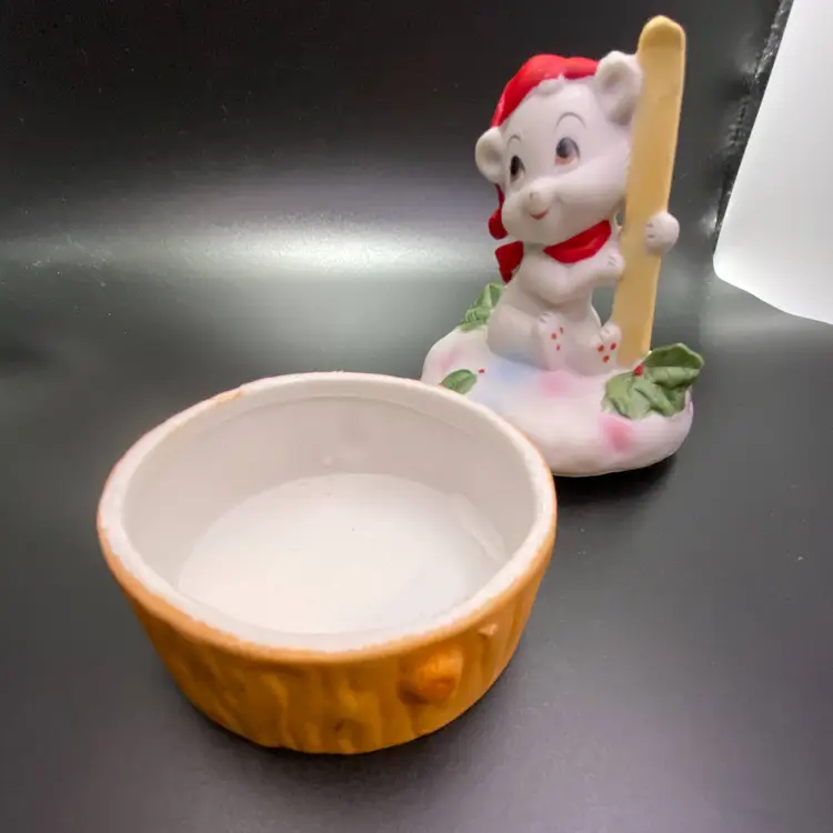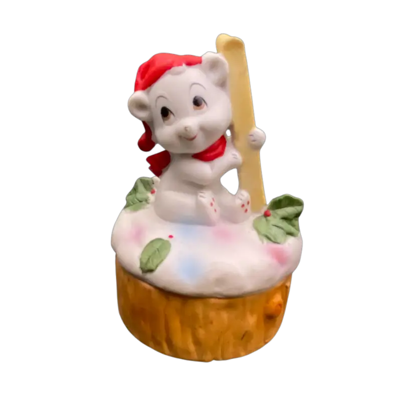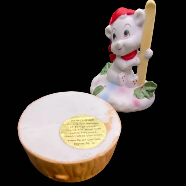 Pre-loved Adorable vintage 1980s ceramic trinket box featuring a white bear wearing a red hat and scarf, perched on a snowy top with holly leaves. Removable lid fits a small storage cavity — perfect for holiday decor or collectors—no chips/cracks. The label reads Karen Carson Creations-this is not the Lefton that looks similar. Measurements are approximate 4" high 3 x 3 " wide