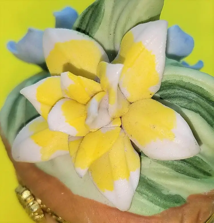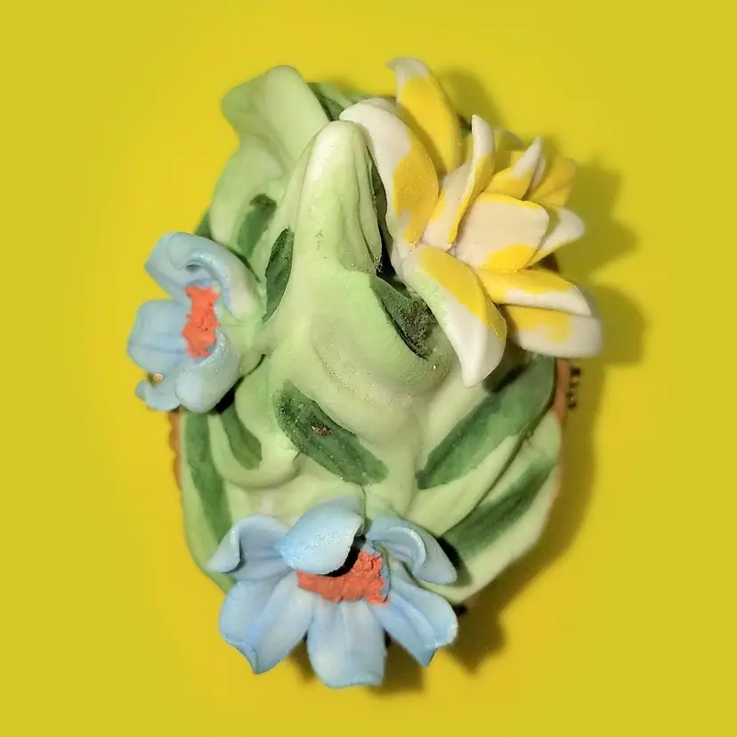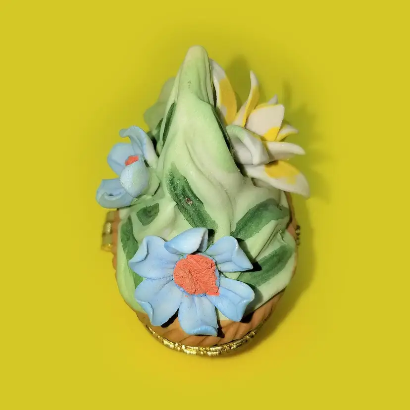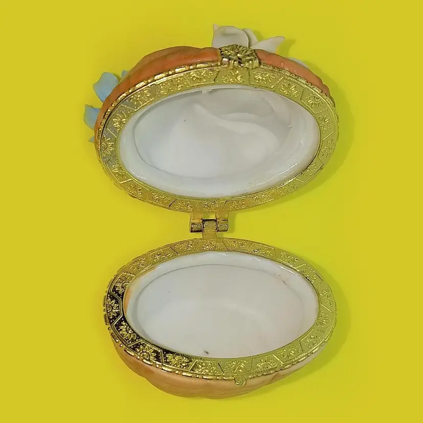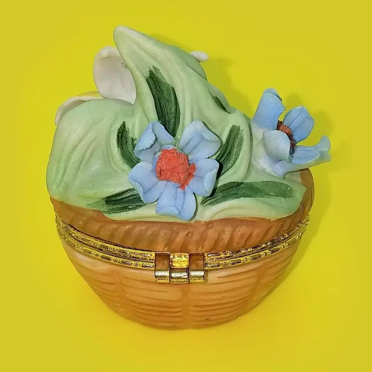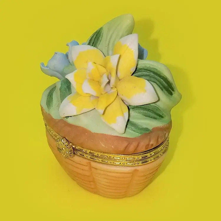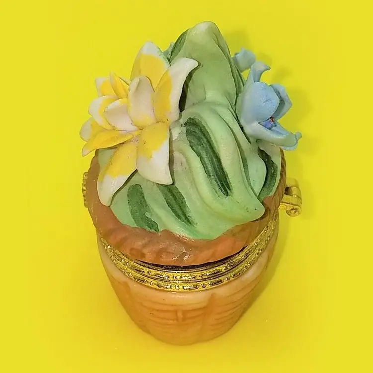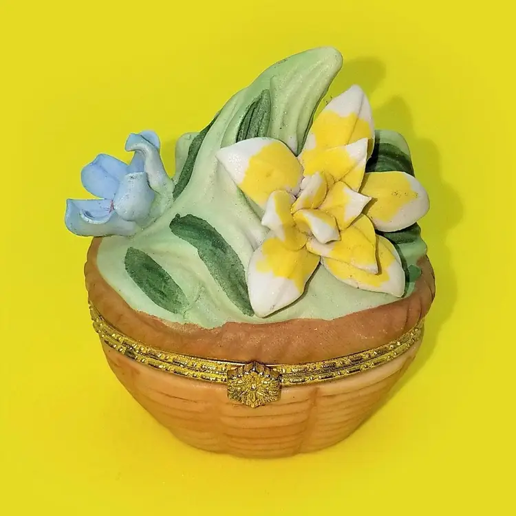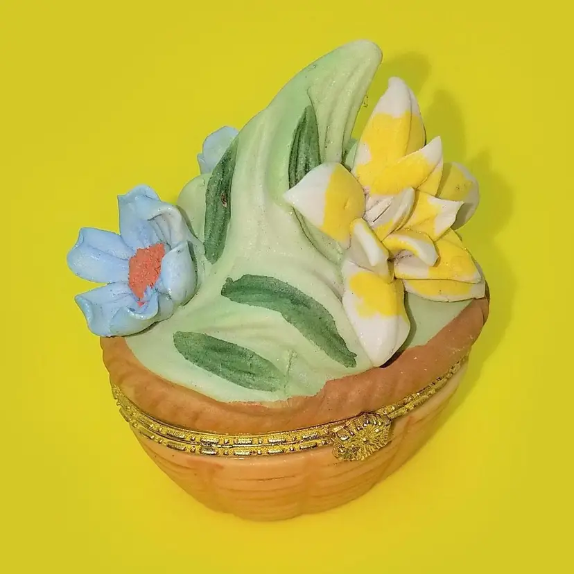 This trinket box is unmarked and a bit top heavy due to the florals. The latch works and there's no damage. Thanks for looking!