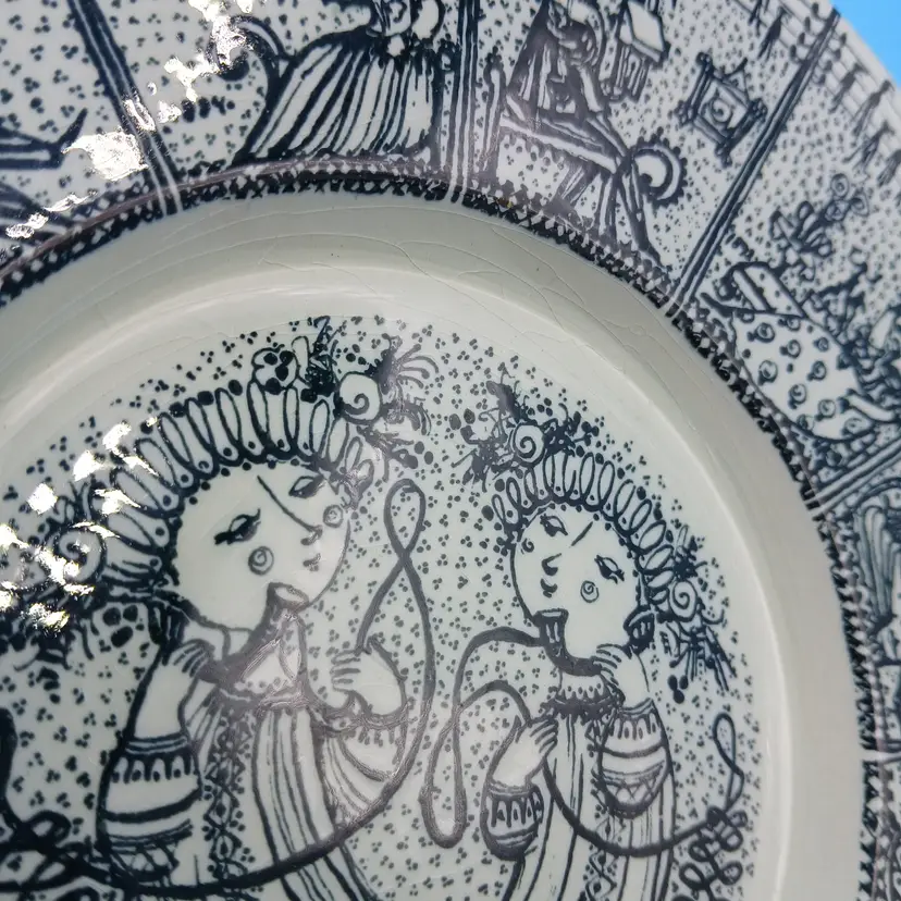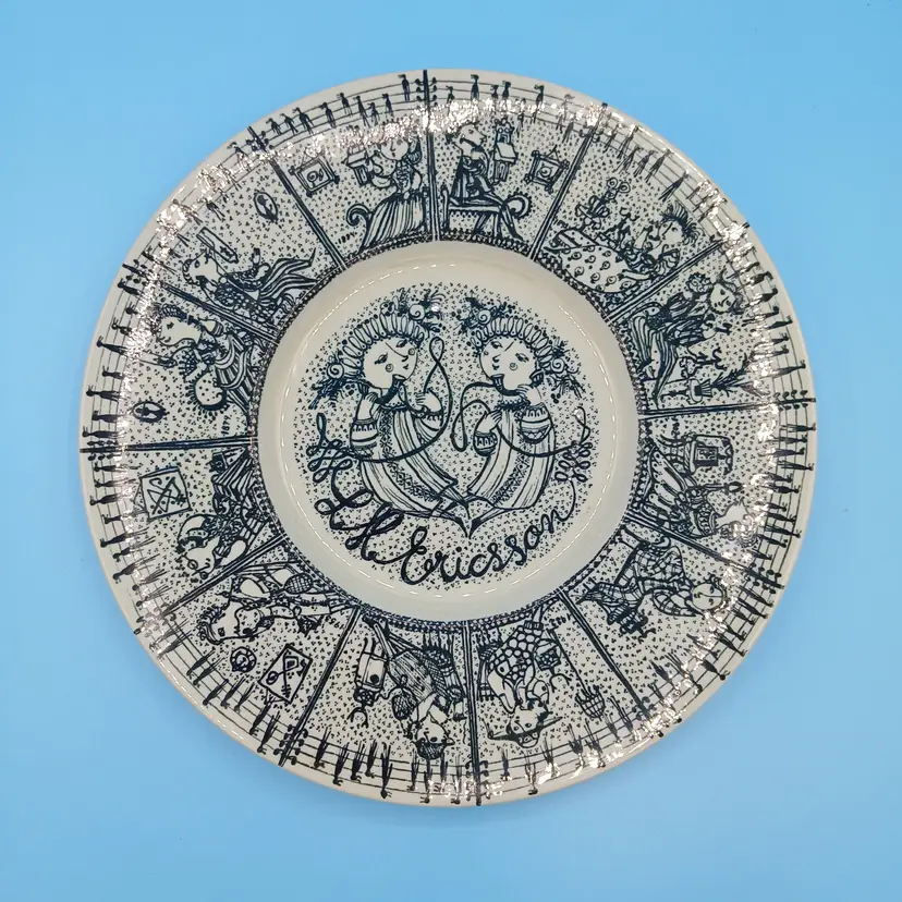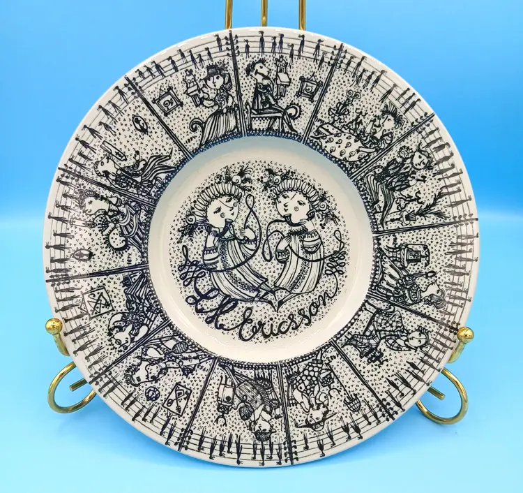 A collectors' plate ode to the telephone in Bjørn Wiinblad's unmistakable style, it's in very good condition, with no cracks, chips or stains. There is crazing front and back that isn't noticeable unless under bright light. Please refer to detail photos. There are various years noted ranging from 1879 to 1953, indicating various design moments. Charming decor item for those who appreciate old technology. In gray and black. 8.5" in diameter. Will combine shipping. Thanks for looking!