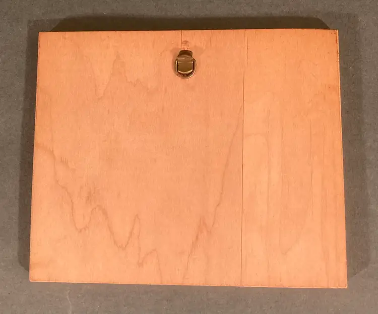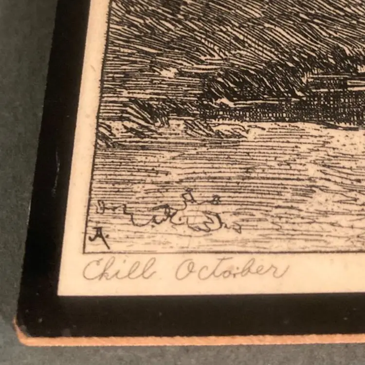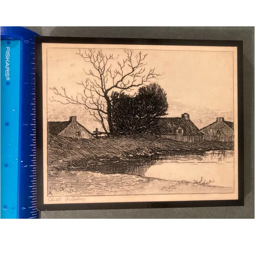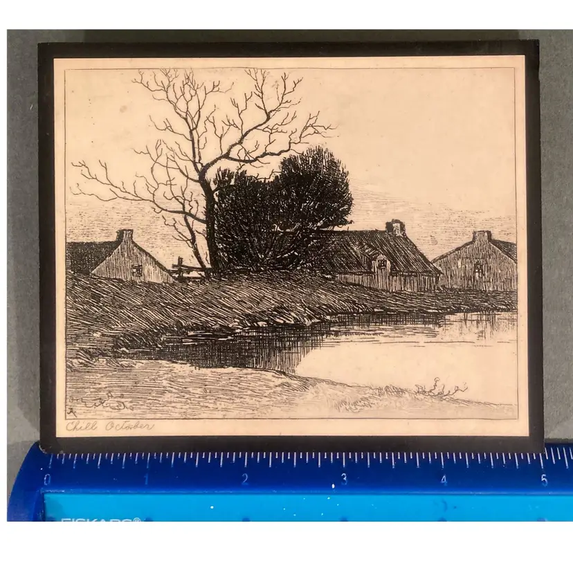 I believe this is a print of an etching. It is titled “Chill October” but is not signed. It is mounted to lightweight wood and has a glossy wipe-clean finish. It’s just 4” high and 5” wide, so it would fit in any little nook or cranny. It is in very good condition. (The back might look cracked but the crack is very shallow.)