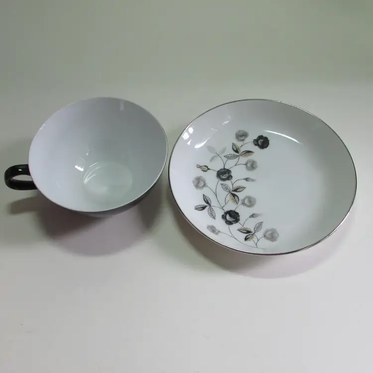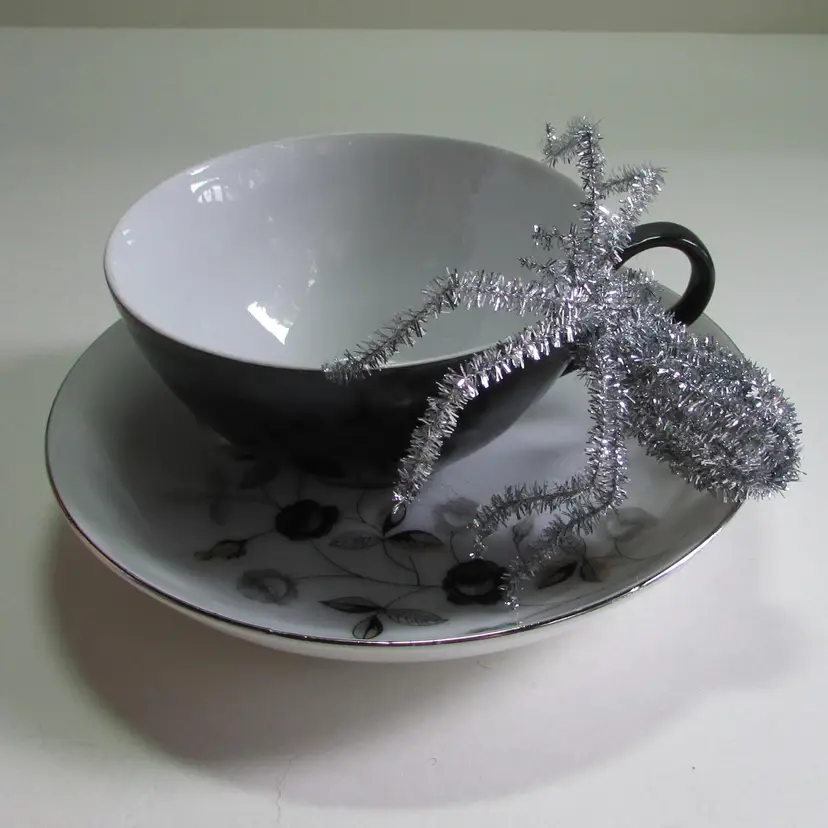 This lovely cup and saucer set has some light wear, but still a nice set to use. I added a pipe cleaner spider, could add some teabags and give as Halloween gift. This is shipped from a smoke free home. Thanks for looking!