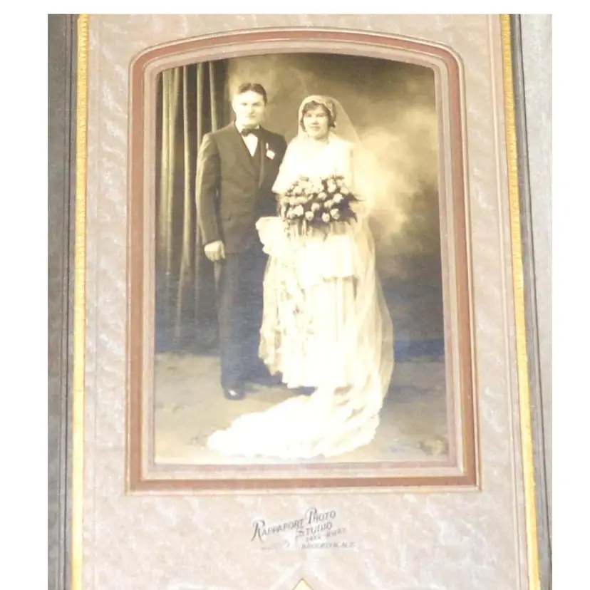 A vintage black and white photo of man and woman in wedding pose. Done by Rapparport Photo Studio Brooklyn NY. Very nice for vintage home decor.