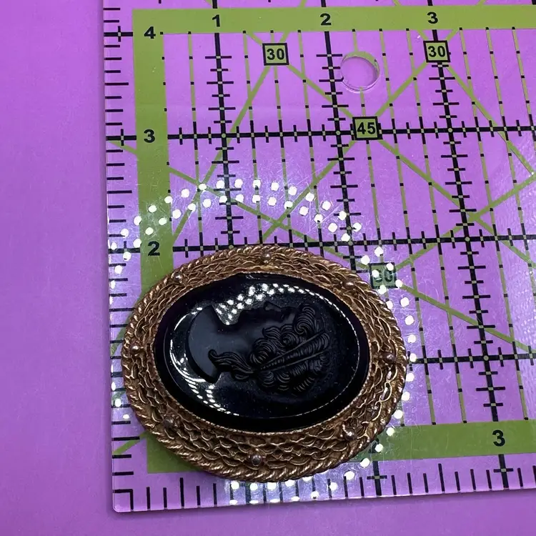 Vintage Black Cameo Style Gold Tone Brooch Left Facing