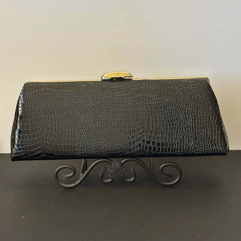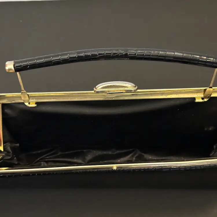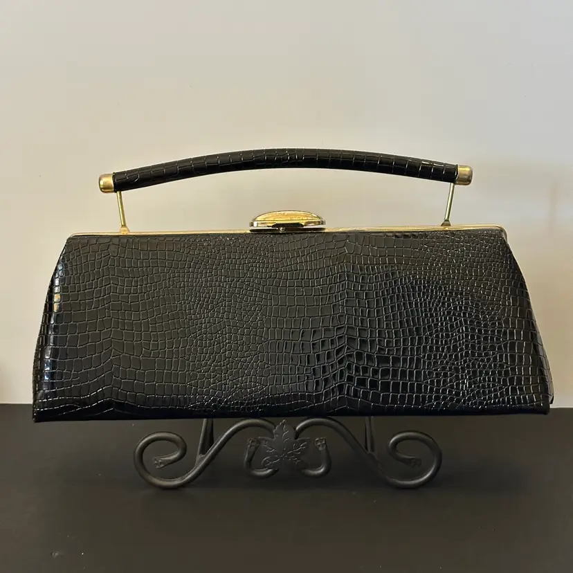 This is a vintage black, croc-embossed top-handle clutch purse, featuring a structured design, a single handle, and a gold-toned clasp.