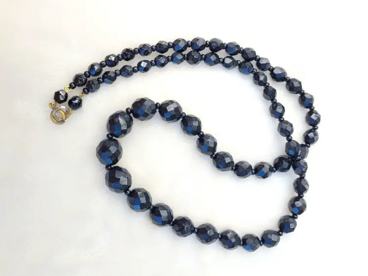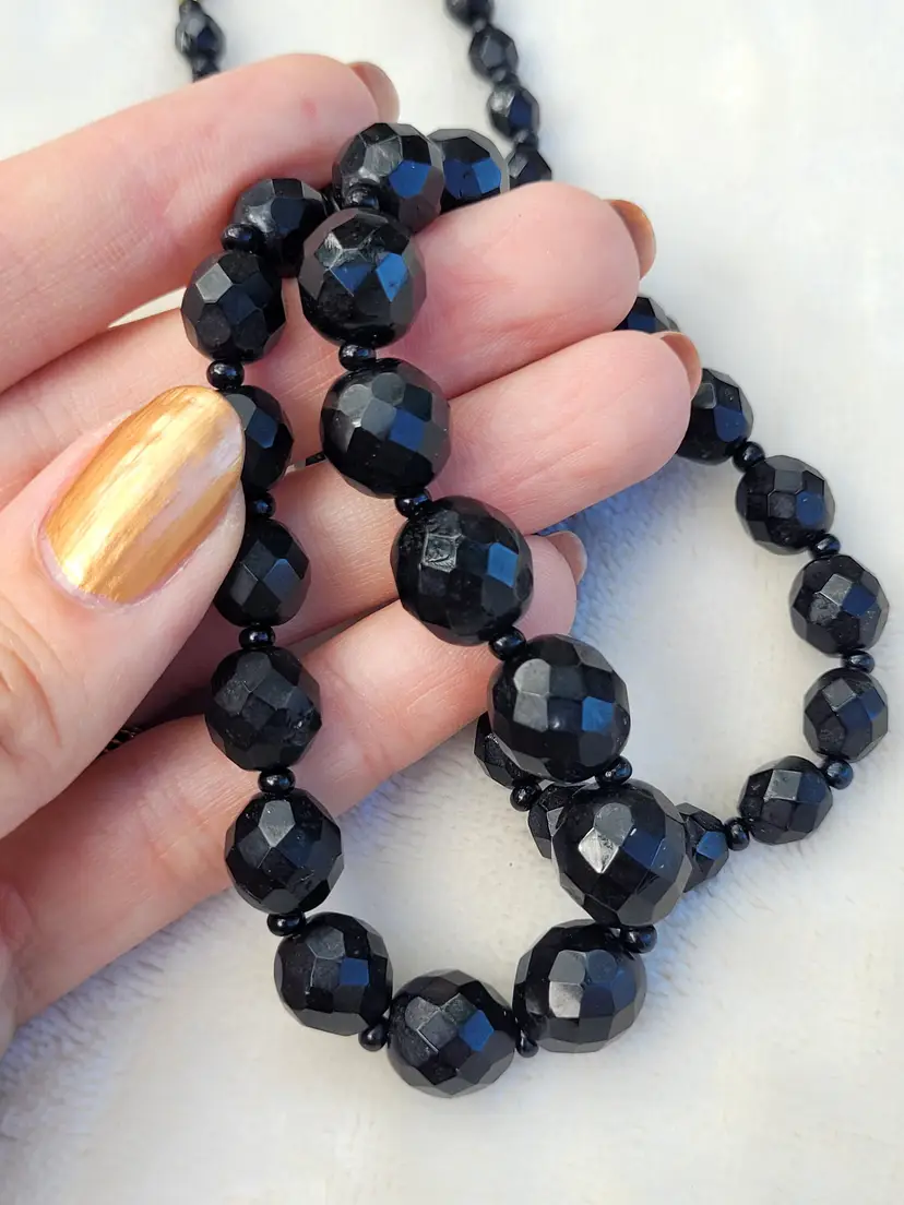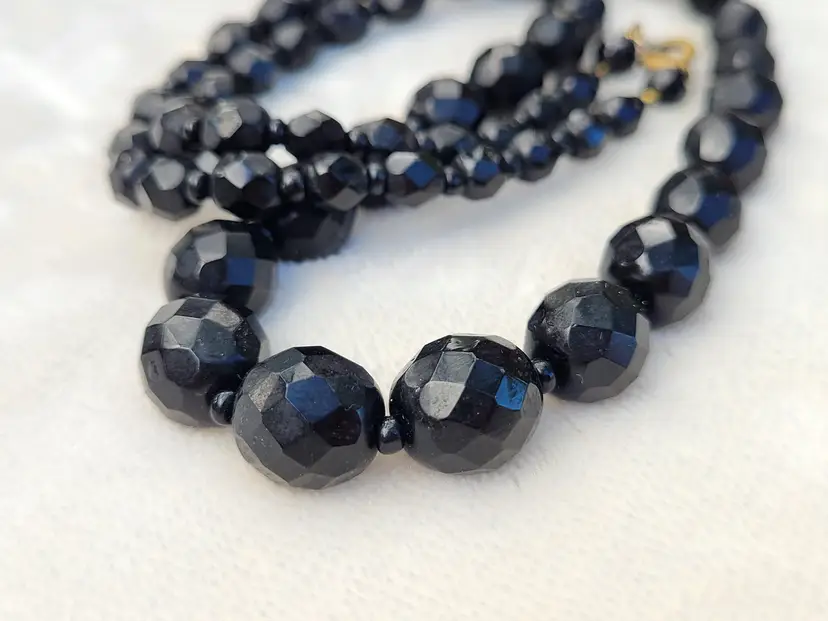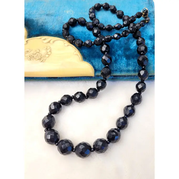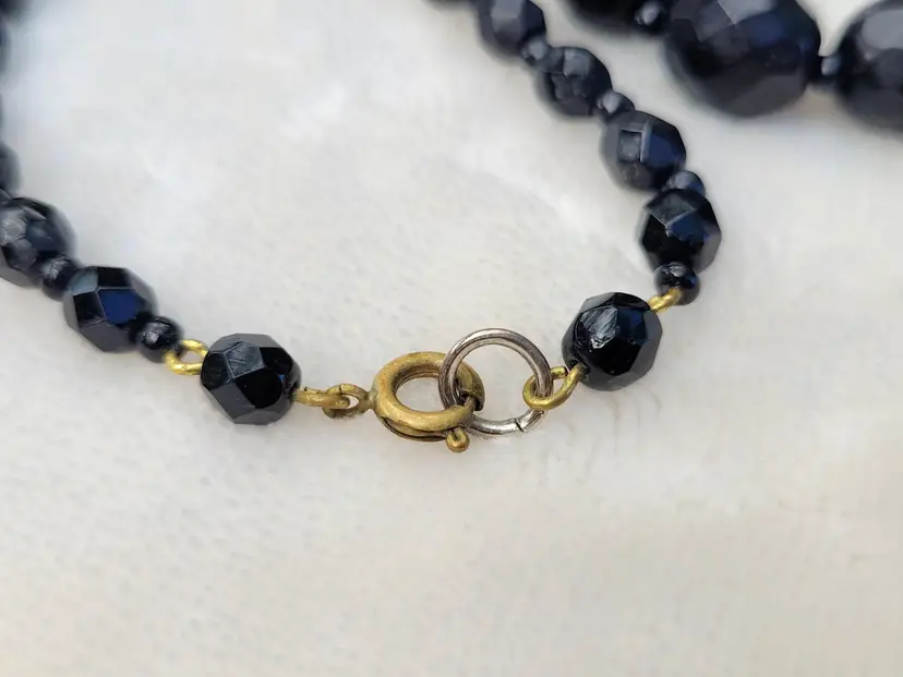 Enchanting original flapper-era 1920s/30s necklace, with heavy black glass faceted beads. It appears the original brass ring was replaced with a silver one at some point (which isn't noticeable when worn), and this is in good condition. Please see pictures for details.