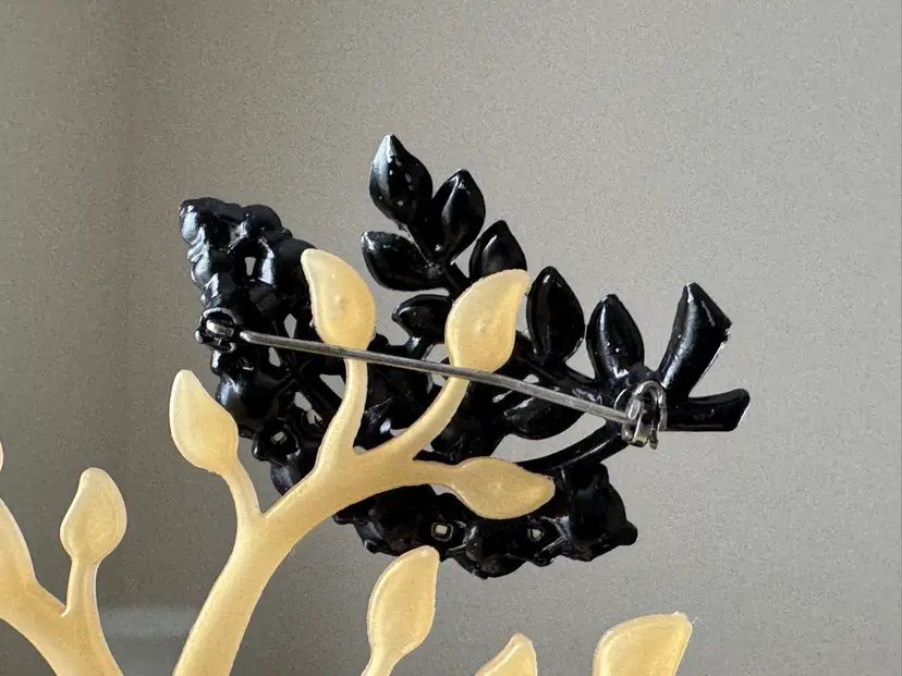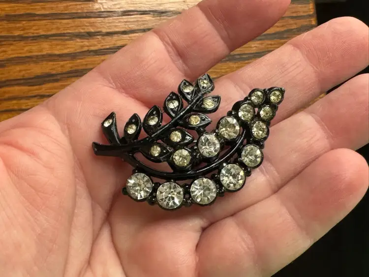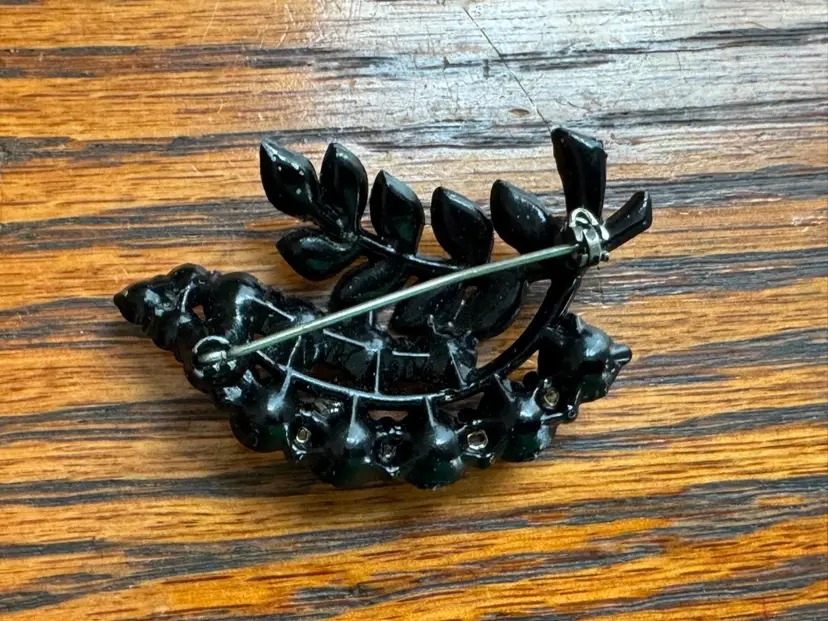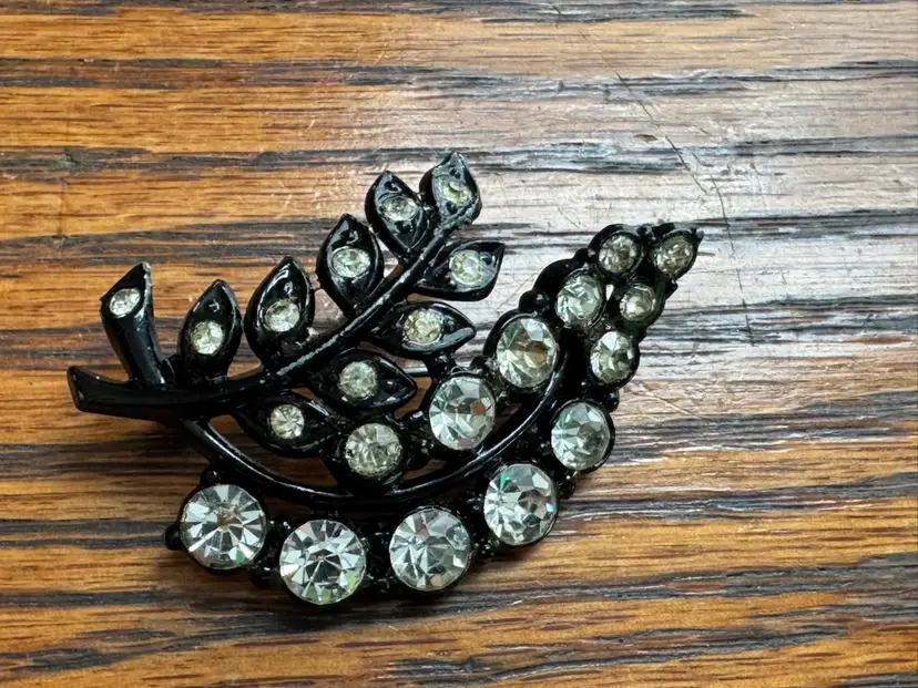 Vintage Black Enamel and Rhinestone Brooch, Japanned