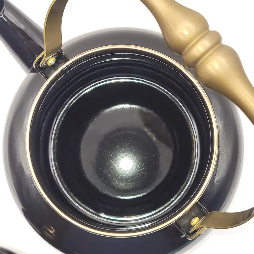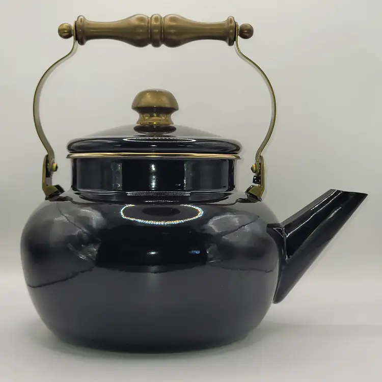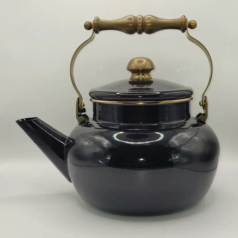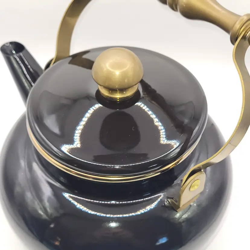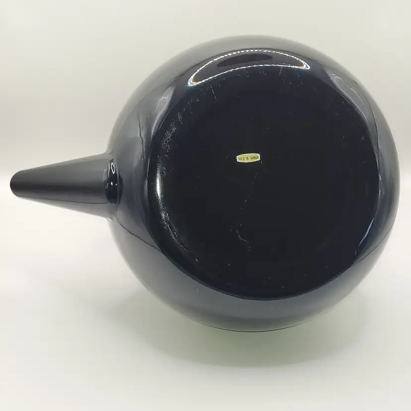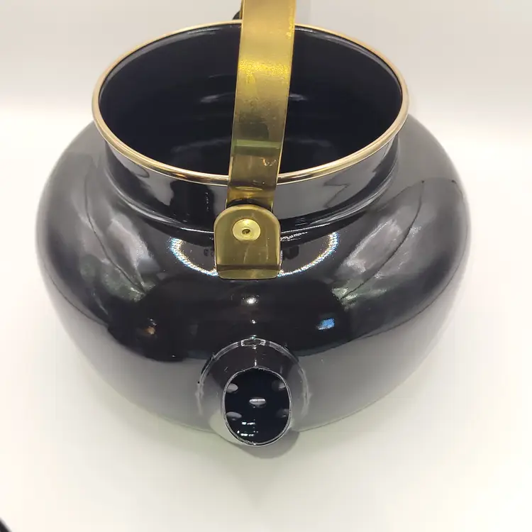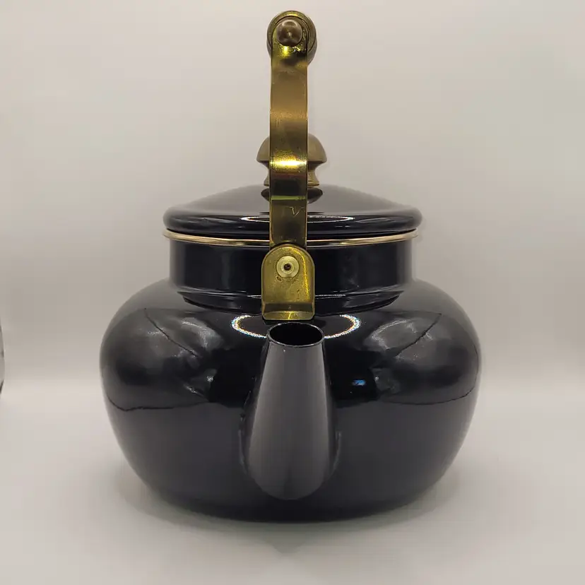 Vintage Black Enamel Teapot with Brass Handle & brass Lid Knob. There is a beautiful accent on the rim also. Made in Taiwan. This Kettle is very clean and in excellent condition. There is one flaw, as seen in photos, which is some chipped enamel on the inside rim of the lid.