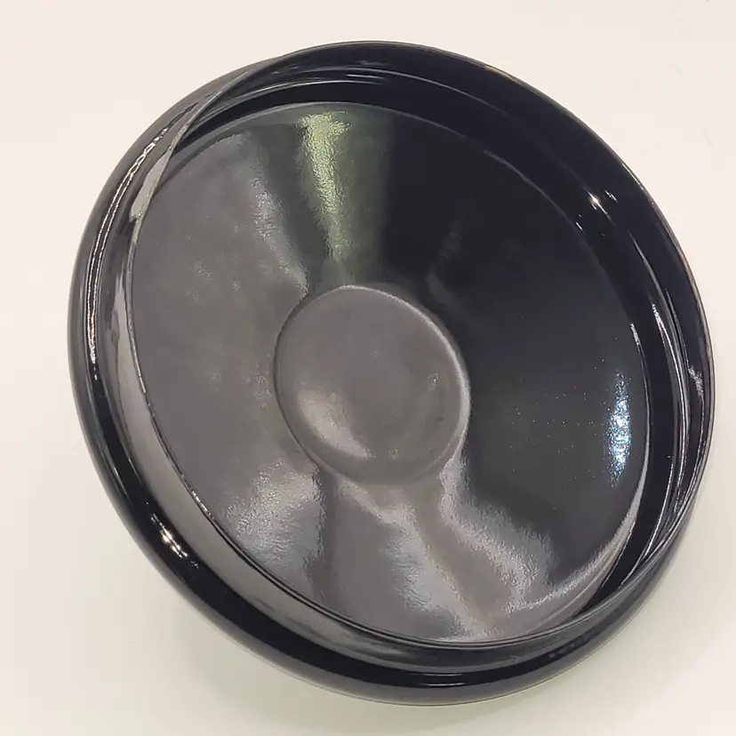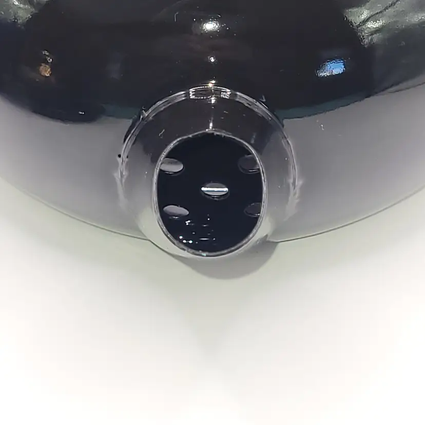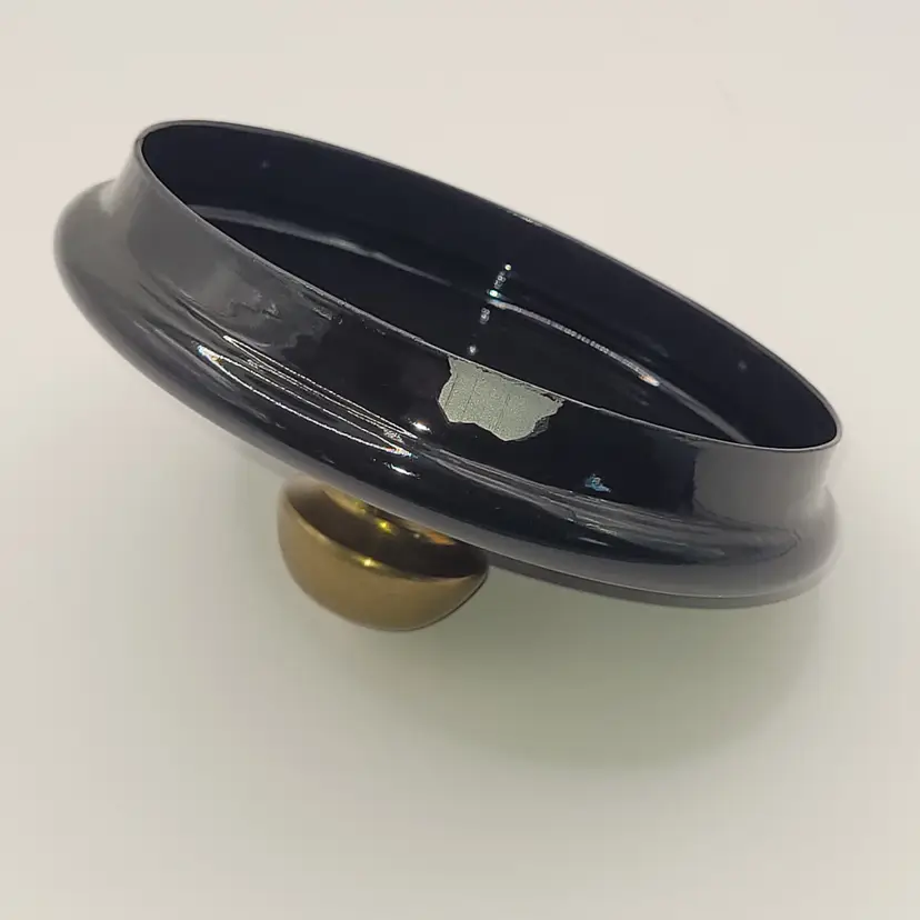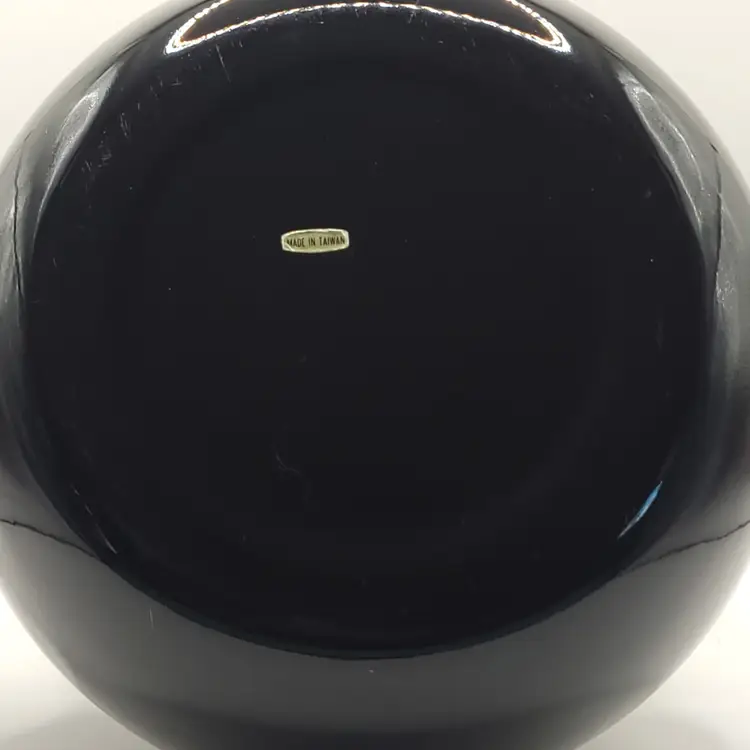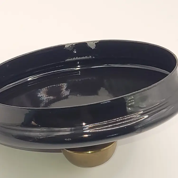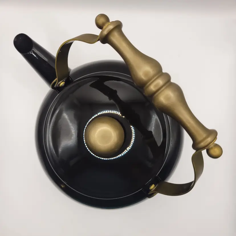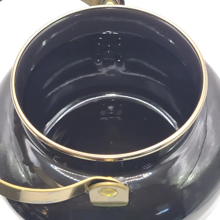 Vintage Black Enamel Teapot with Brass Handle & brass Lid Knob. There is a beautiful accent on the rim also. Made in Taiwan. This Kettle is very clean and in excellent condition. There is one flaw, as seen in photos, which is some chipped enamel on the inside rim of the lid.
