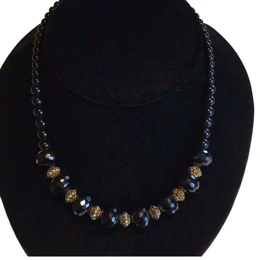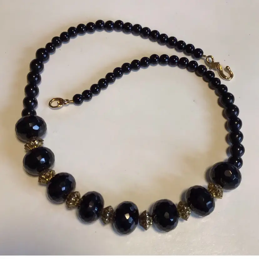 Faceted & smooth beads with brass accents, 18”. #696