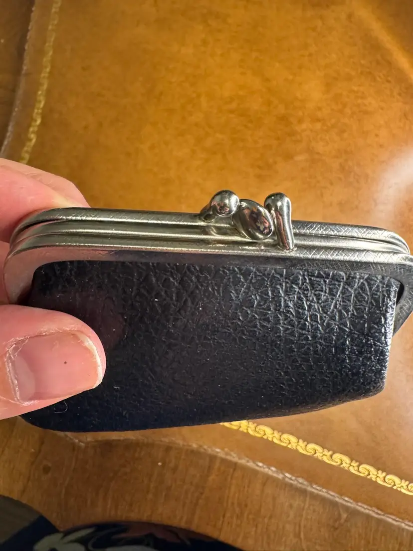 Vintage black leather kiss lock coin purse with 2 compartments 4” w 3” t