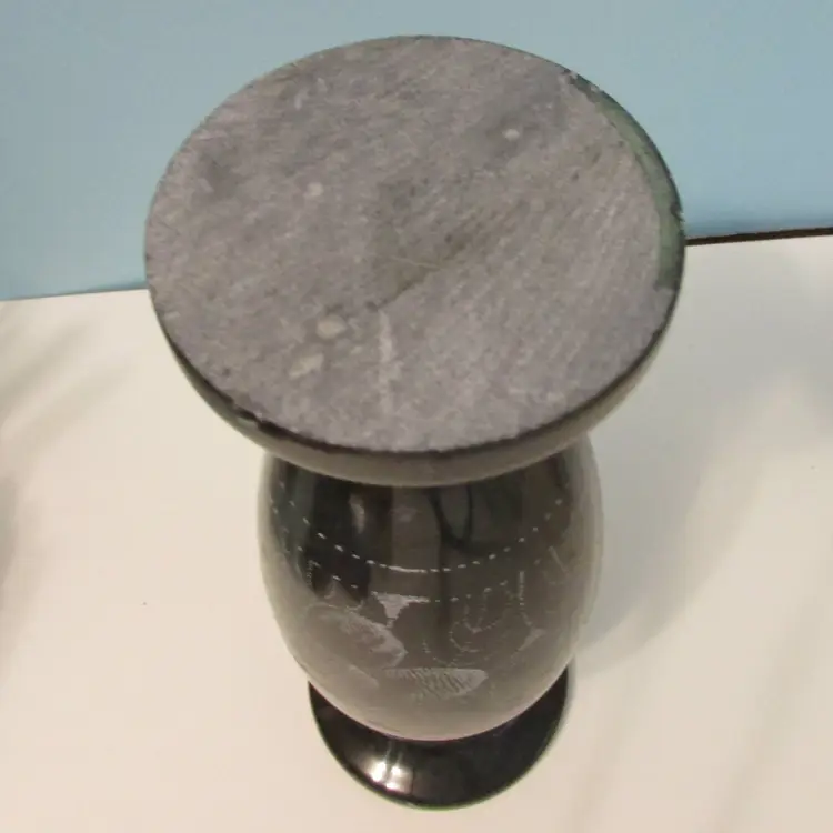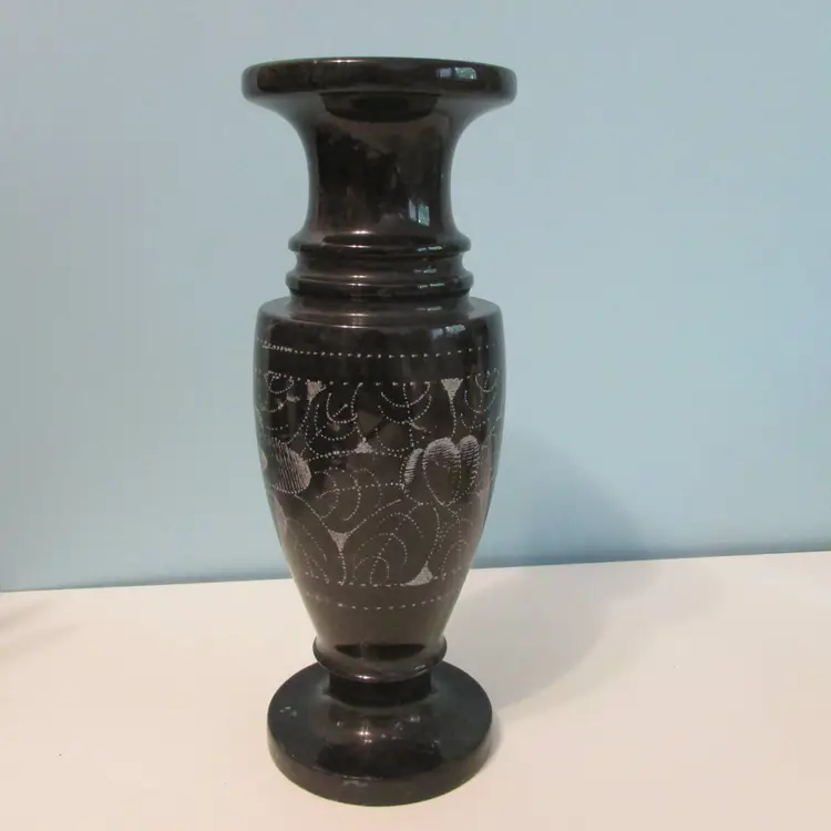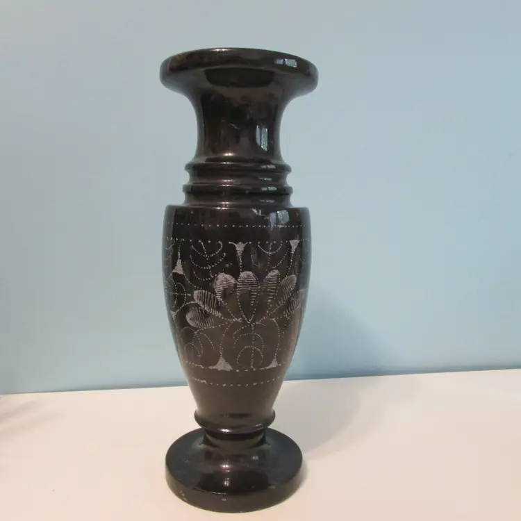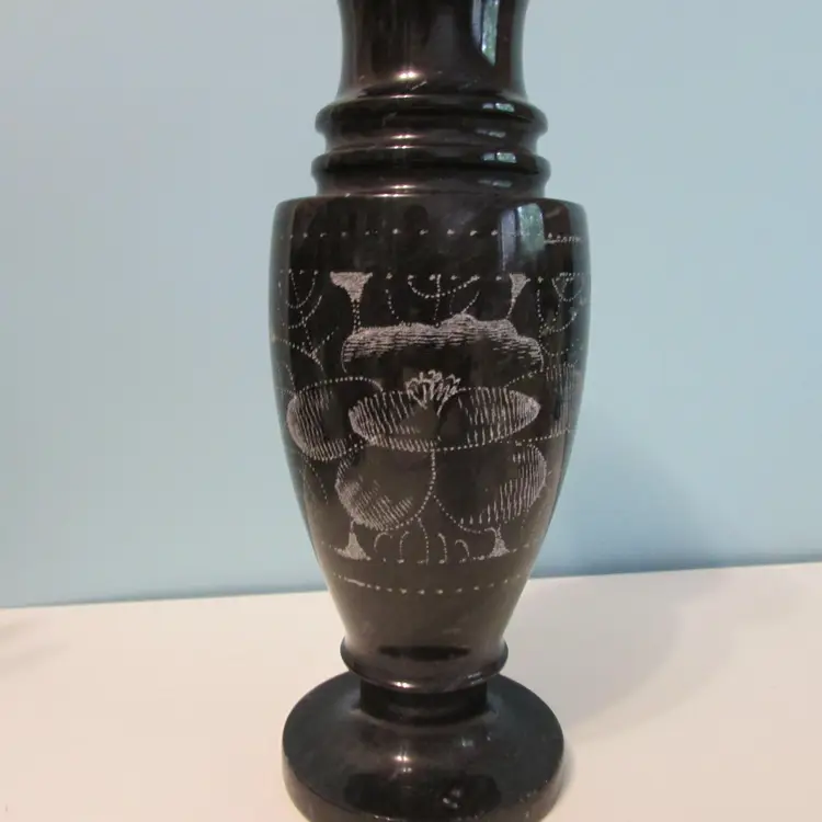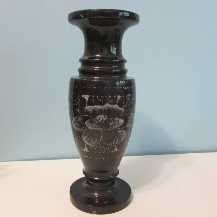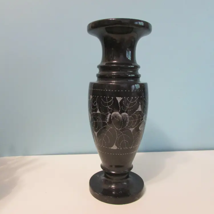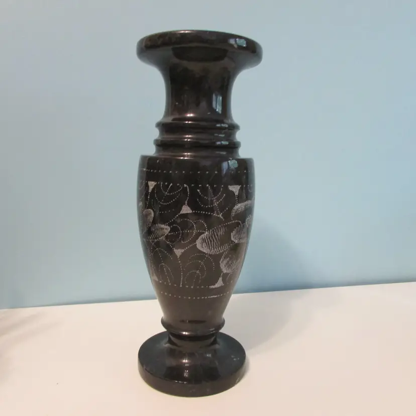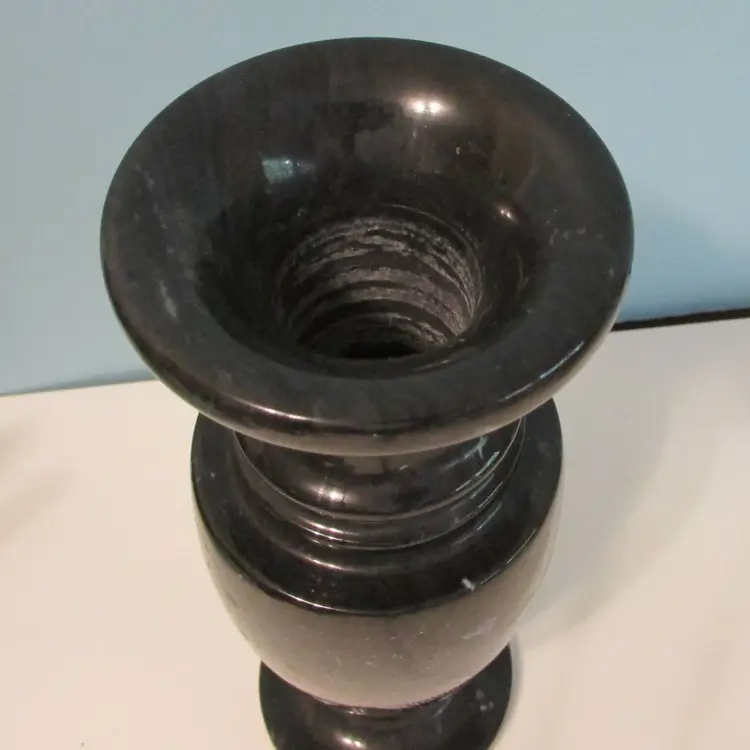 This beautiful vase has some wear, but still a lovely piece to use and display. This is a marble vase so it is heavy (weighs about 2 1/2lbs), it is about 8" tall.