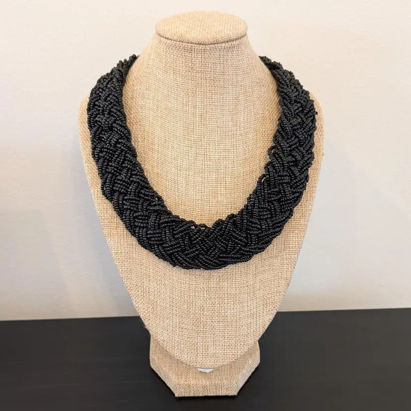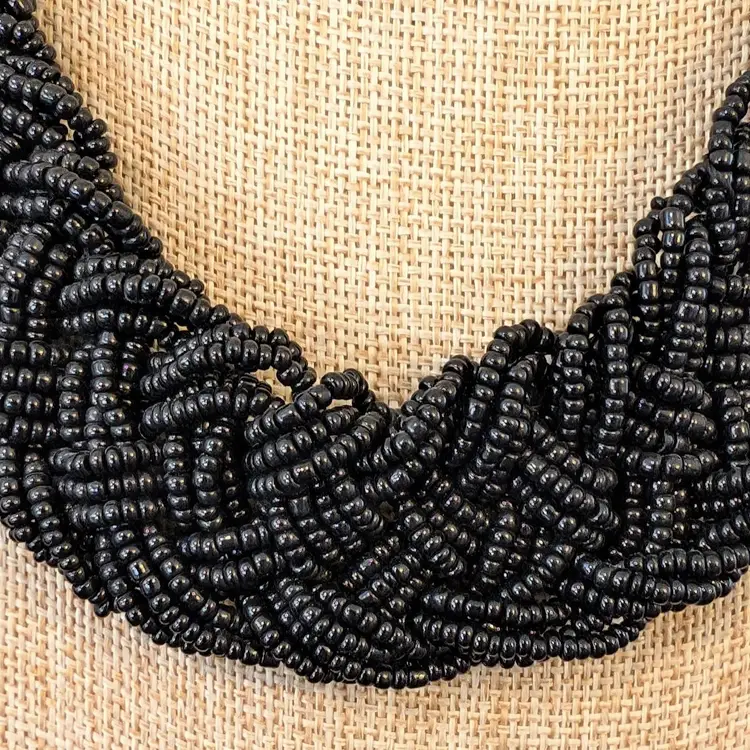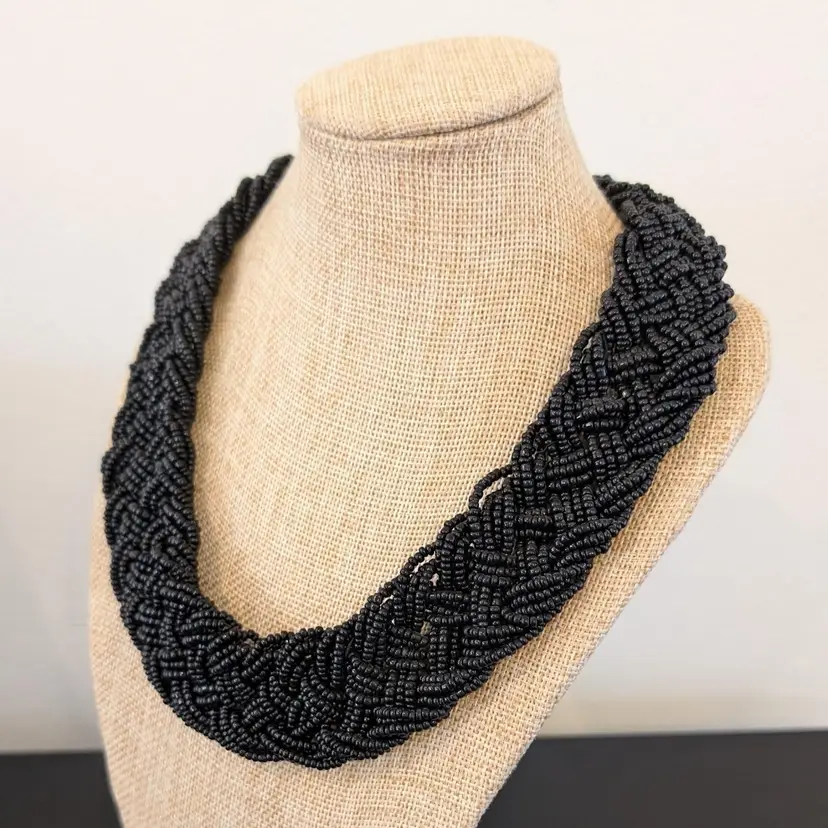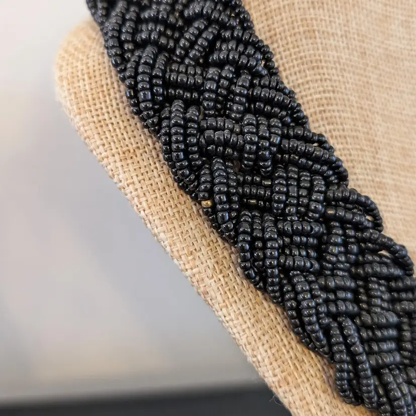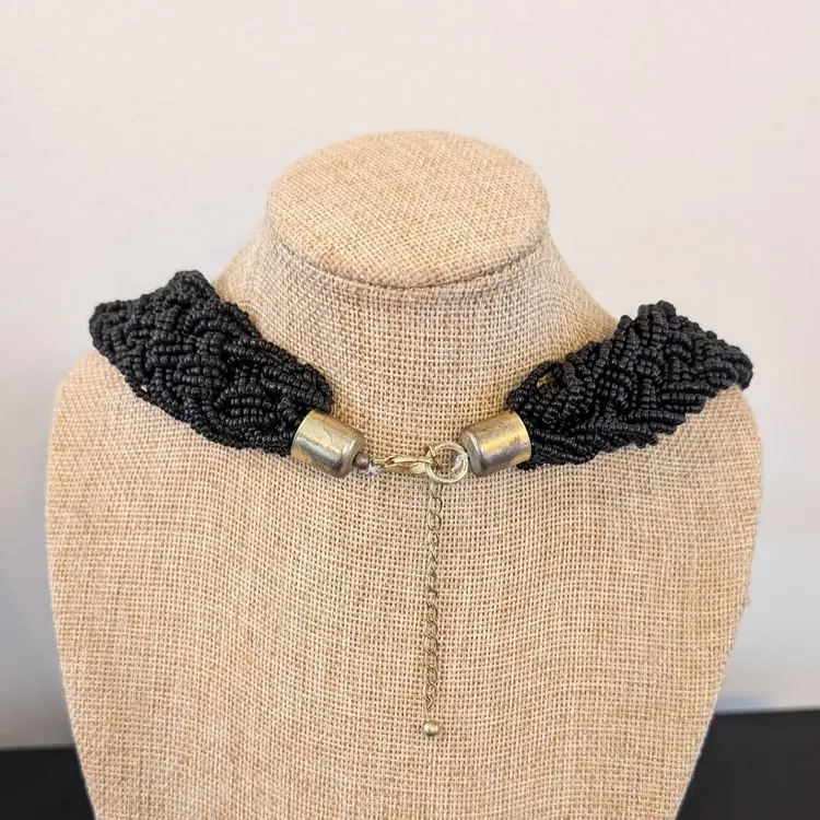 Nice, heavy collar necklace with a 4 way braid of 4 strands of black seed beads. In nice used condition with a little tarnish on the metal and one gold bead mixed in.