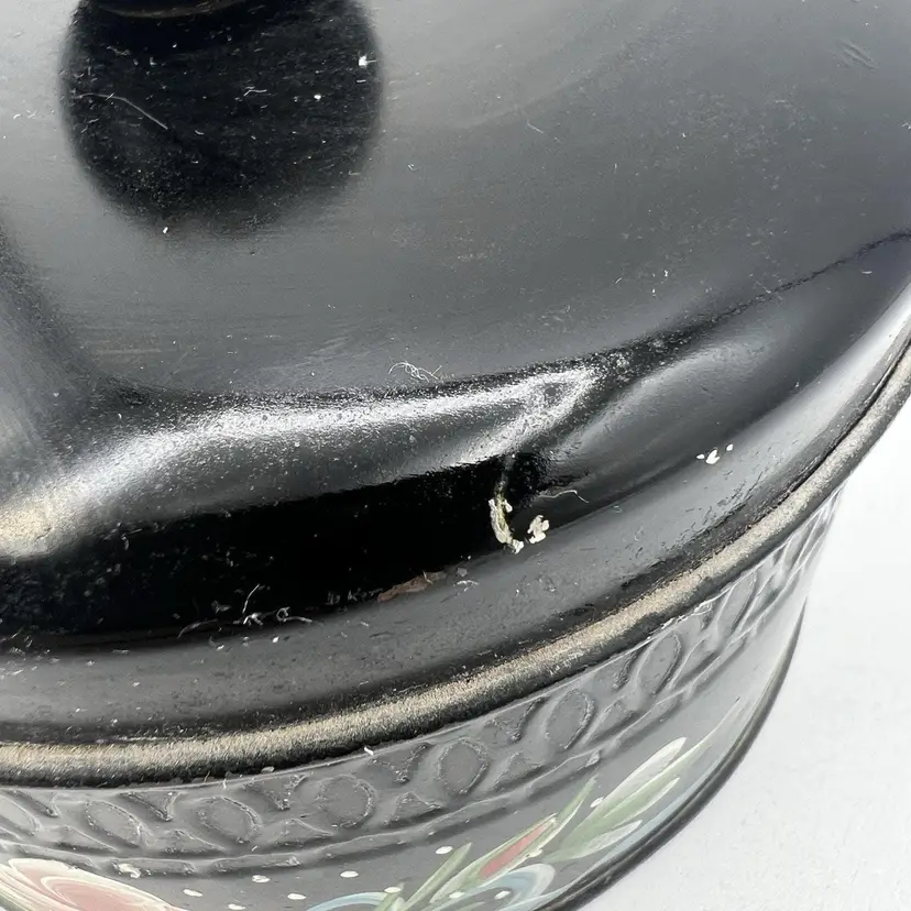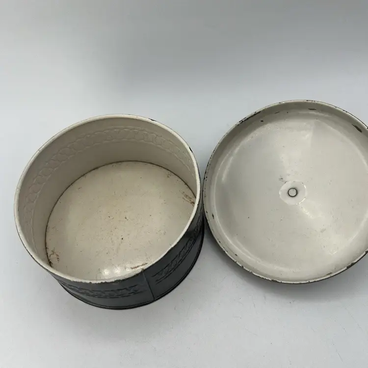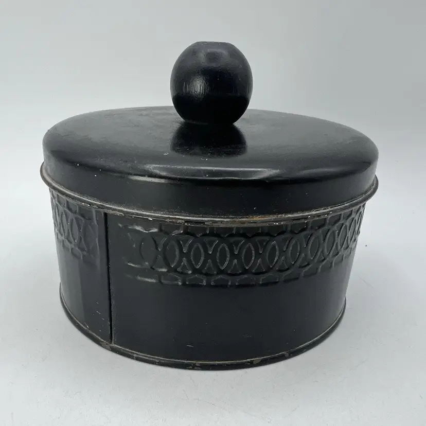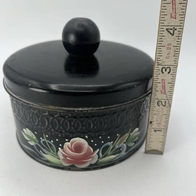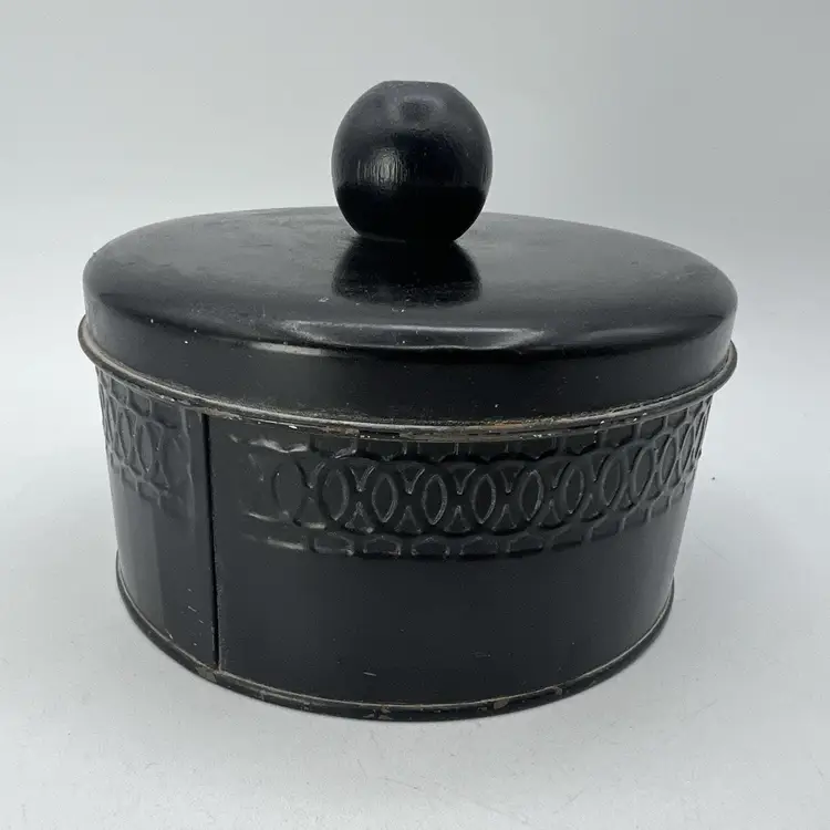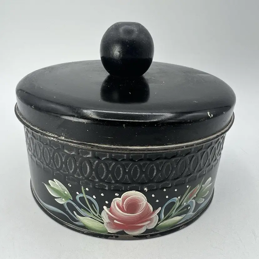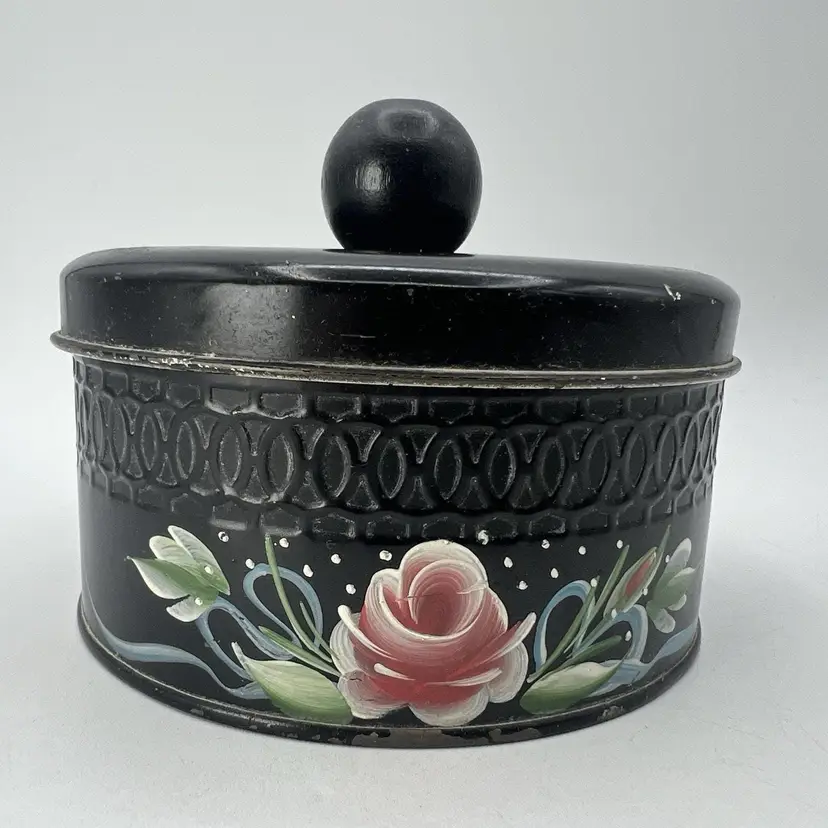 Vintage Black Pink Hand Tole Painted 5" Vanity Powder Tin 1940s Candy Tin