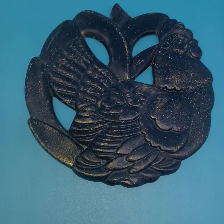 Vintage black Pottery rooster trivet or could also be used as a wall hanging this 5 1/2 inch round trivet is in good vintage condition no chips or cracks does have slight paint wear and a little bit of a manufacturer sticker on the back please see all pictures as they are the best description all items from a smoke-free home with pets experienced fragile shipper This piece of pottery has a very nice feel to it will be a wonderful addition to your chicken rooster collection