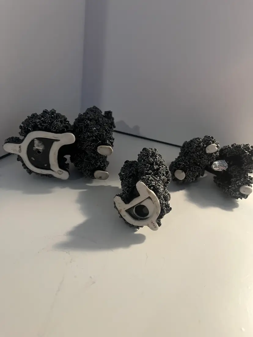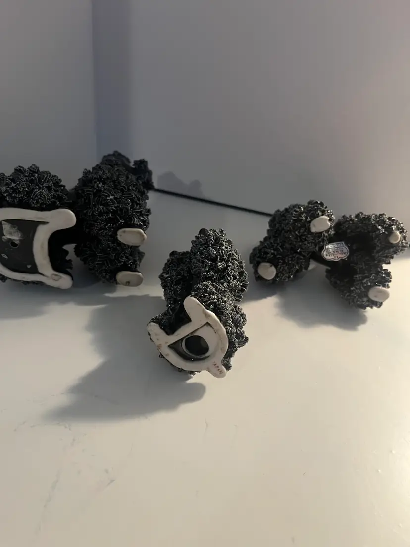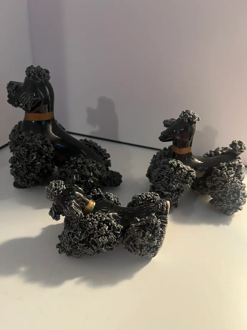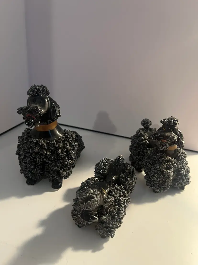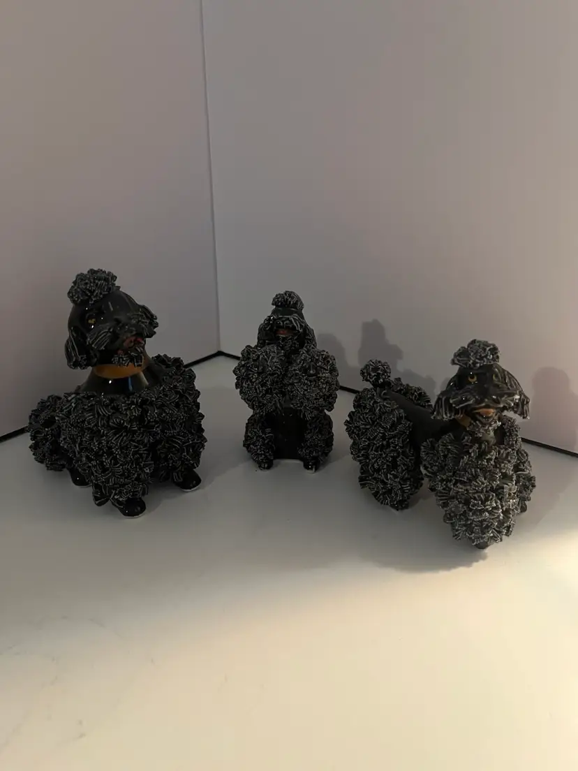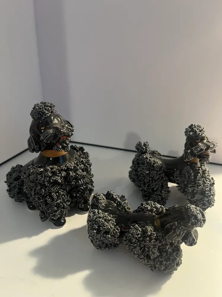 Set of 3 vintage black spaghetti poodles. Each are 3” tall with a few flea chips, otherwise in very good condition.