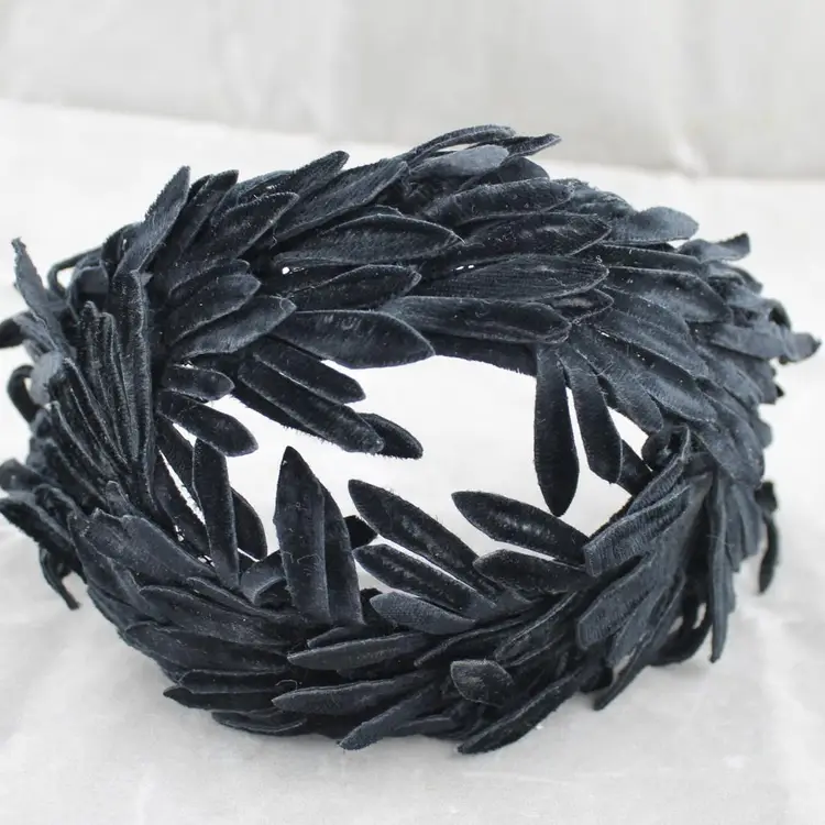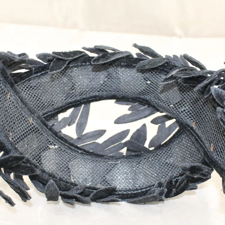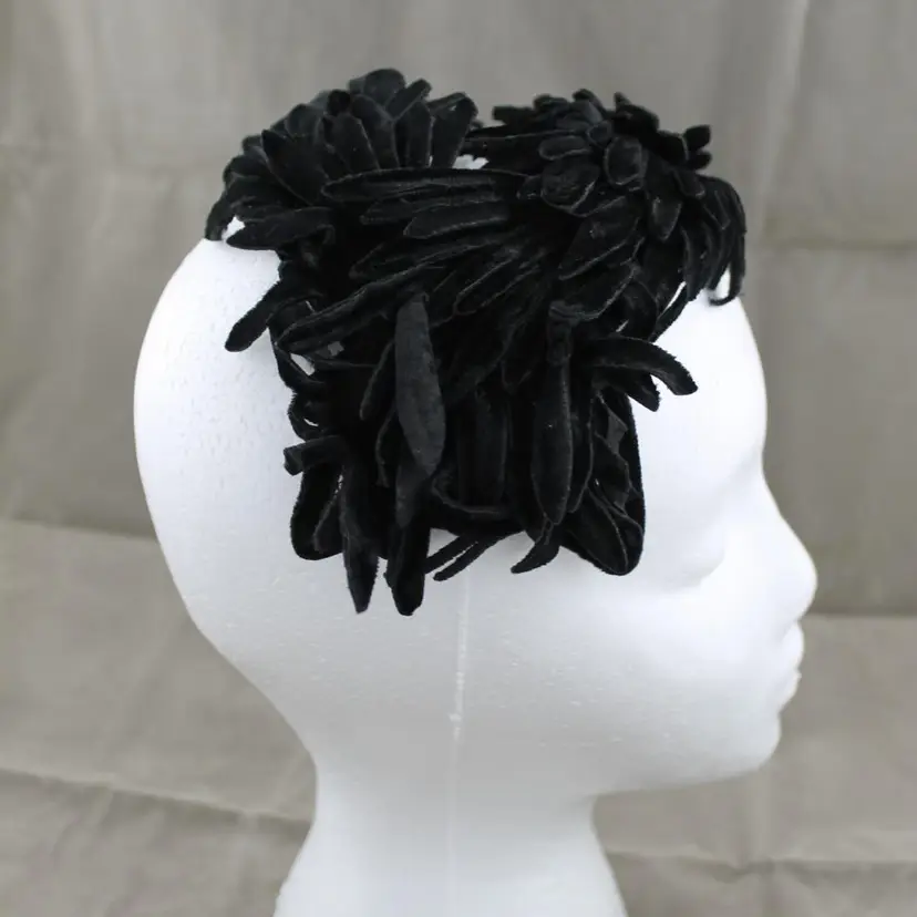 This is a vintage black velvet hat or headband. It looks like feathers but is a velvet like material. It is good shape with no rips, hole, stains or odors. My home is smoke free, but I can not speak for where it came from.